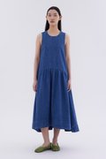 Statement proportions. Made from softly structured and non-sheer cotton denim, this sleeveless maxi dress features a round neckline, a dropped waist and a back opening with two tie-strap closures. Worn in a relaxed fit.