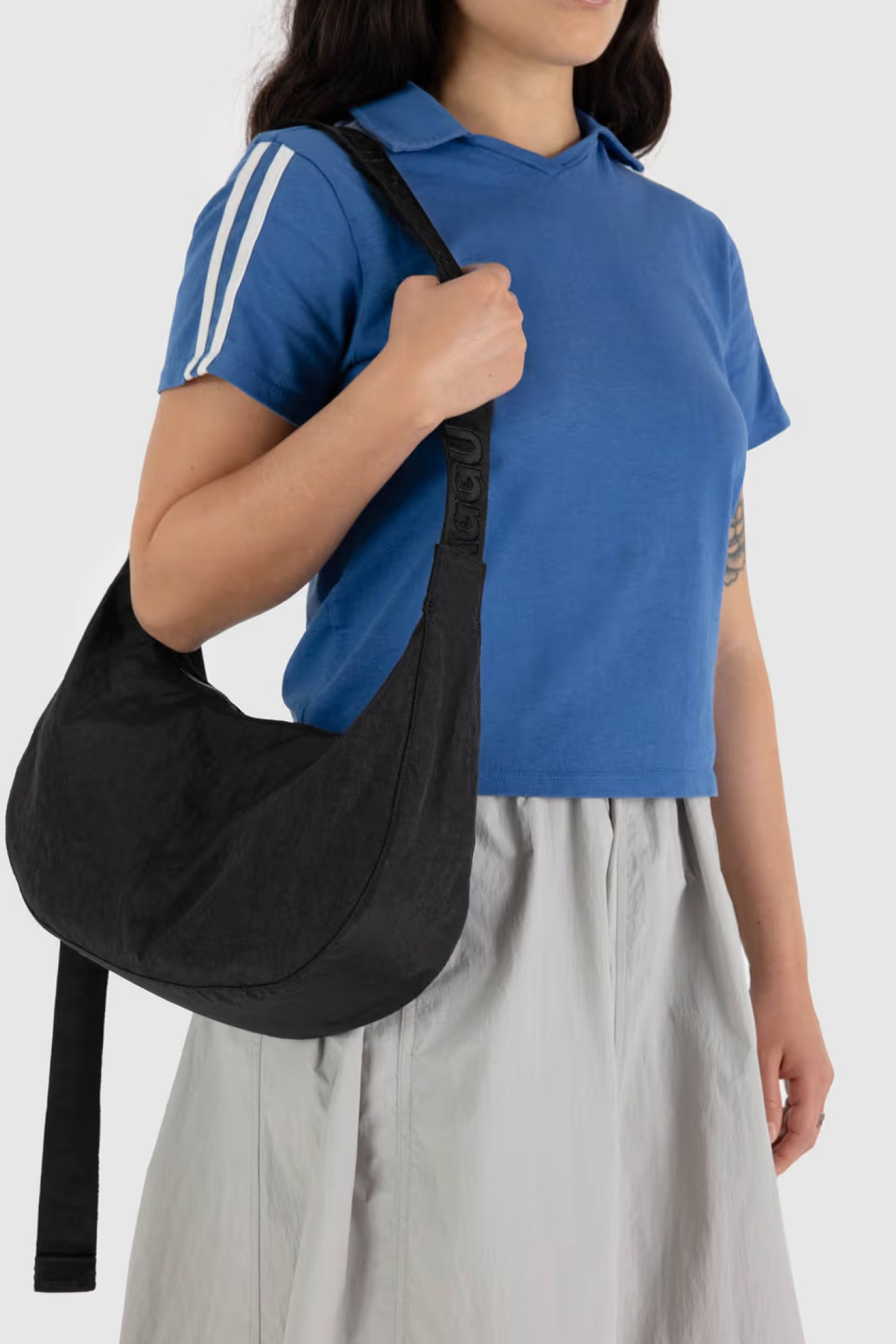 Practical doesn’t have to be boring. Made from recycled heavyweight nylon with a recycled ripstop nylon lining, the Medium Nylon Crescent Bag is effortlessly casual and large enough to carry more than just the essentials. Wear it slung over your shoulder or across the body for a hands-free experience. Also features an adjustable logo strap and two interior pockets for easy organisation.
