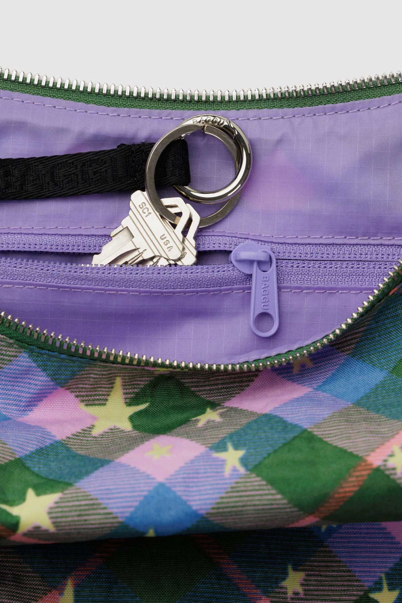 Made from recycled heavyweight nylon lined with recycled ripstop nylon, this mid-sized crescent bag is effortlessly casual and large enough to carry more than just the essentials. Organisation also comes easy with two inner pockets, plus a black logo key leash with a metal carabiner. An adjustable logo strap lets you wear it slung over your shoulder or crossbody for a hands-free experience.