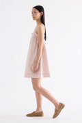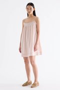 Cooler picks. Made from crisp and softly structured cotton, this sleeveless dress features an empire silhouette with slim adjustable shoulder straps, a frill-trimmed neckline, a pleated bust and lace detailing. Fits above the knee with a side zip closure.