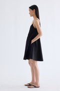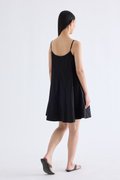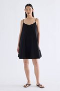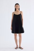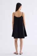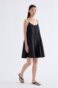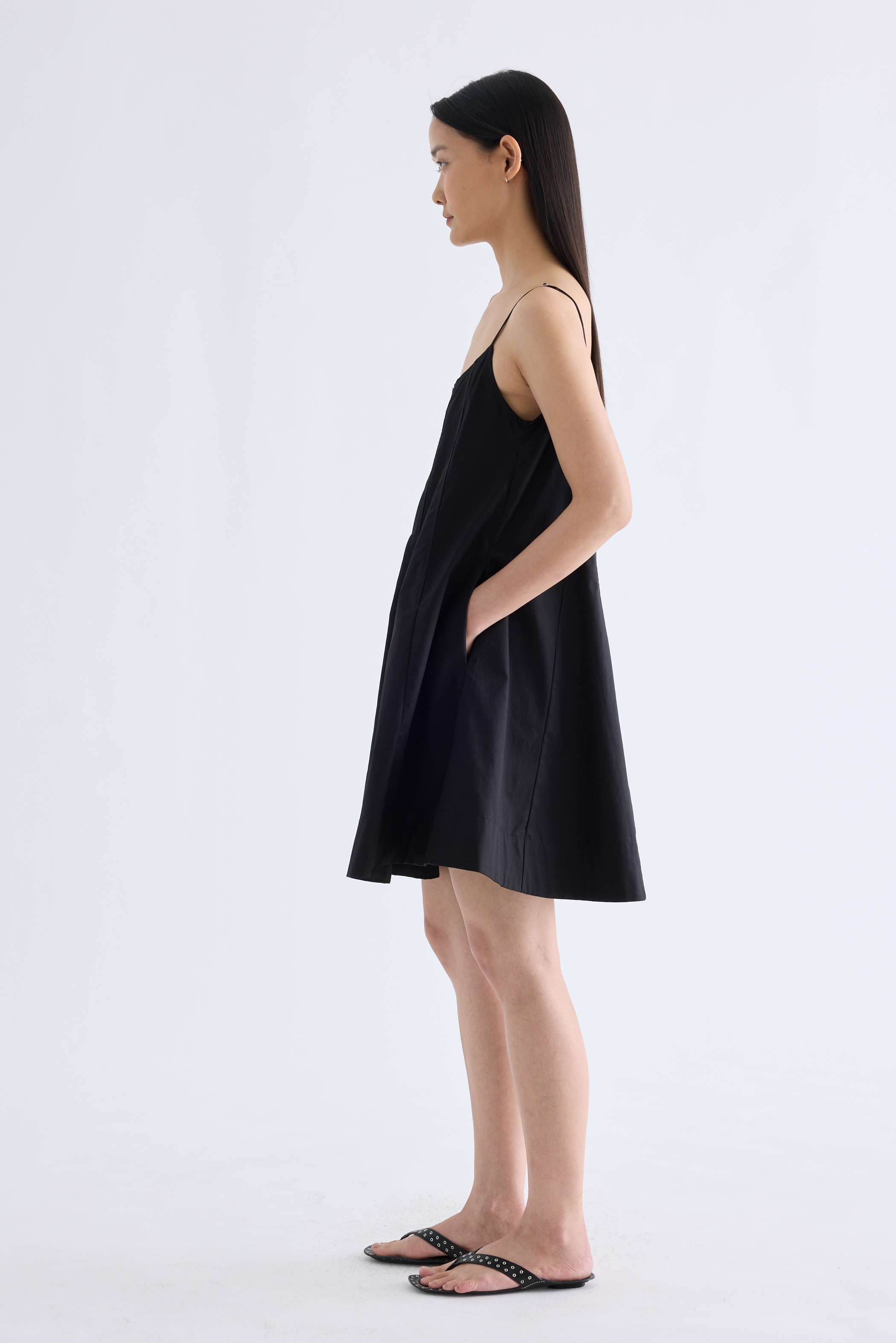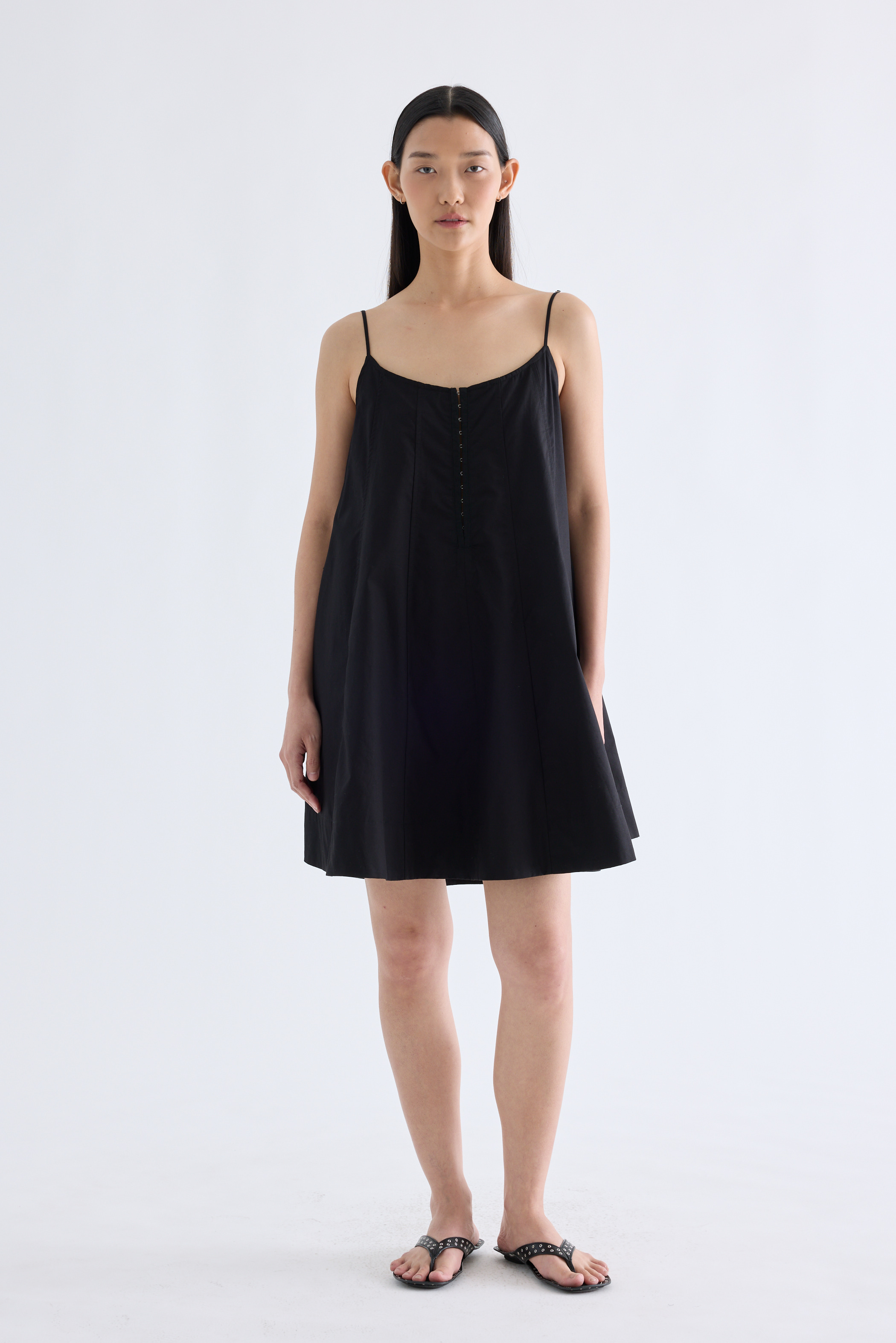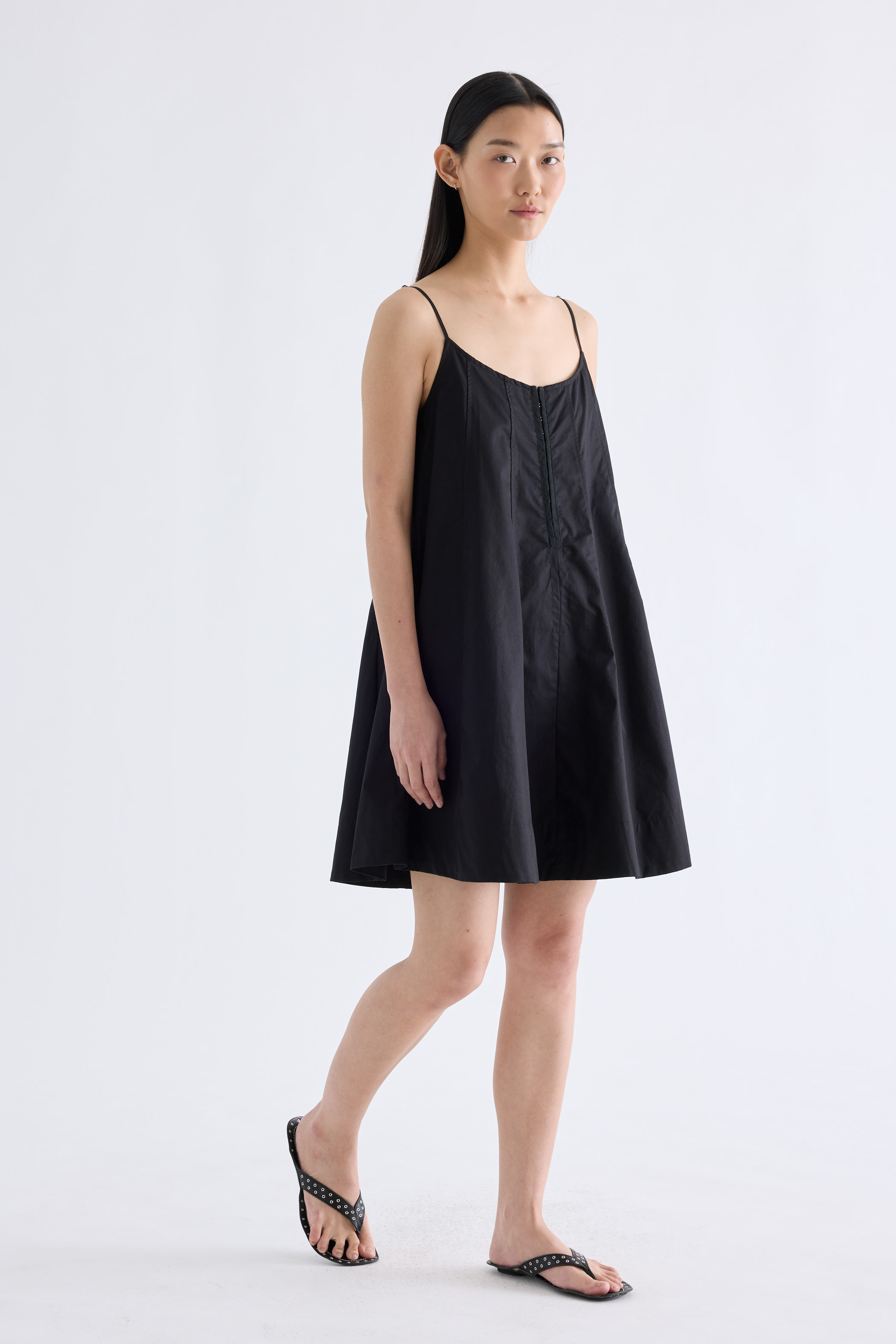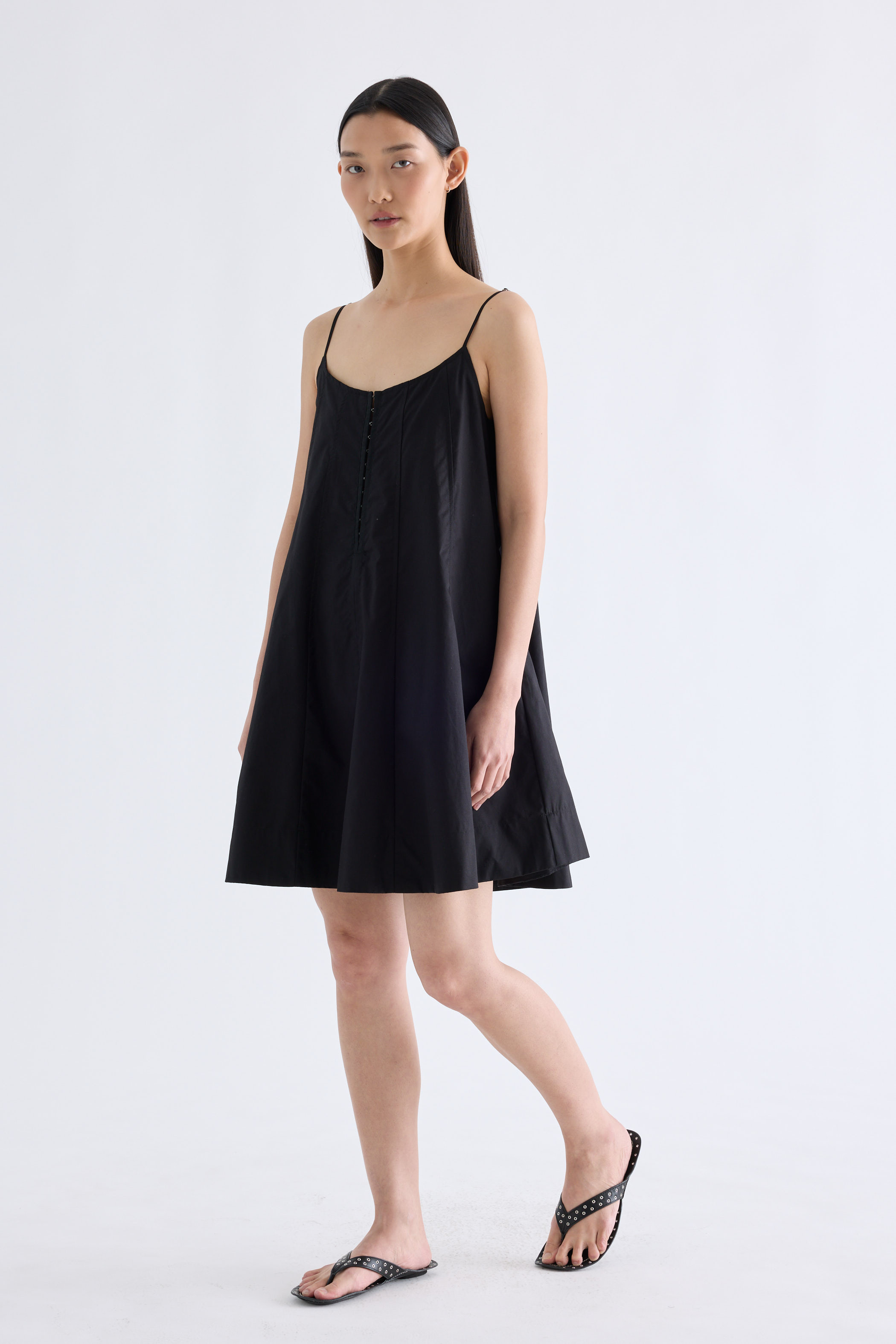 Go with the flow. Made from crisp and softly structured cotton, this sleeveless dress features a flared, panelled silhouette with front hook-and-eye closures, slim adjustable shoulder straps, a straight neckline and a back zip closure. Fits relaxed and above the knee.