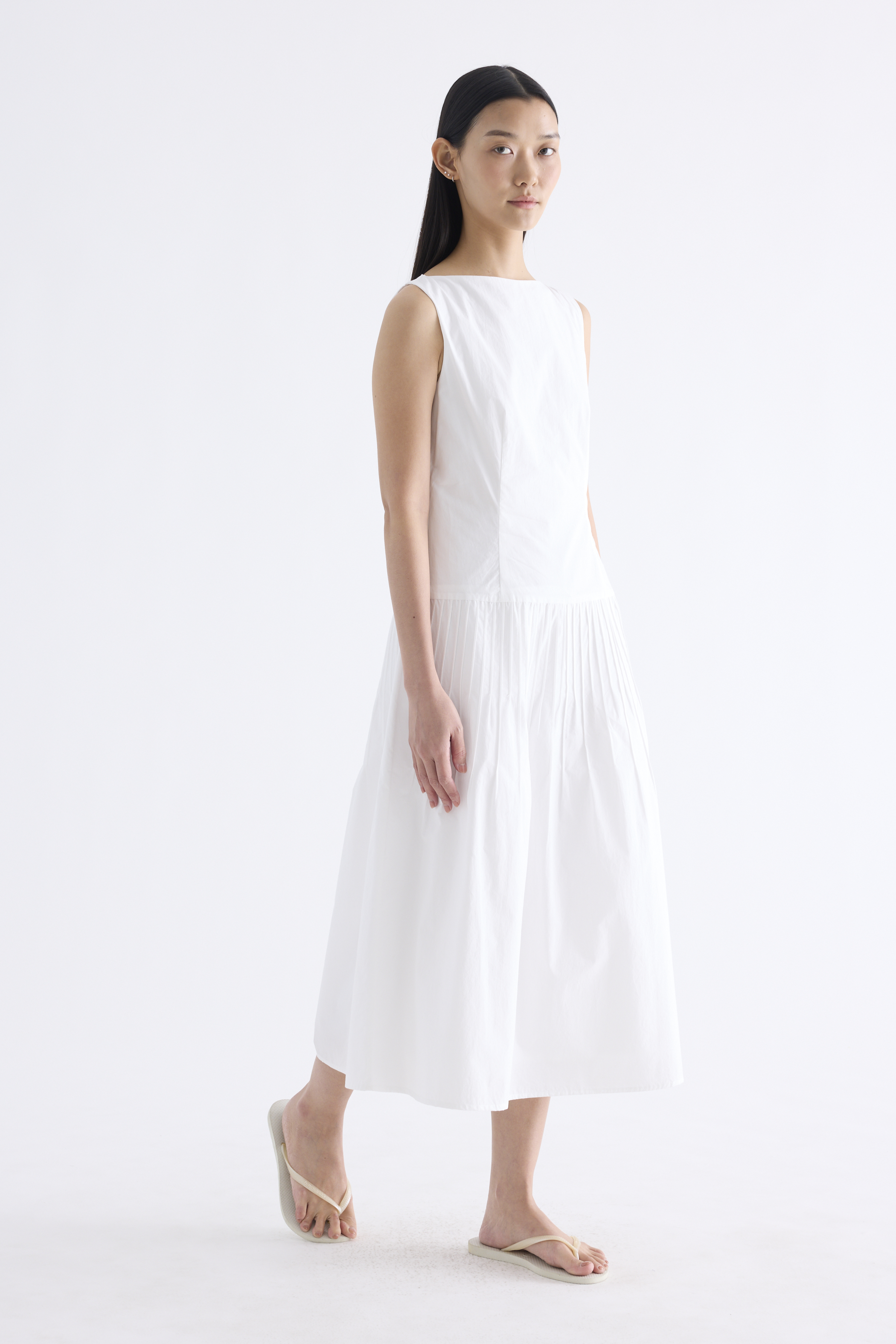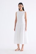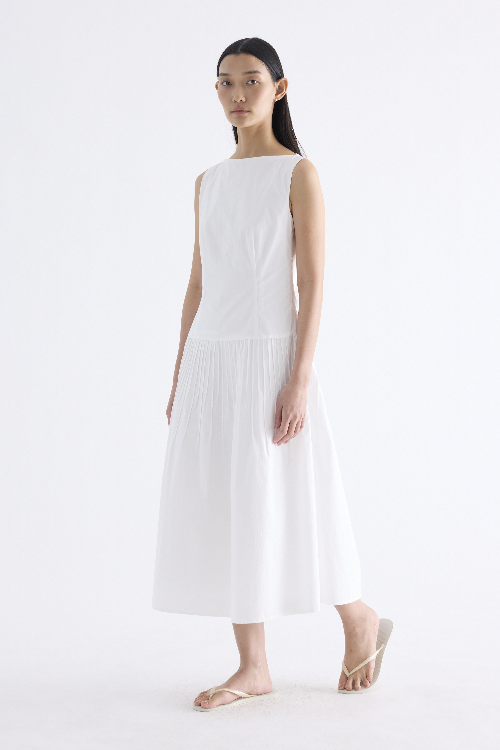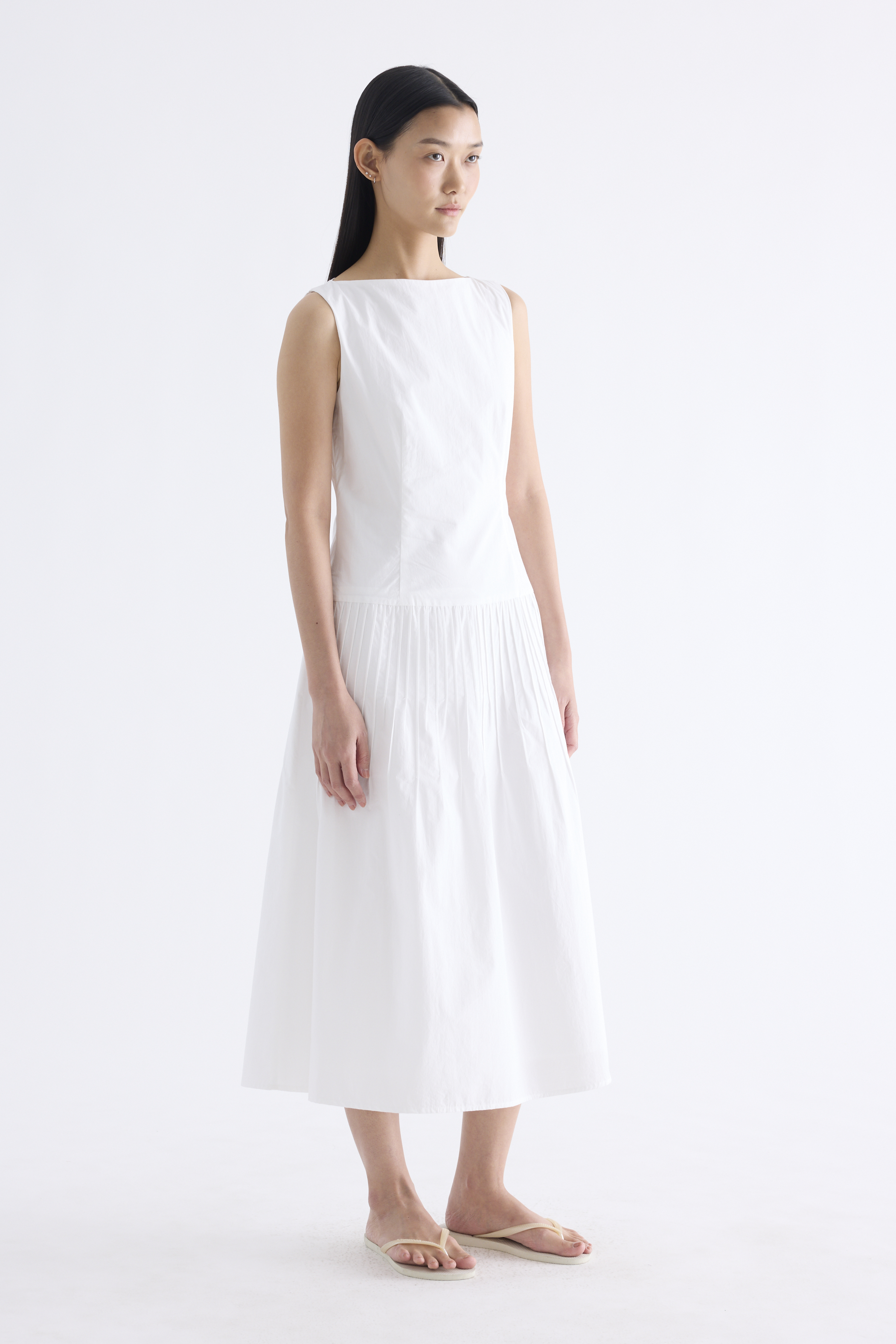 Textured. Made from crisp and softly structured cotton, this sleeveless maxi dress features a boat neckline, pleated waist, side zip and buttoned keyhole opening at the back. Worn in an A-line silhouette that fits slimmer at the waist.