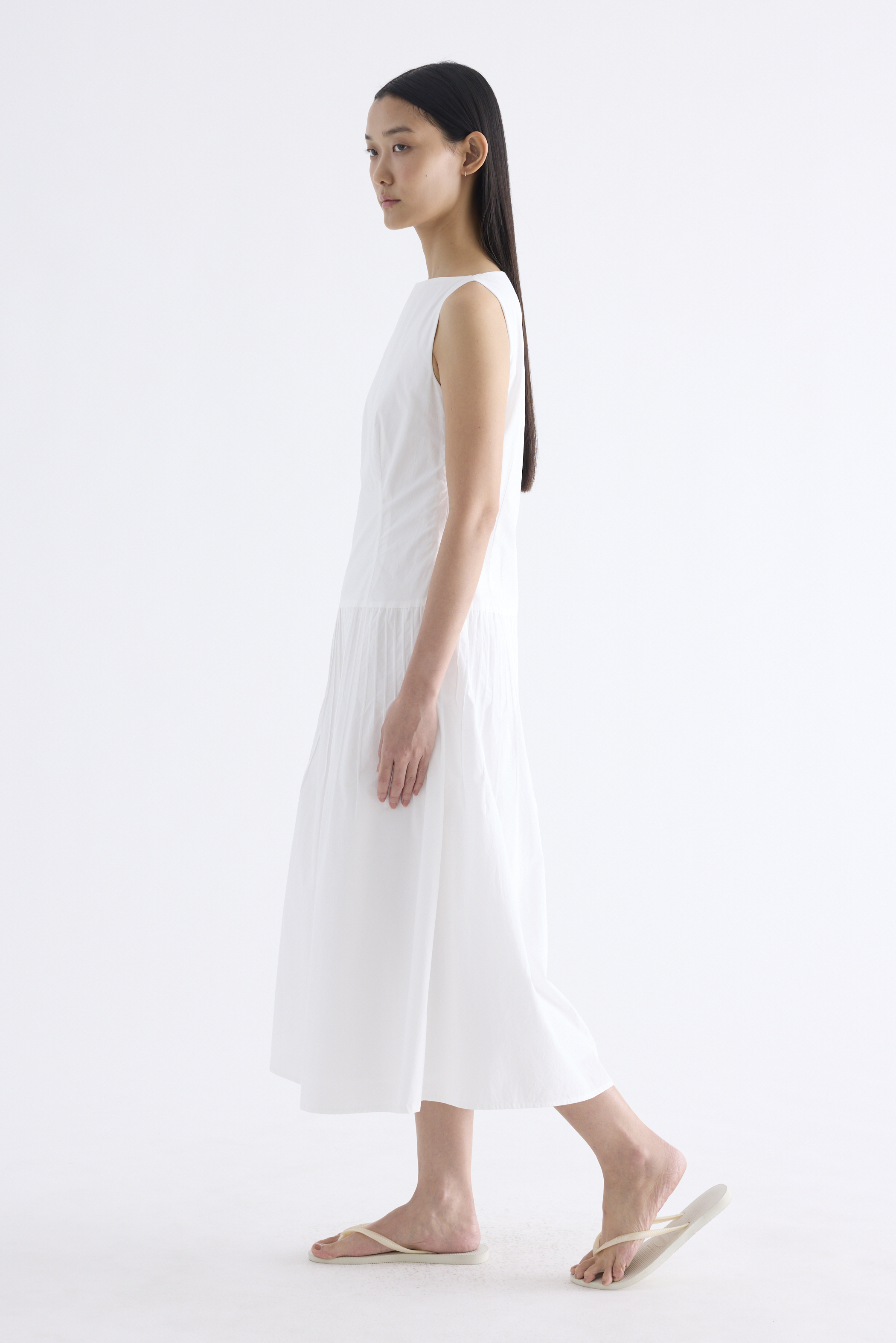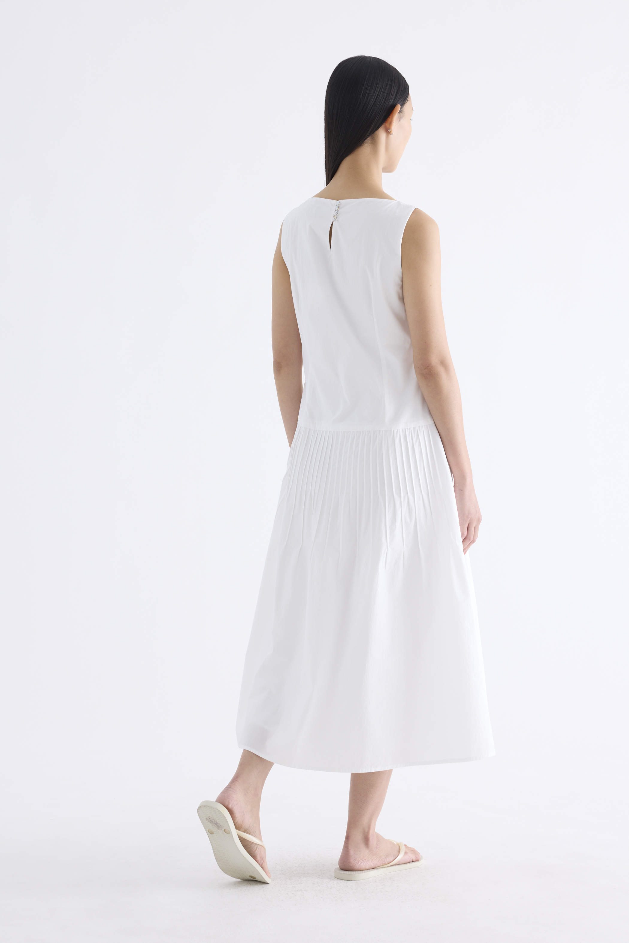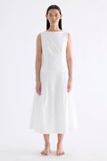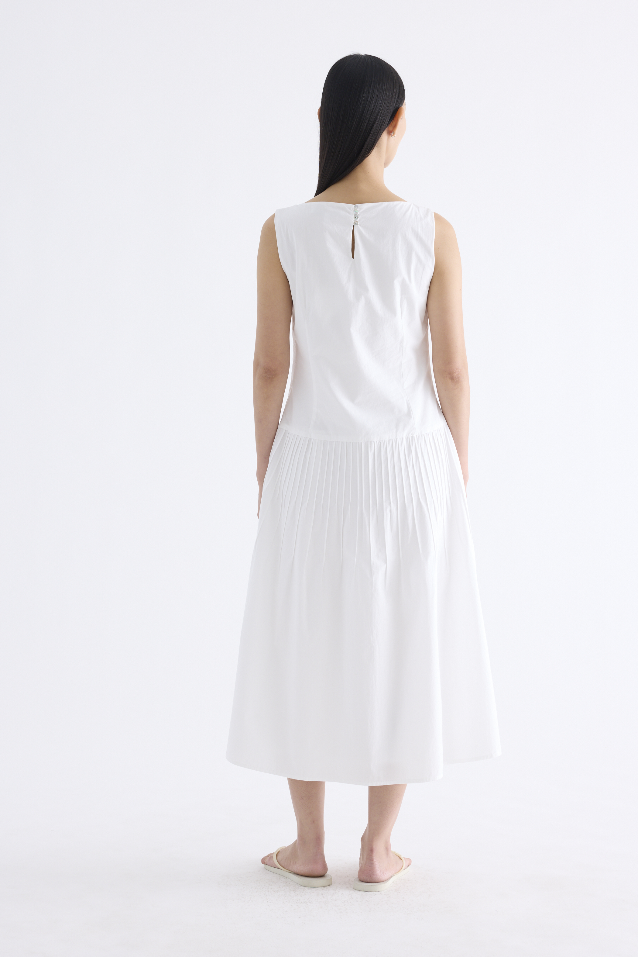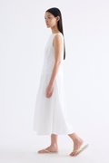 Textured. Made from crisp and softly structured cotton, this sleeveless maxi dress features a boat neckline, pleated waist, side zip and buttoned keyhole opening at the back. Worn in an A-line silhouette that fits slimmer at the waist.