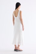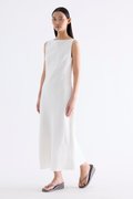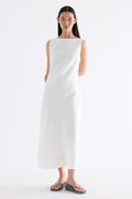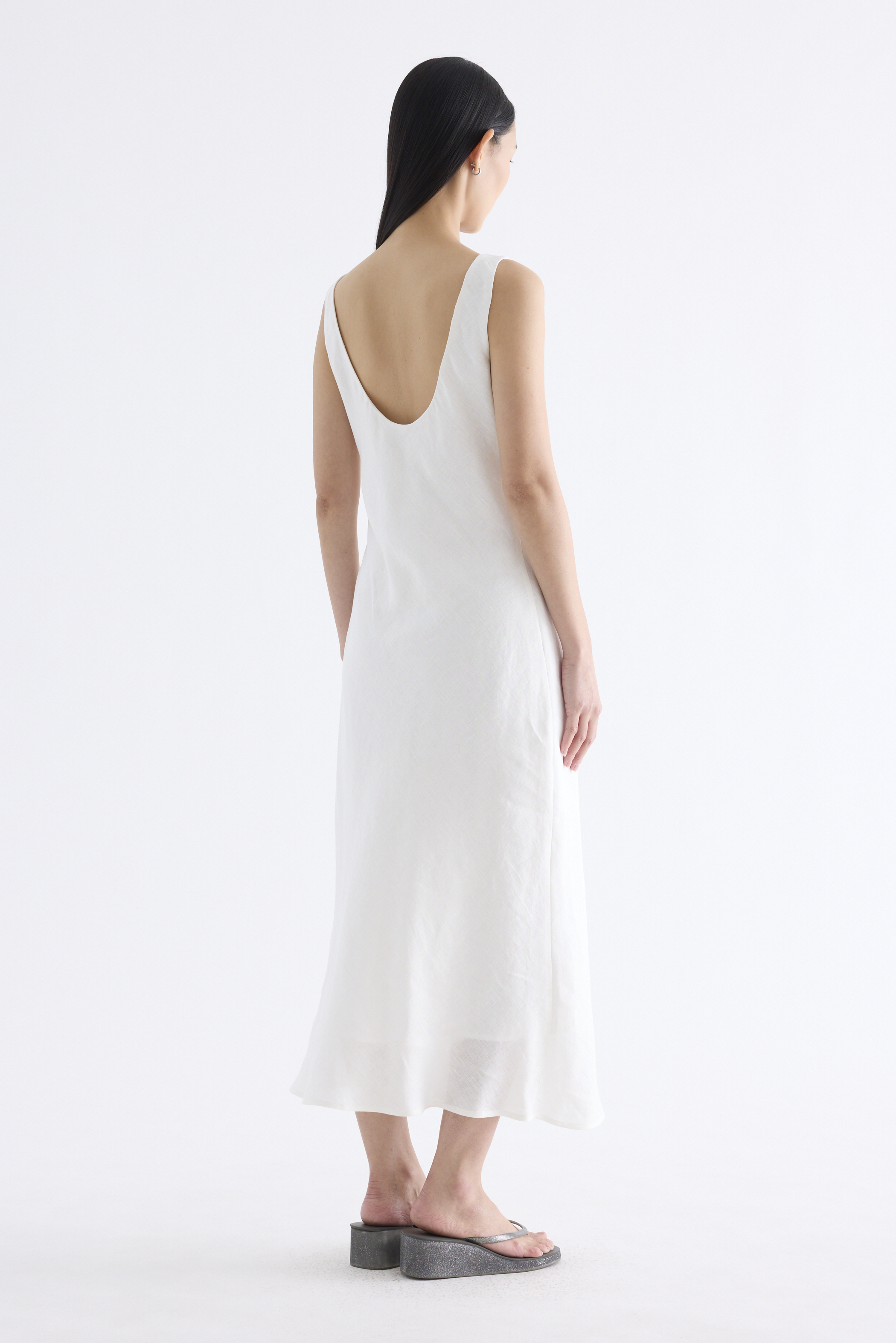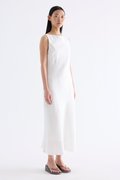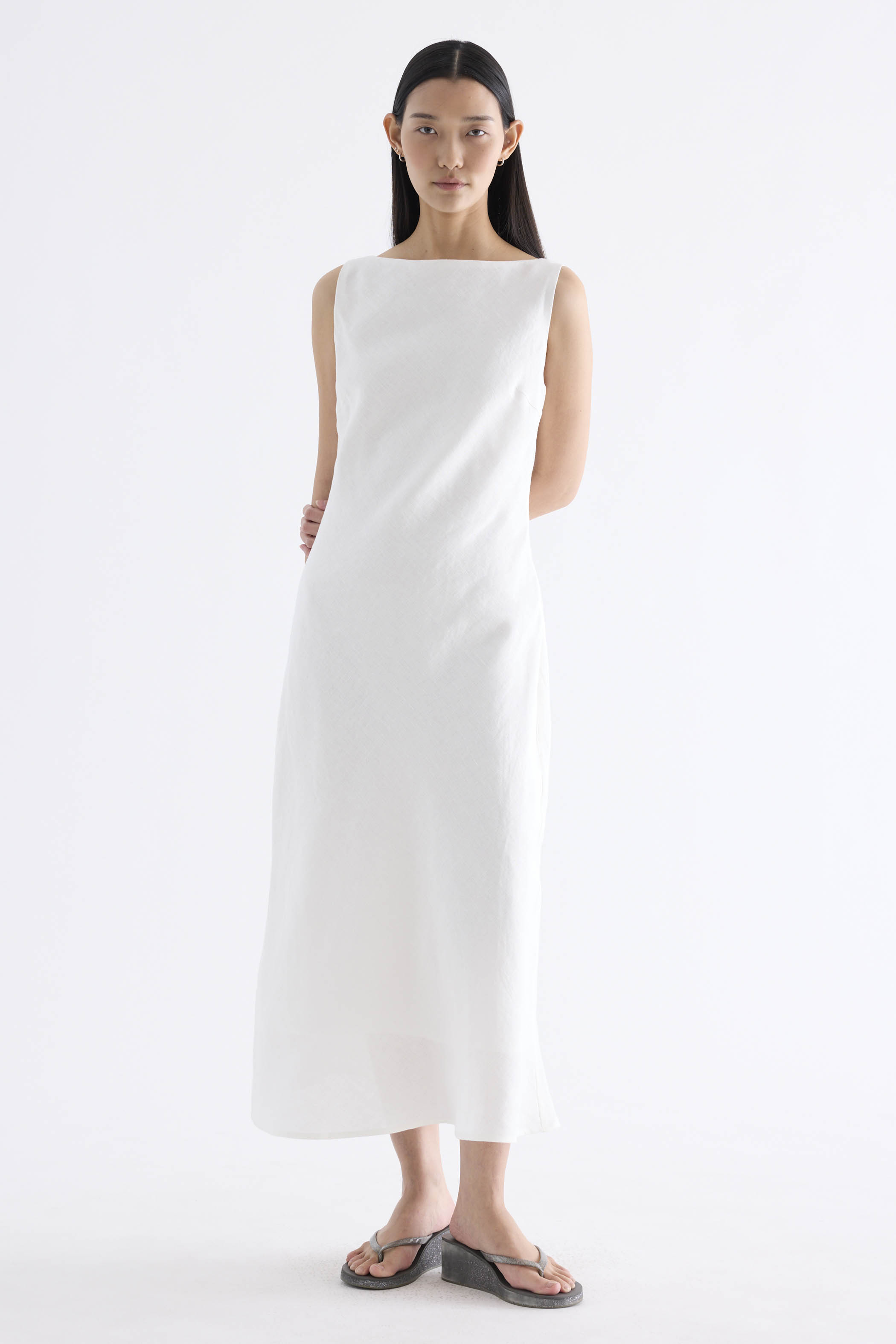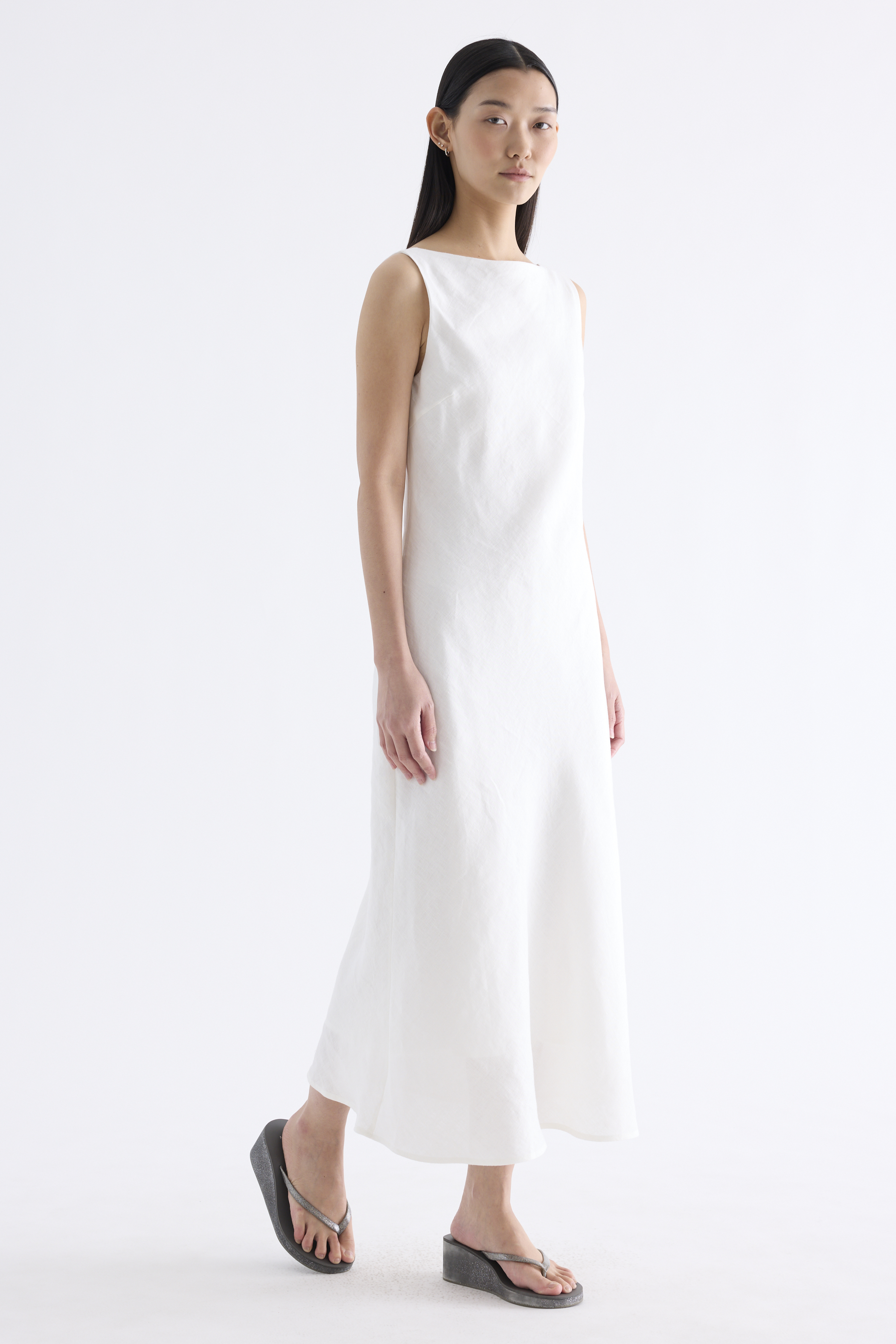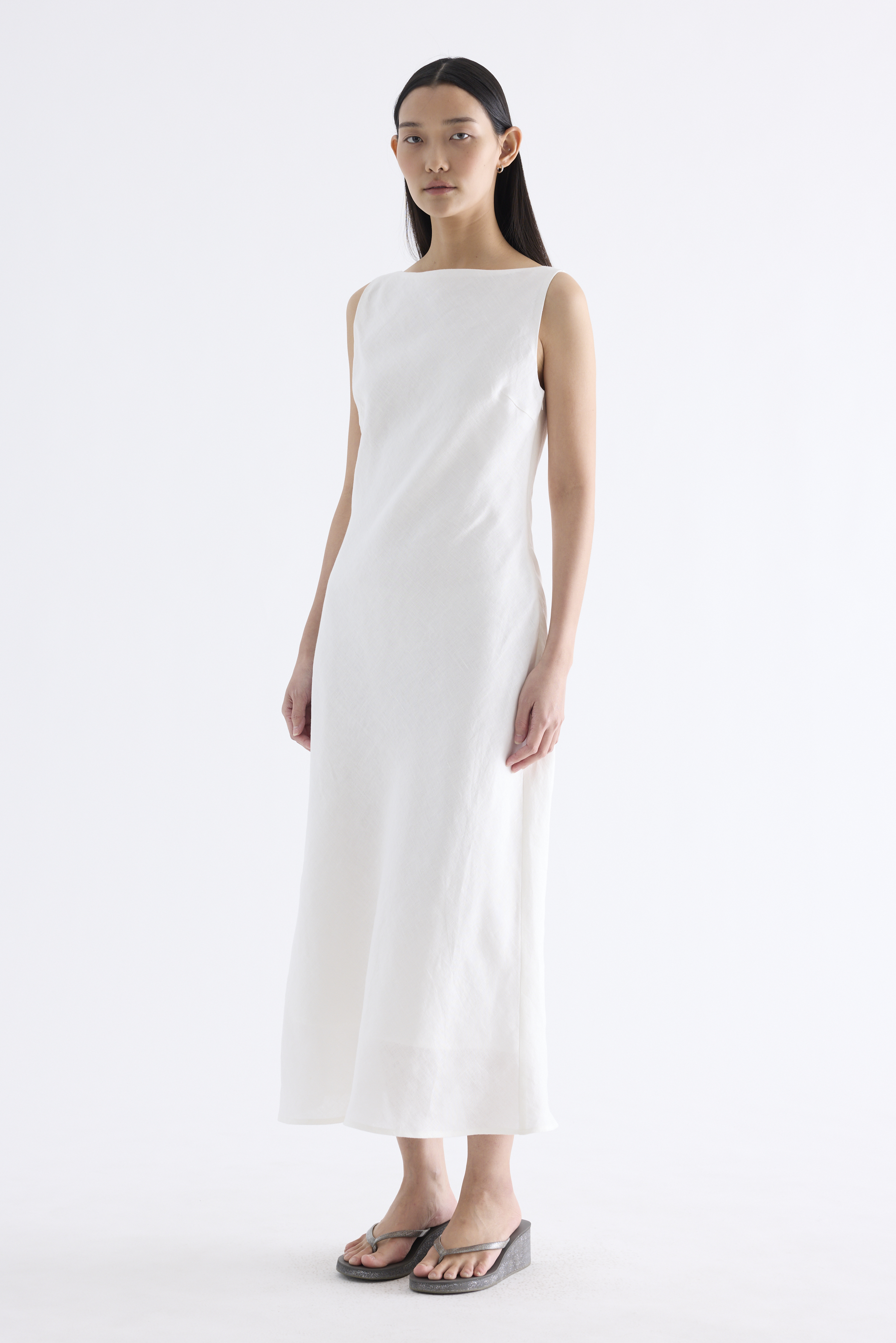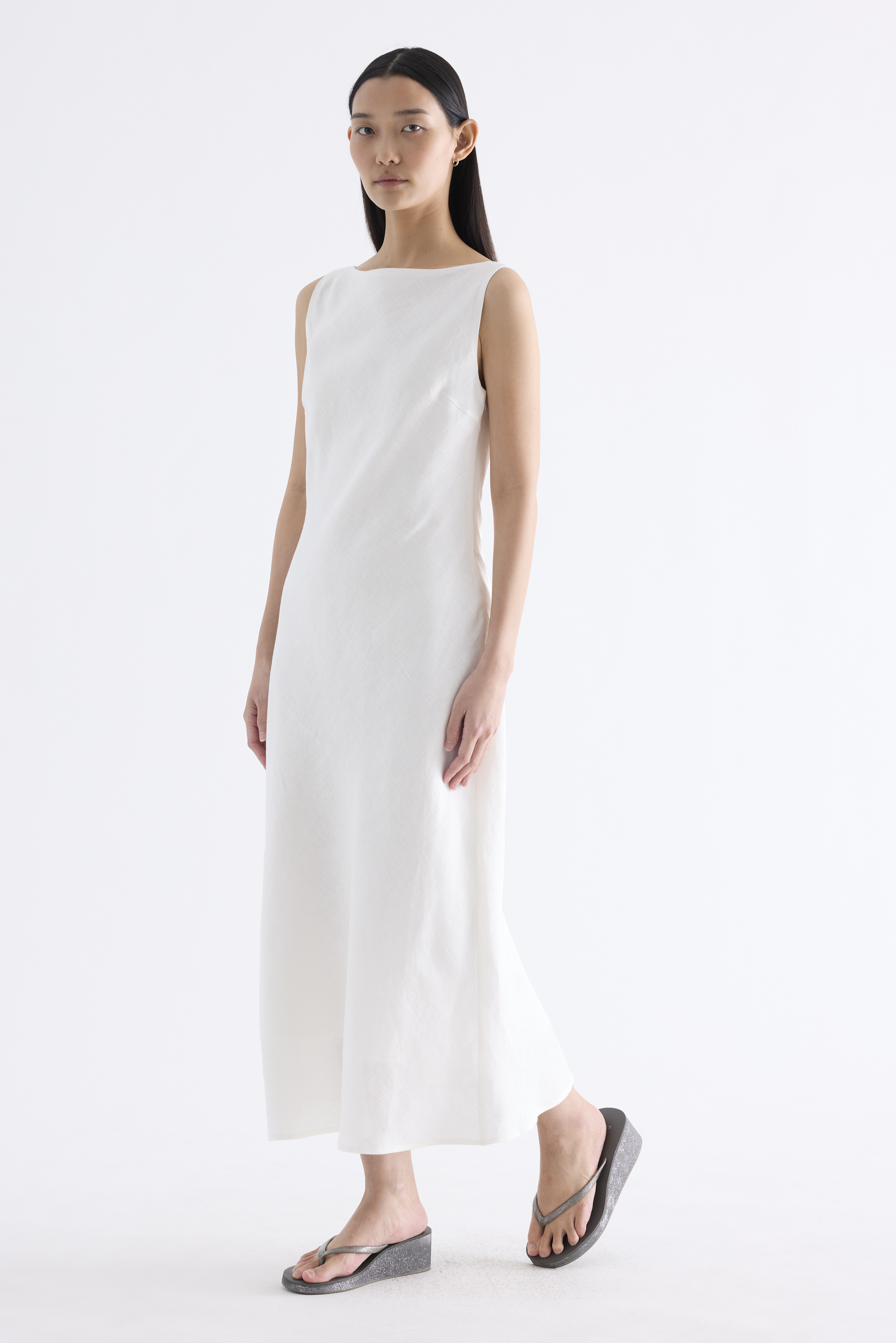 Fluid. Cut from light and airy 100% linen, this sleeveless maxi dress features a flowy bias silhouette, boat neckline and scooped back. Fits slim with a side zip closure.