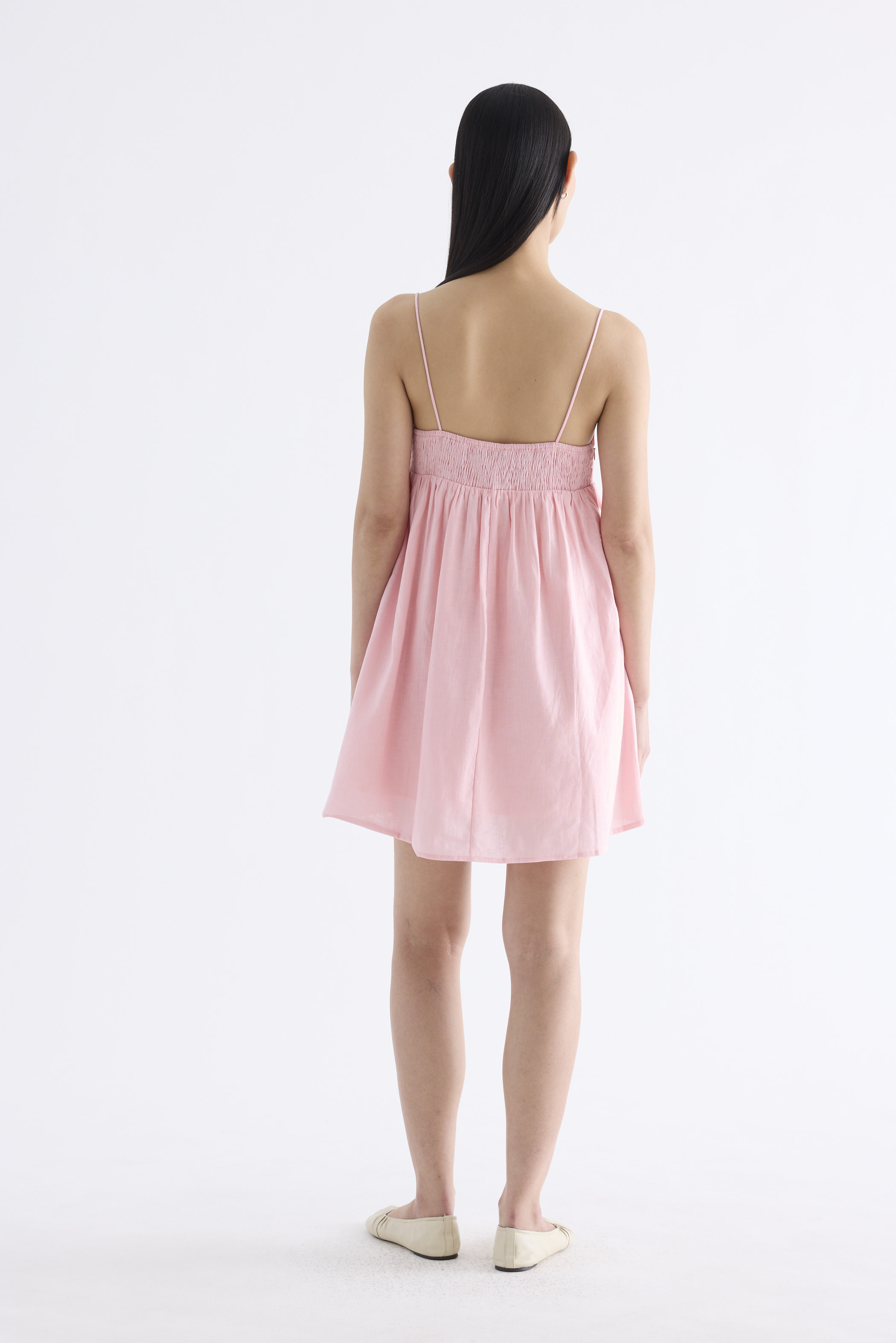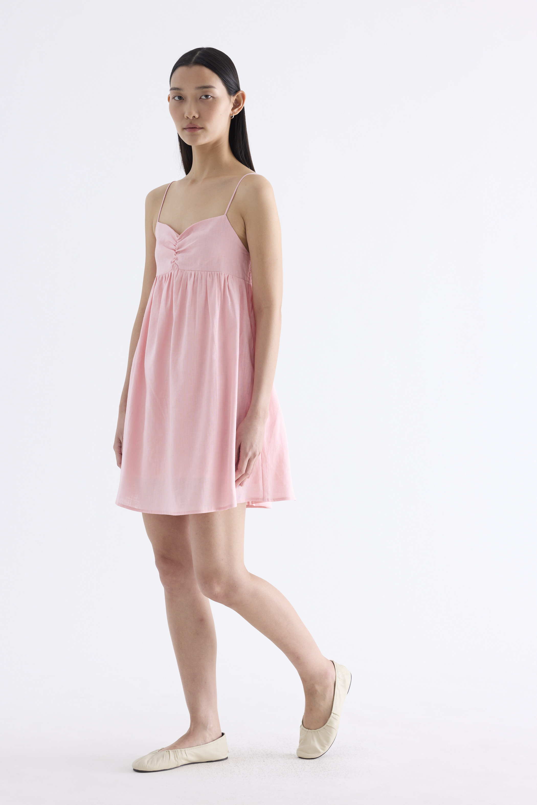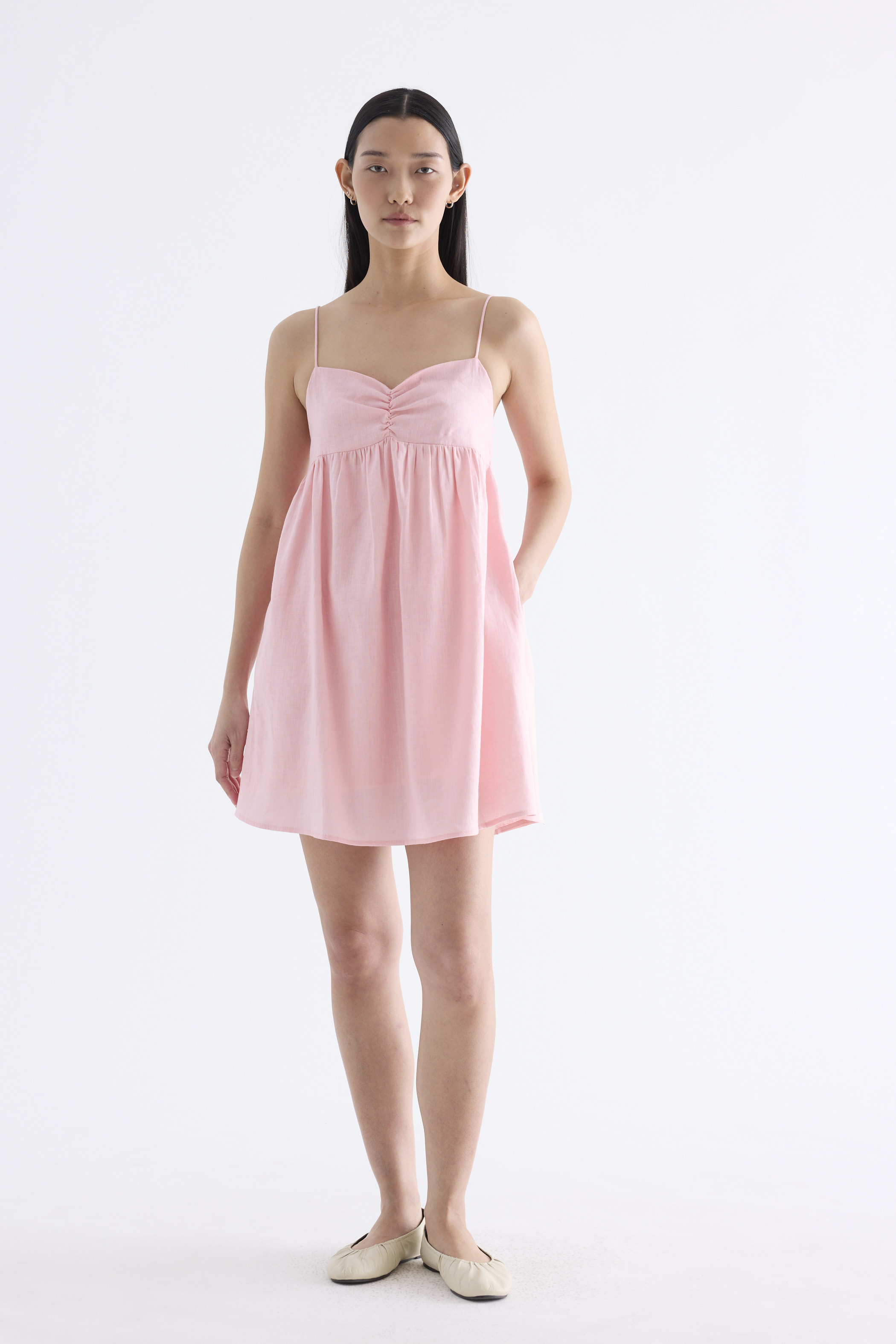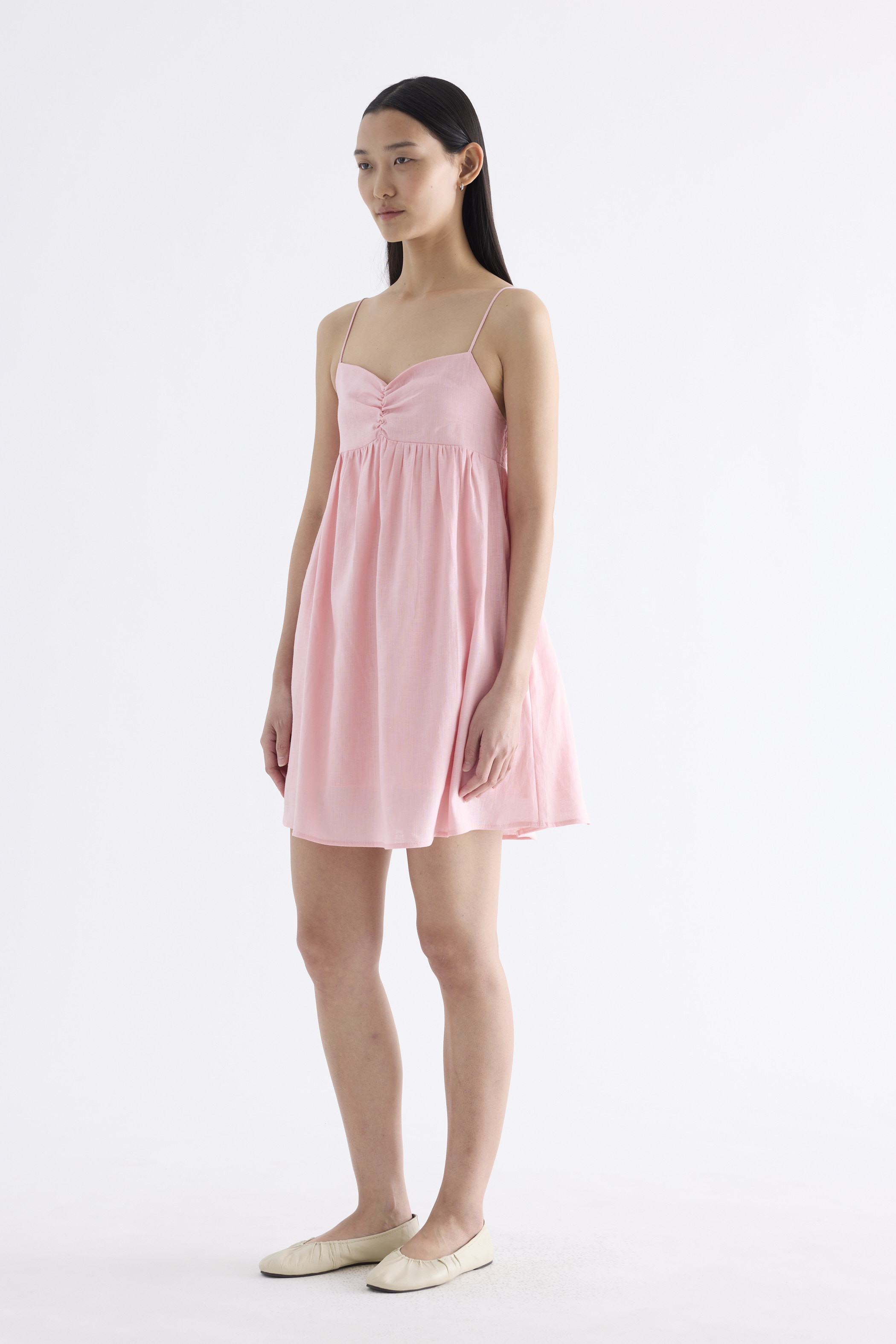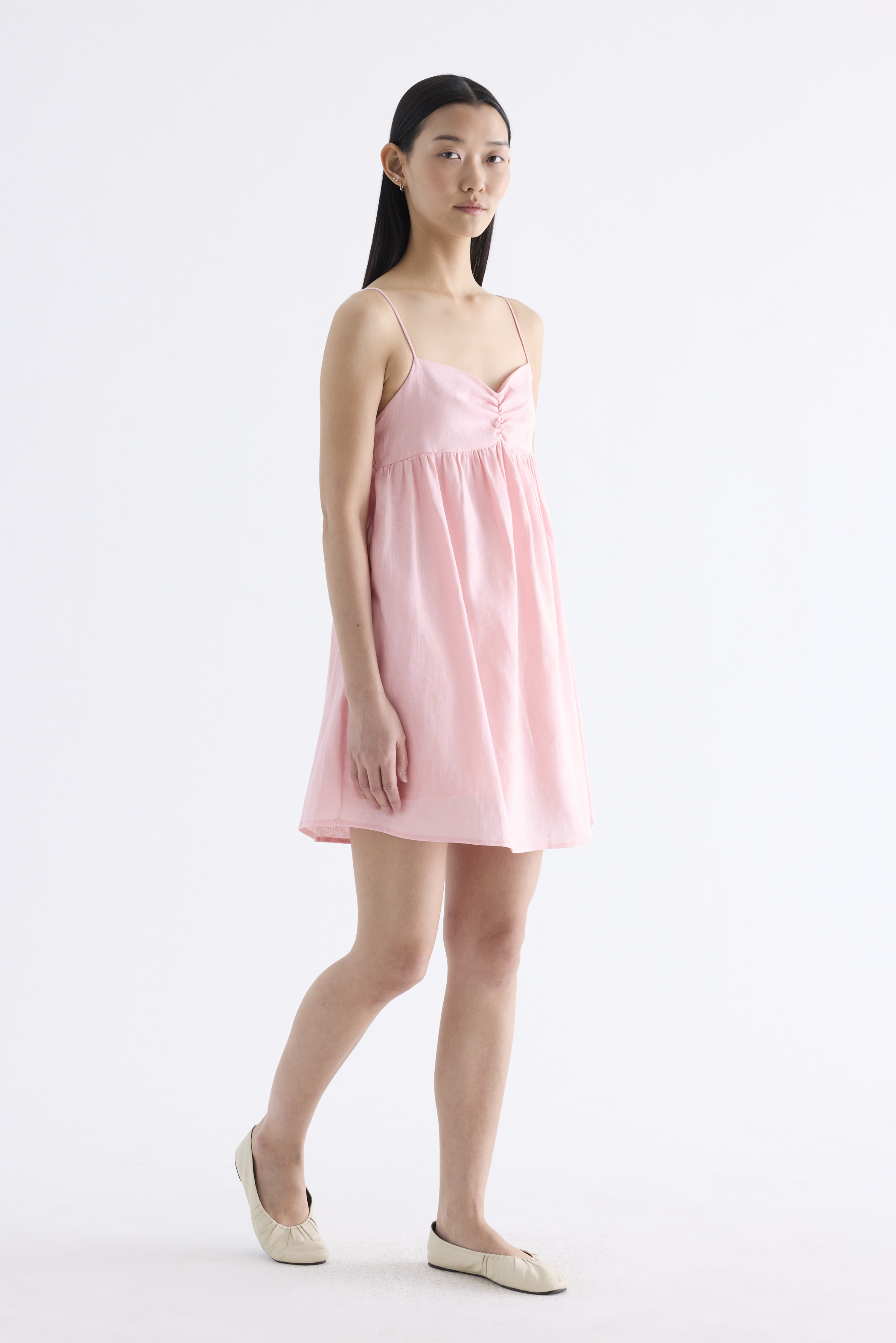 Warm weather approved. Cut from airy and lightweight 100% linen, this sleeveless mini dress features a dipped neckline, a ruched bust, slim non-adjustable shoulder straps, a smocked back and a side zip closure. Worn in an empire-waist silhouette that fits slimmer at the bust before flaring out in a relaxed skirt.