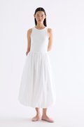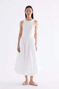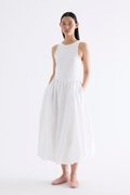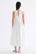 Occasion ready. This maxi dress features a stretchy tank top with a round neckline, a back opening with ribbon tie-strap closures and a bubble skirt cut from crisp, softly structured cotton. Worn in an A-line silhouette that fits slimmer through the bodice before flaring out at the waist.