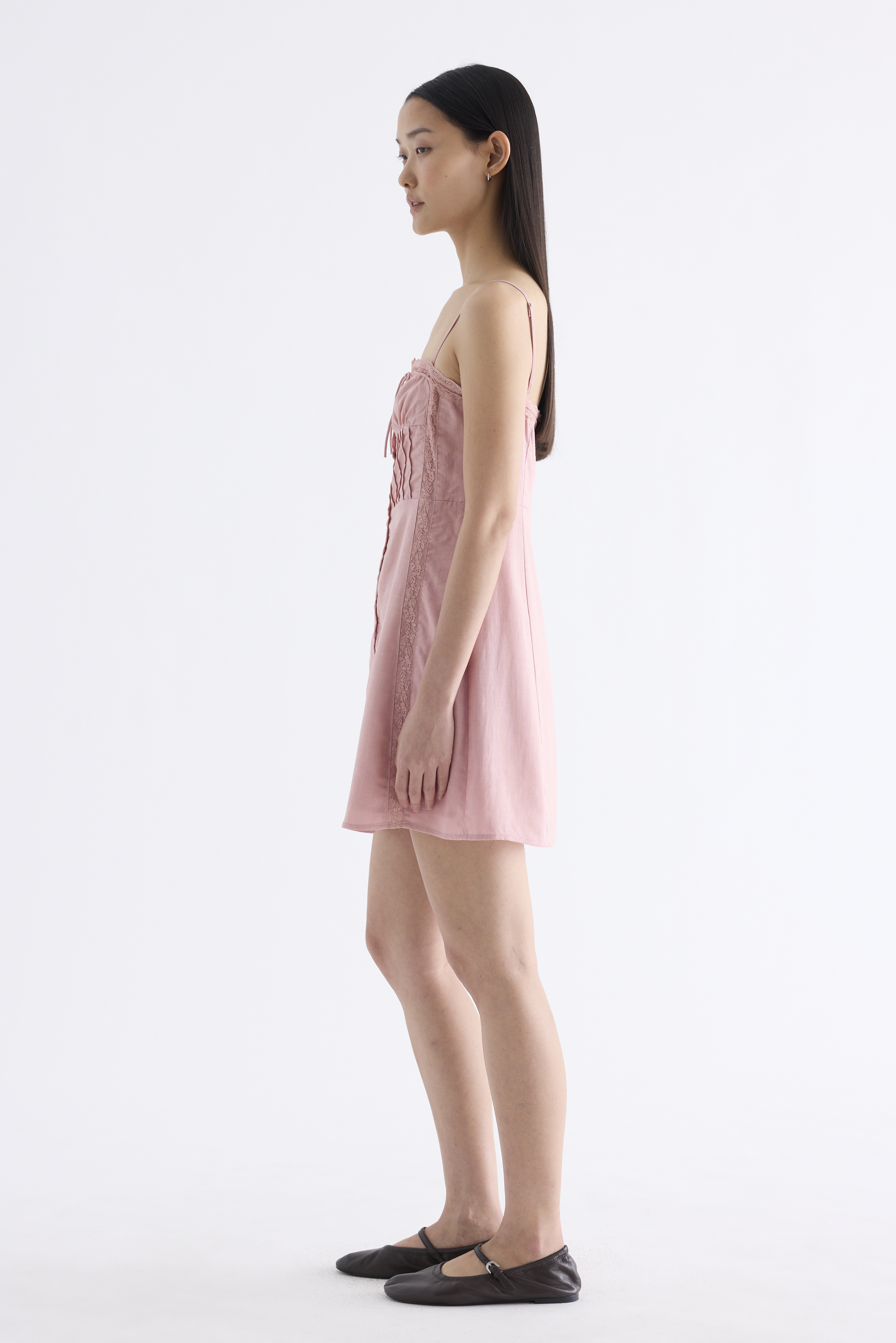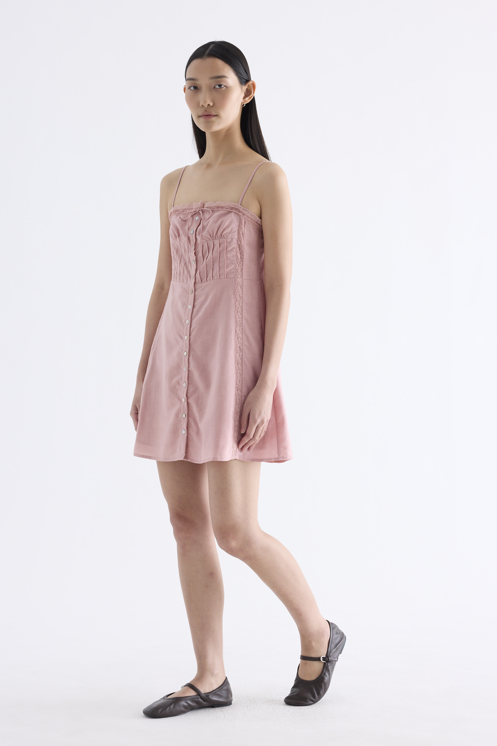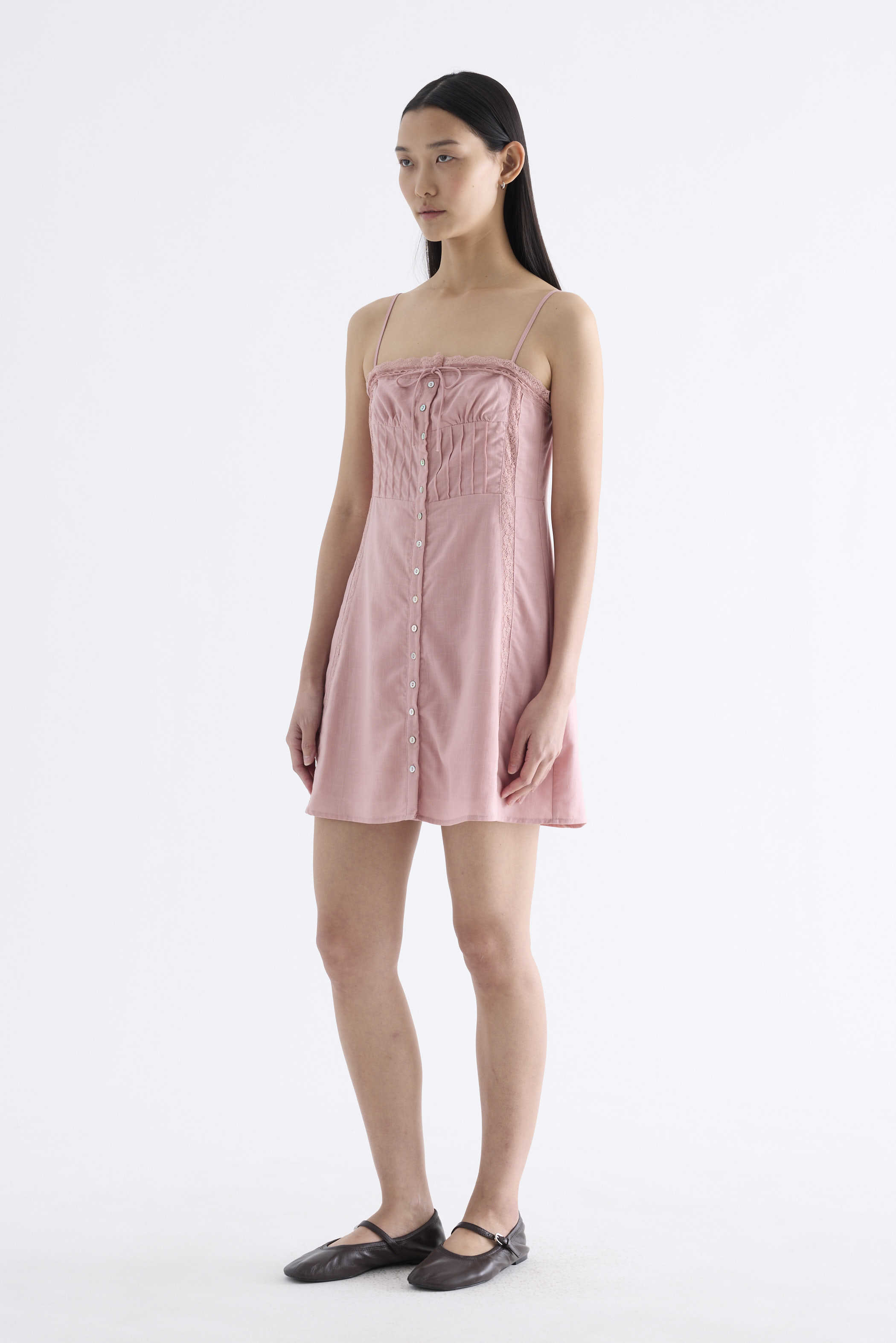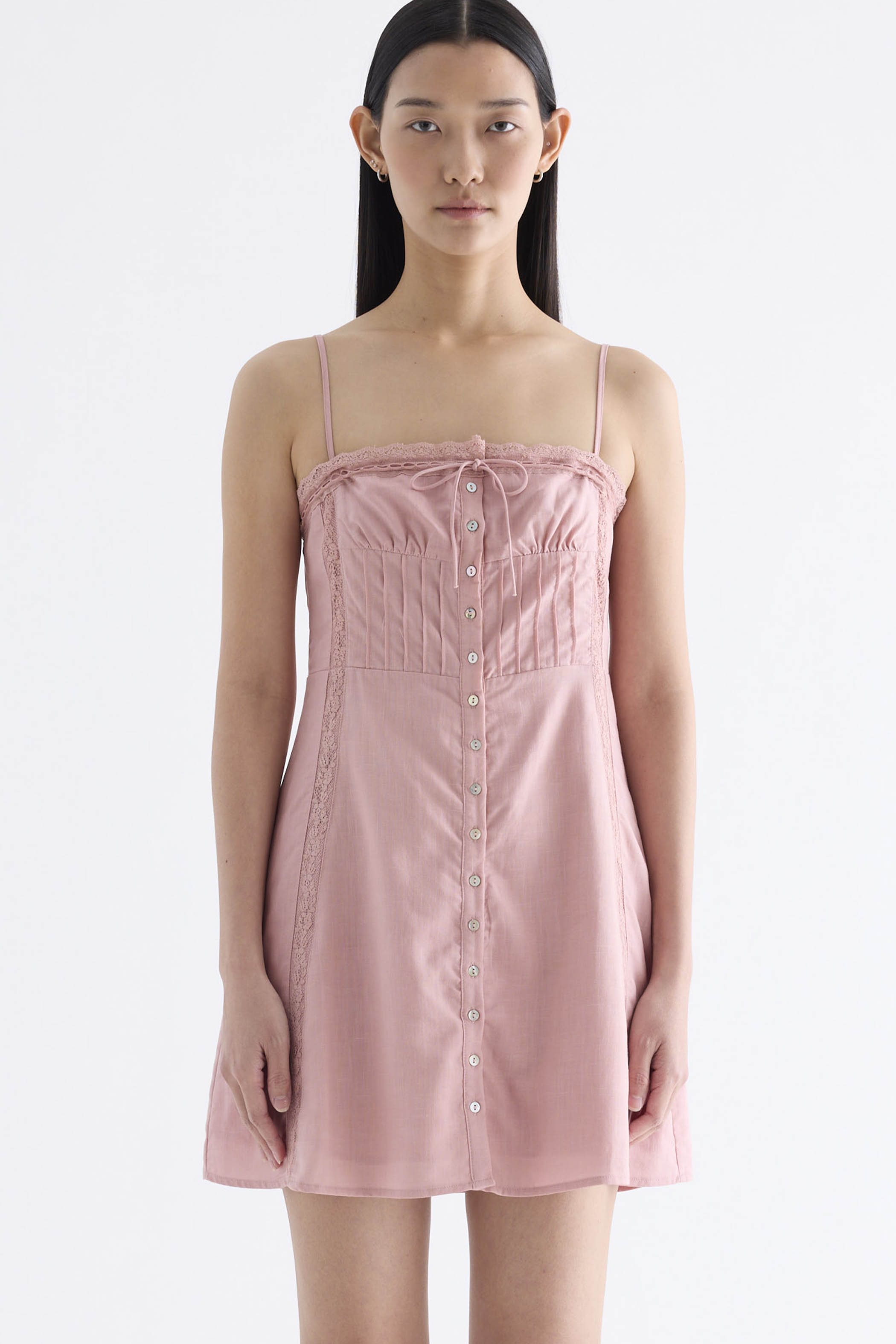 Always cool. Made from light and non-stretch Tencel, this sleeveless button-down dress features a drawstring lace-trimmed neckline with a front tie-strap, slim adjustable shoulder straps, a pleated bodice and lace panels. Fits slim and above the knee.