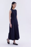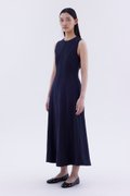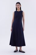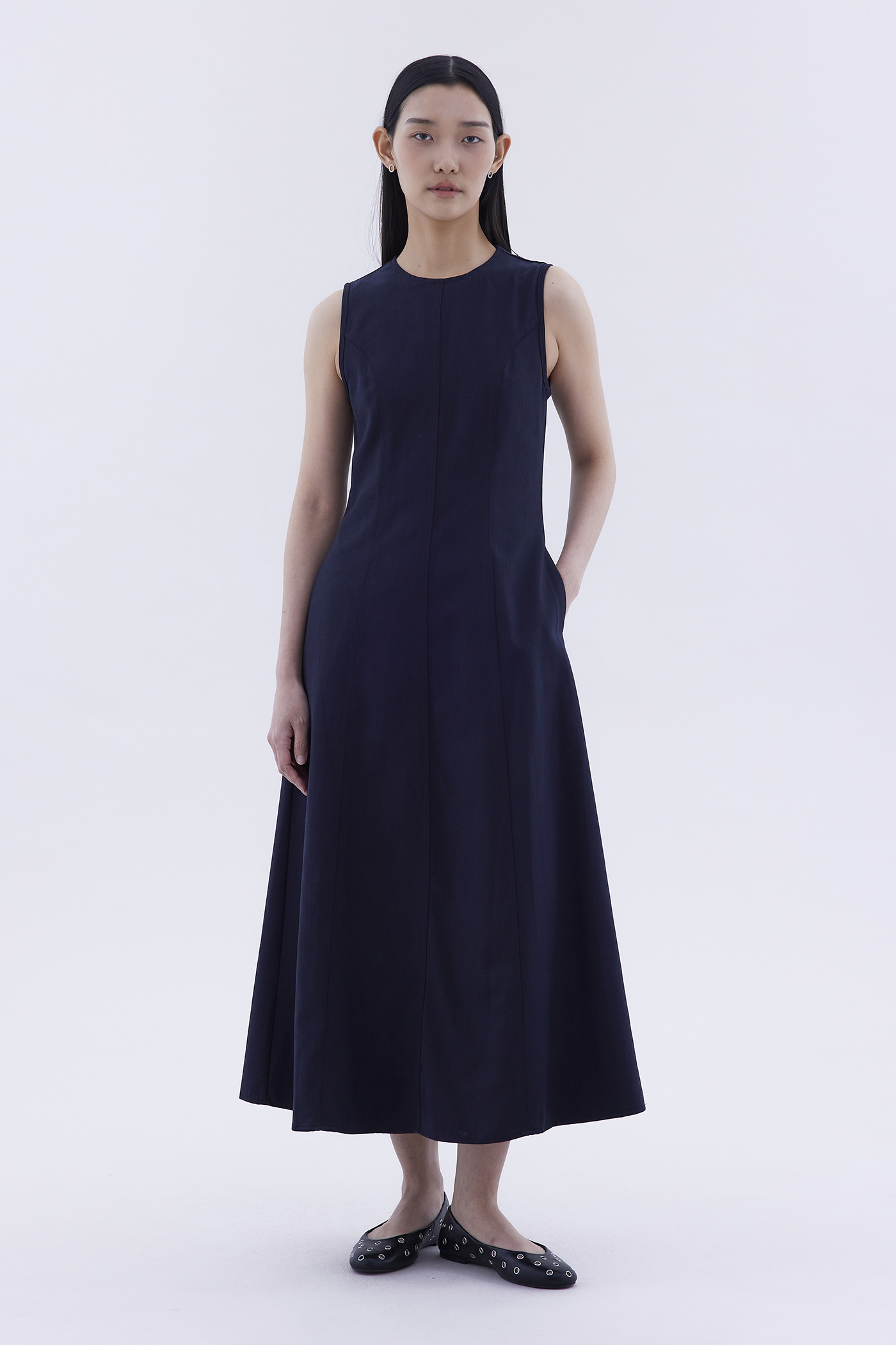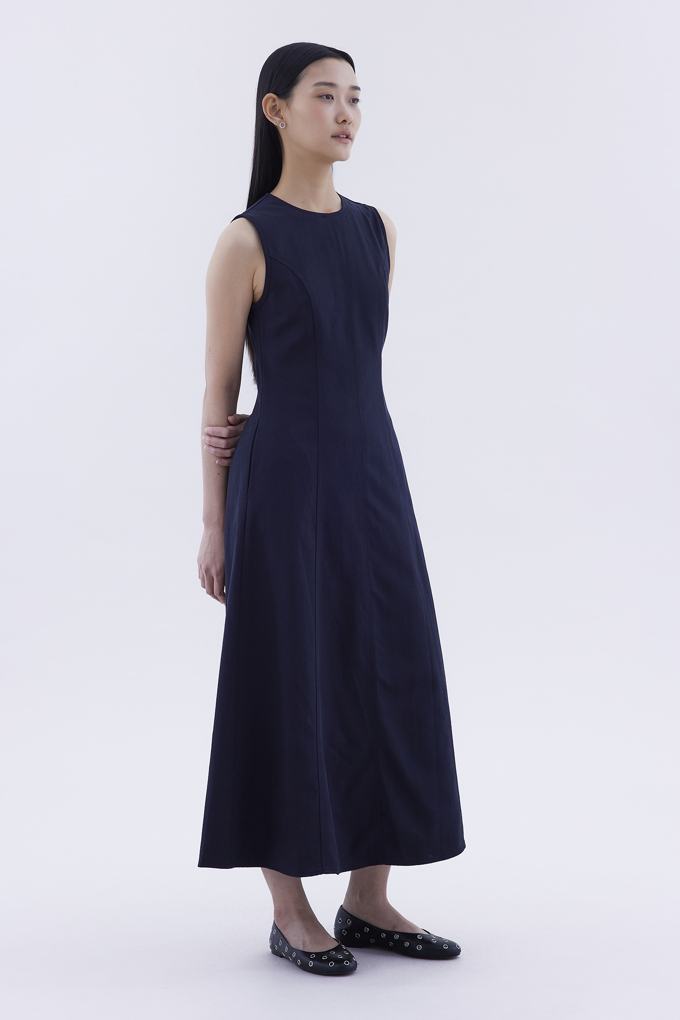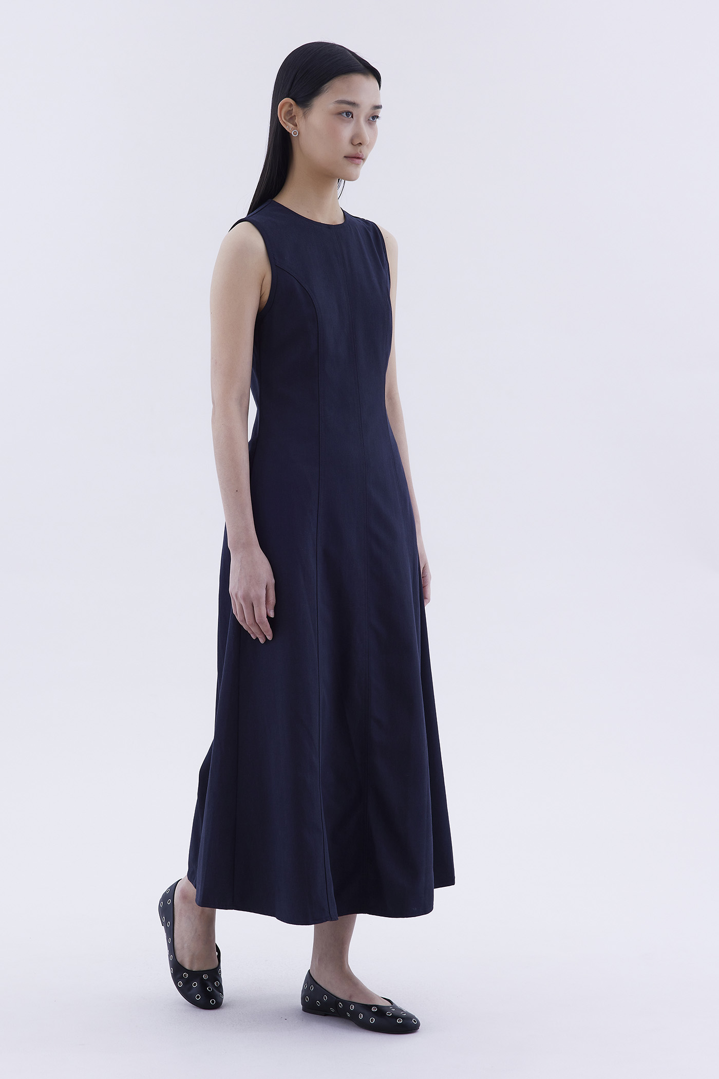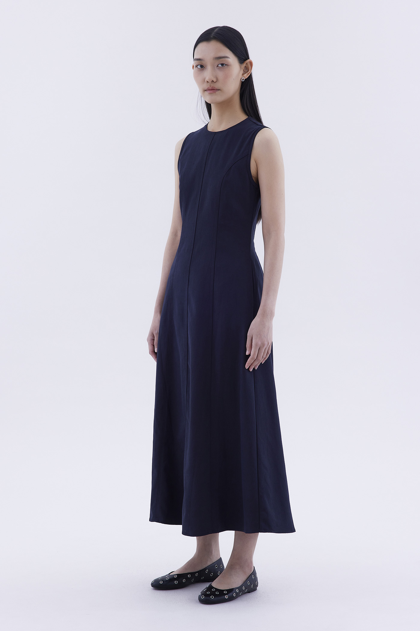 Good from every angle. Made from softly structured fabric, this sleeveless maxi dress features a round neckline, panelled construction and an elasticated back opening with connecting straps. Worn in a slim fit.