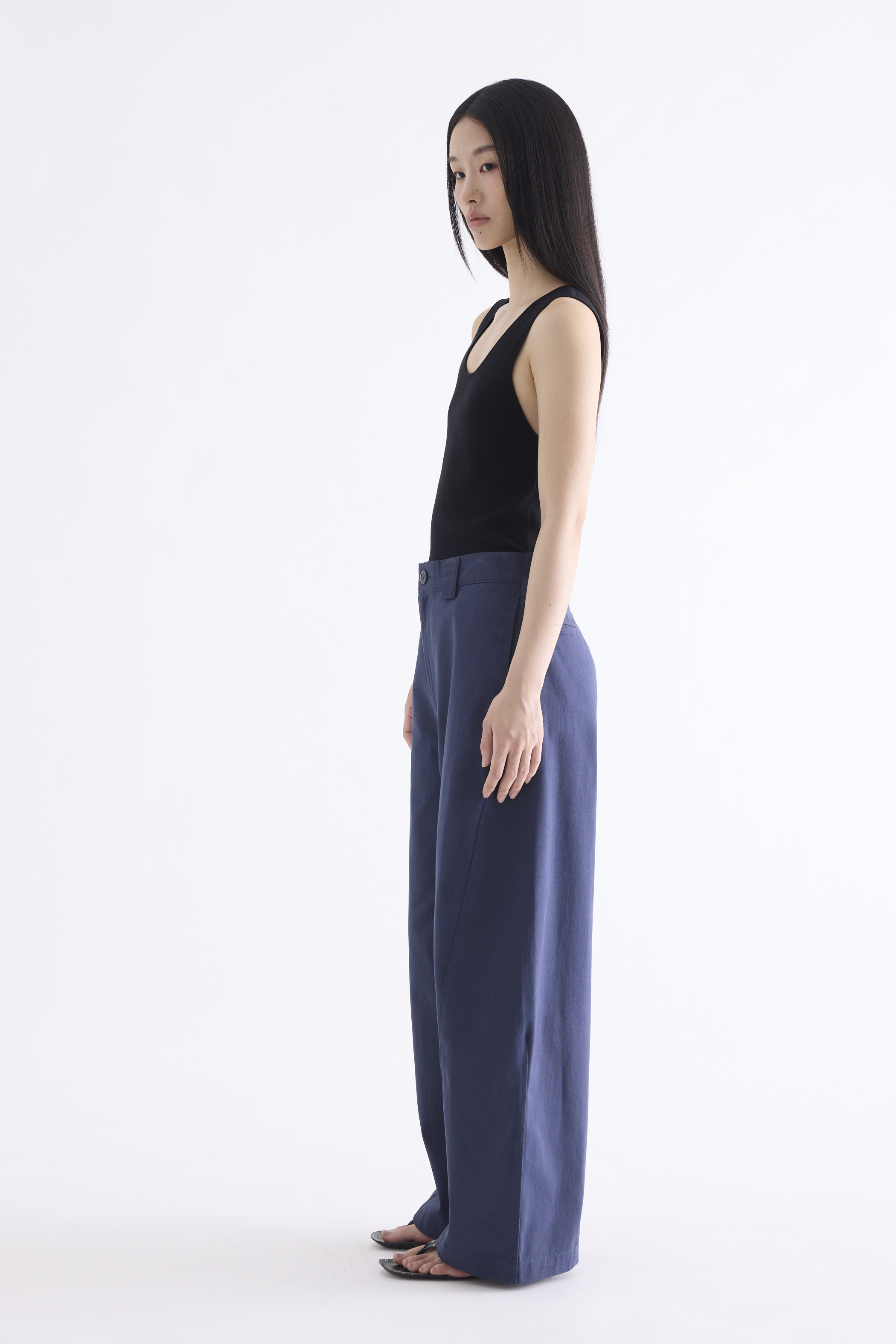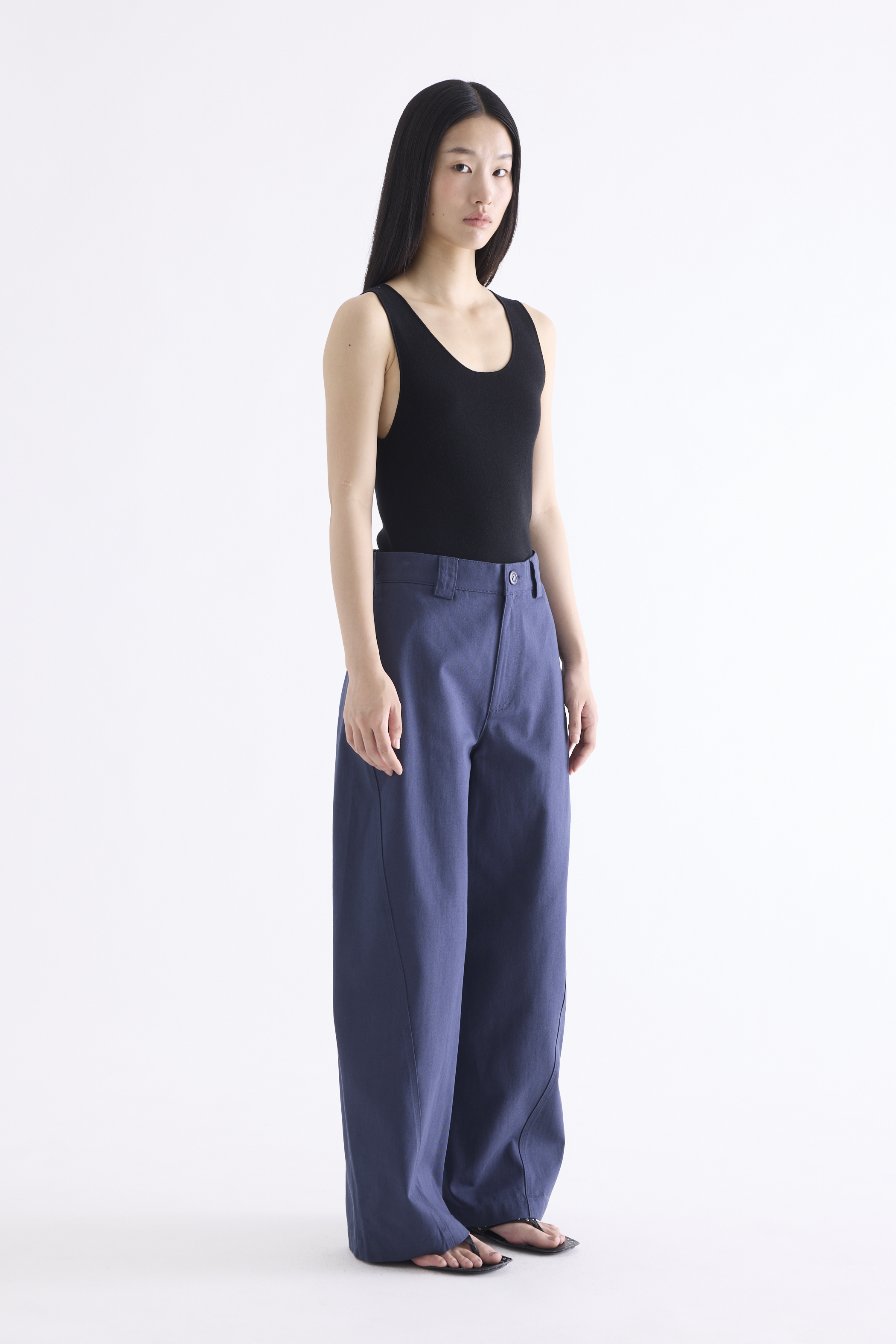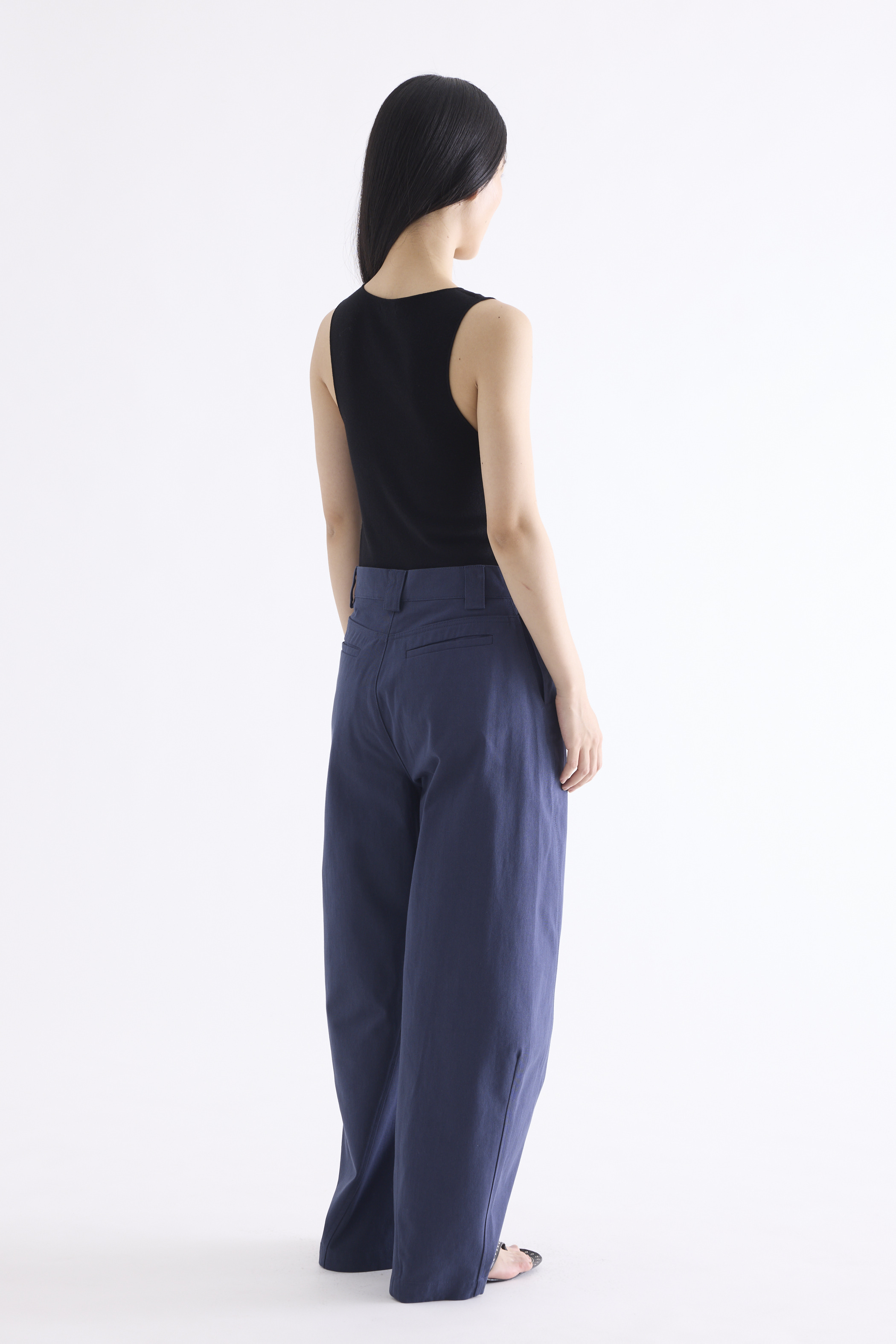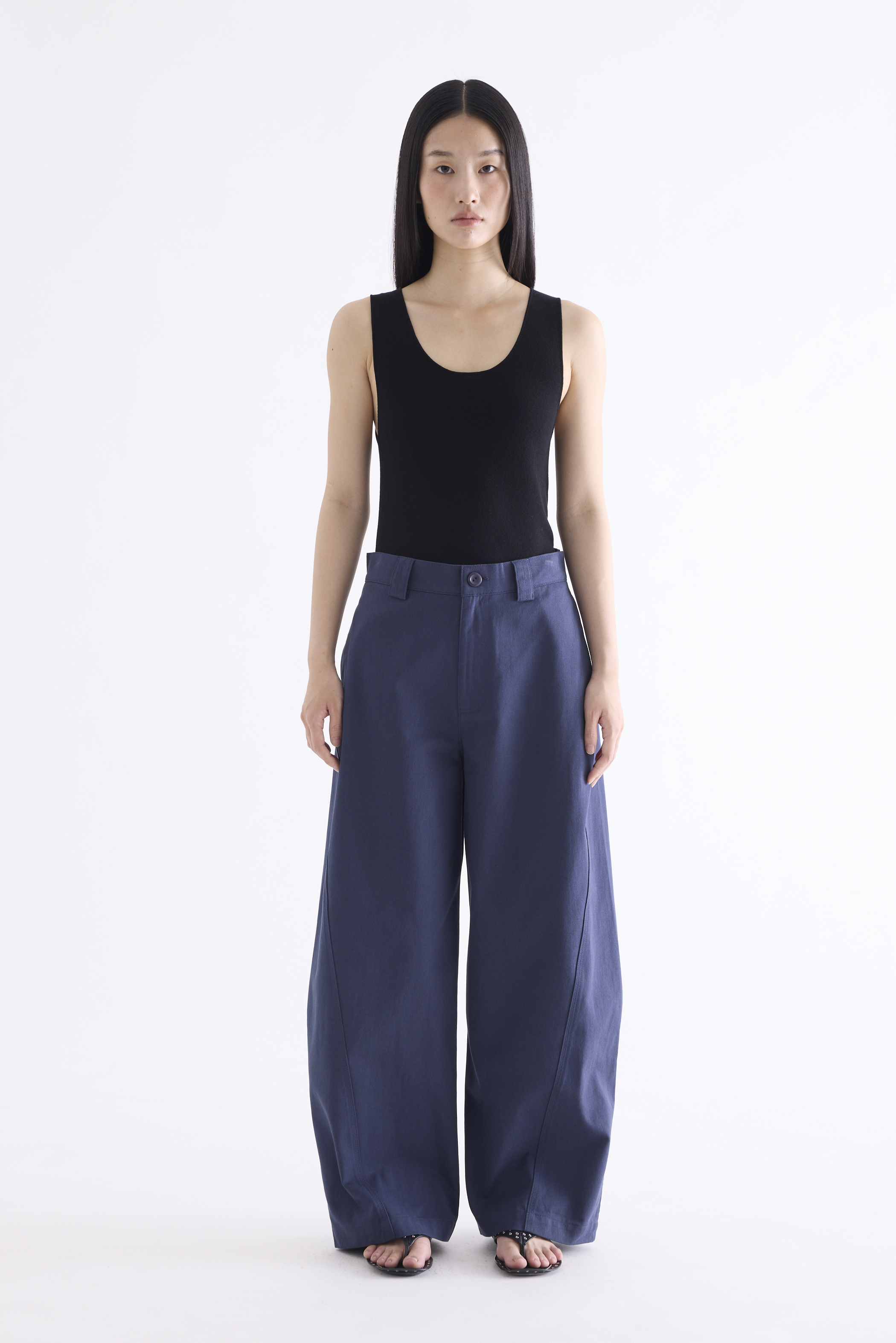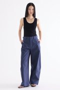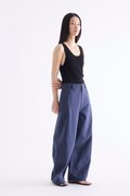 From the Postscript collection. These mid-waisted pants feature relaxed barrel legs with angled seams, wide belt loops, and a front button and zip closure. Worn in a relaxed fit.