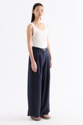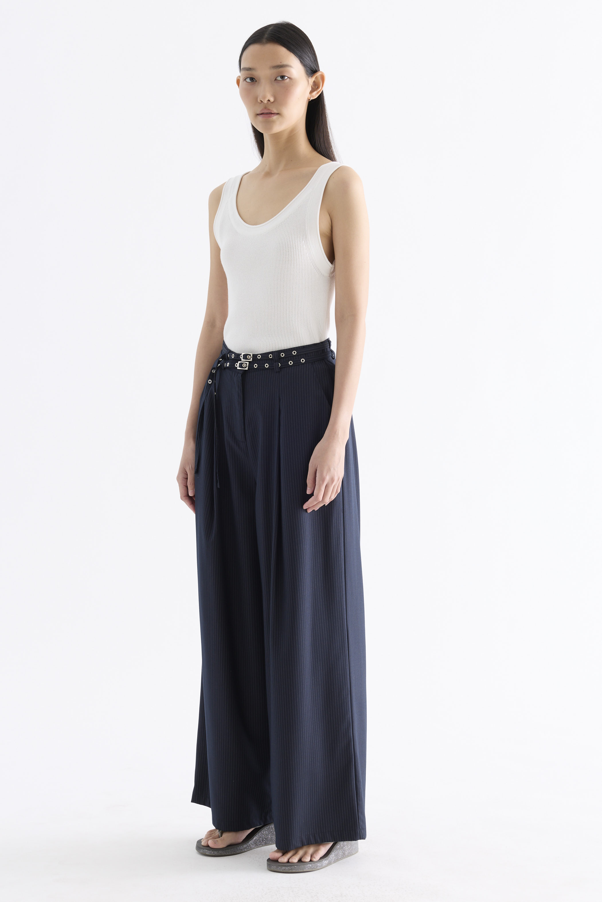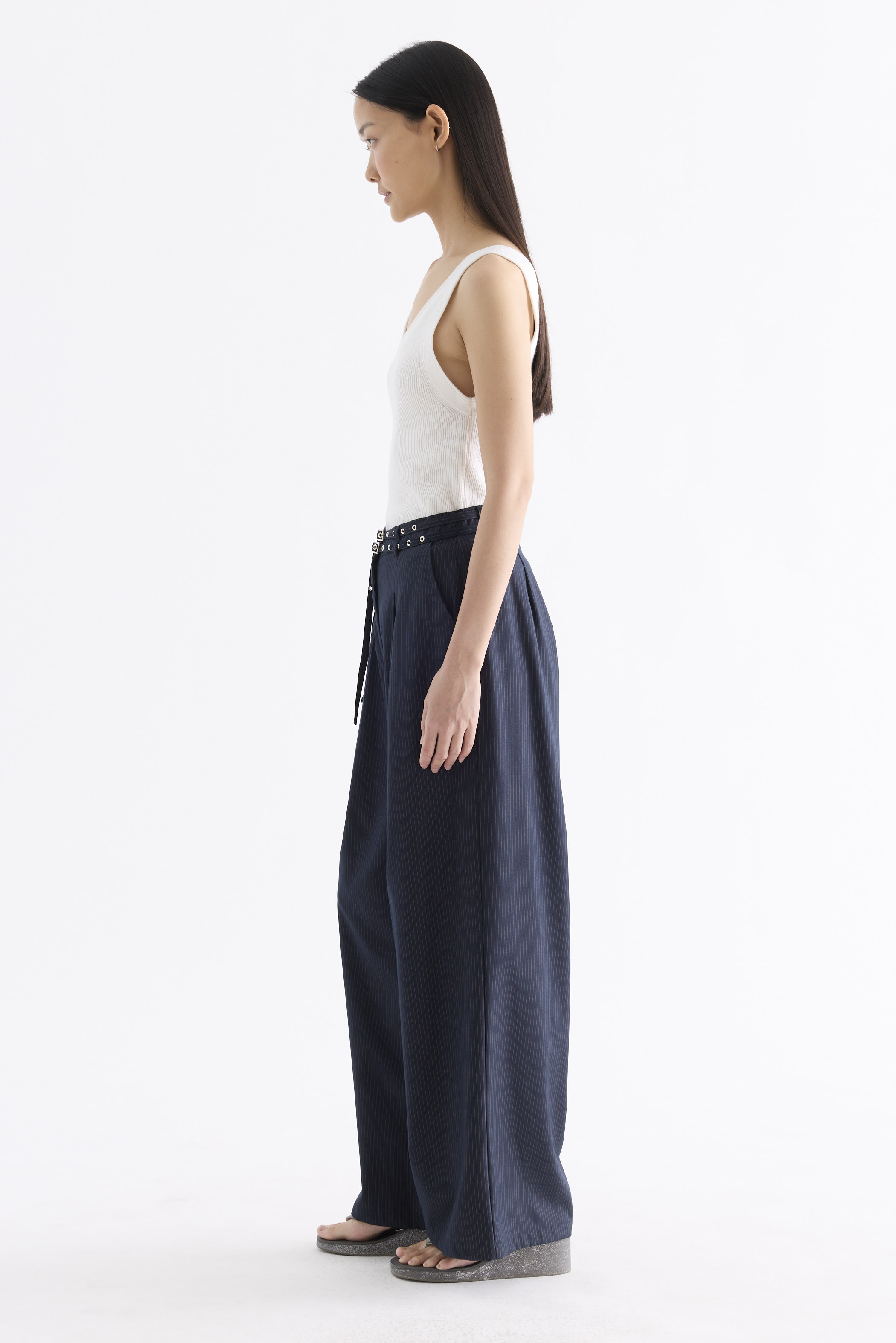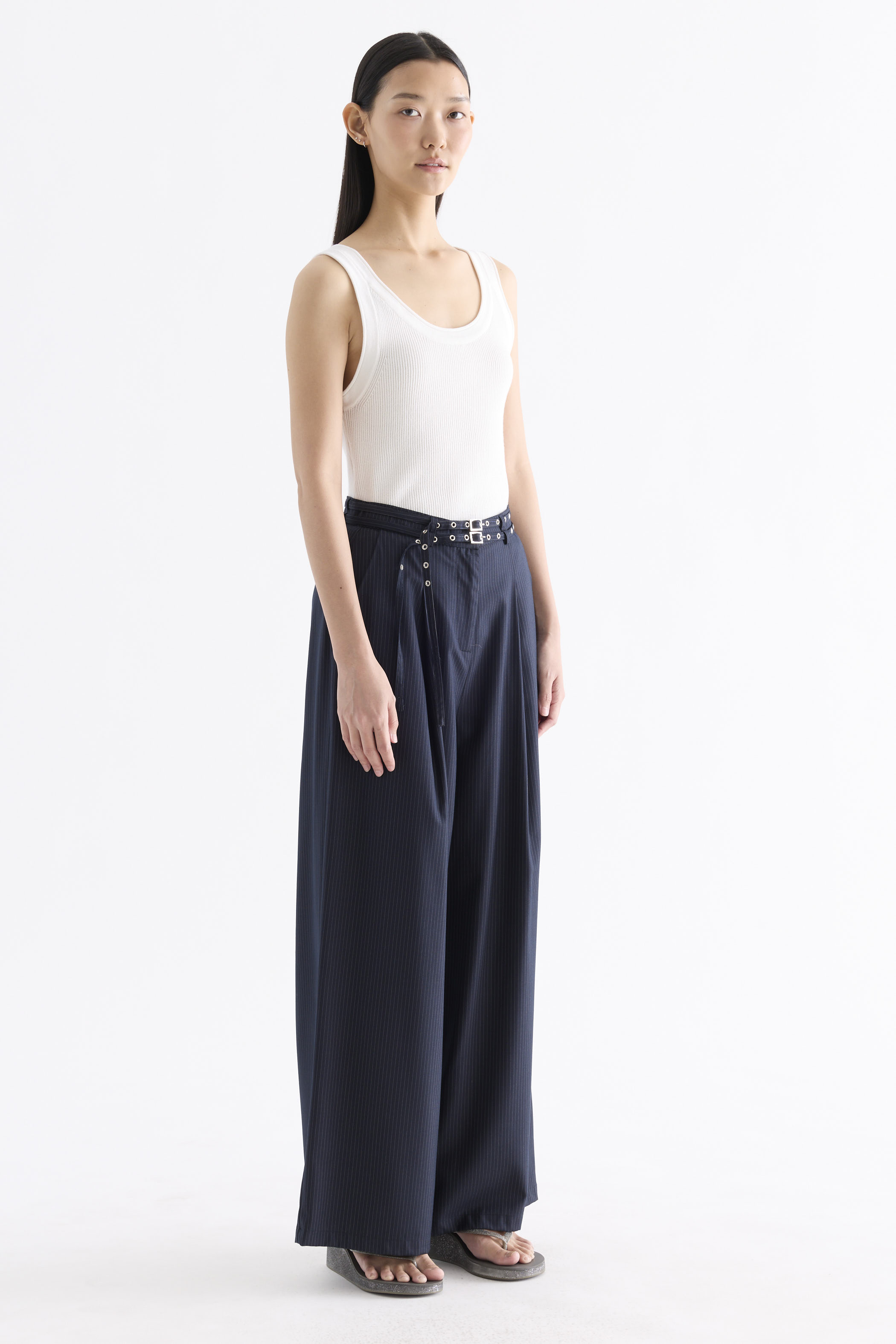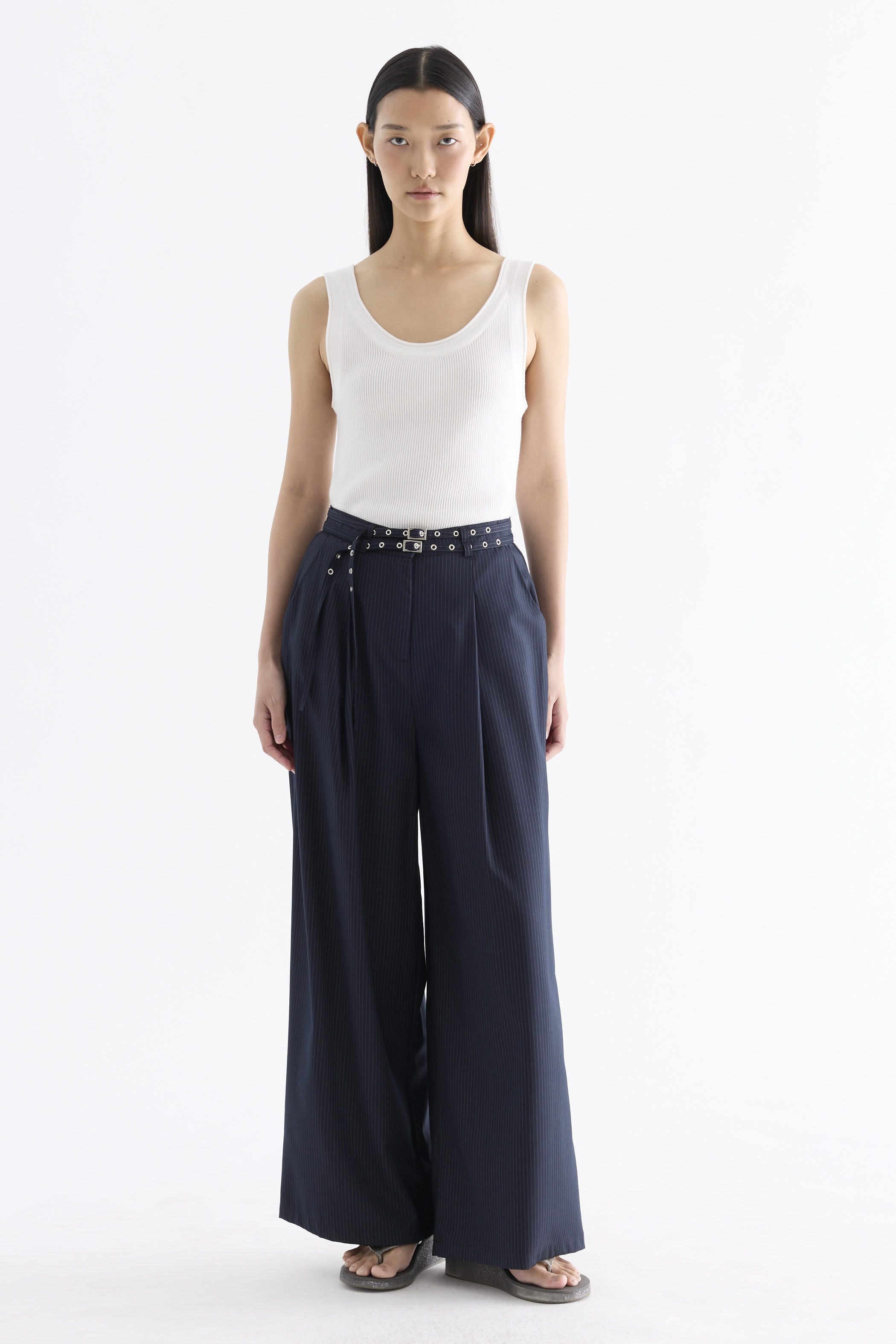 Twice the impact. Made from smooth and gently tailored fabric, these high-rise pants feature detachable studded belts, wide straight legs, belt loops, and a front zip and button closure. Worn in a relaxed fit.