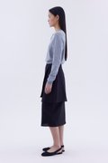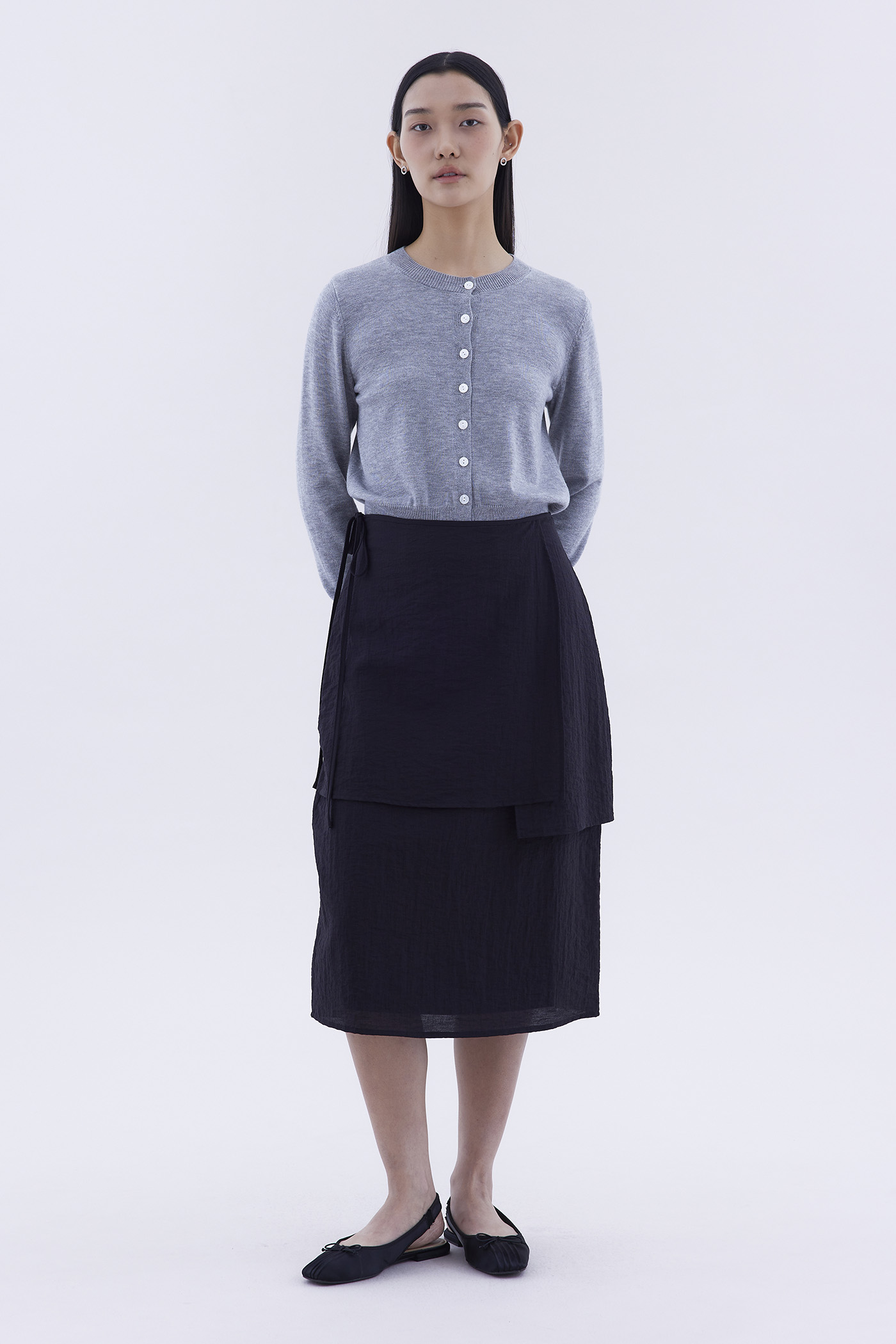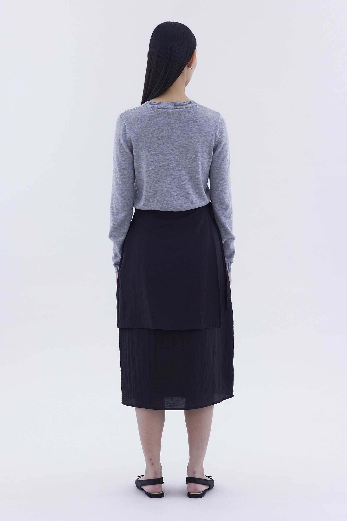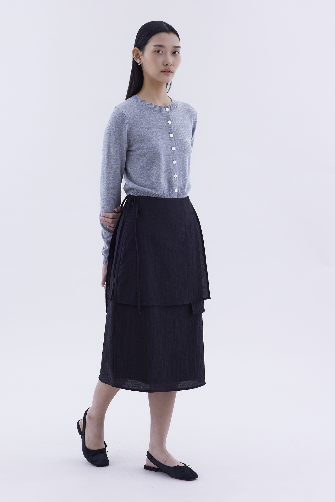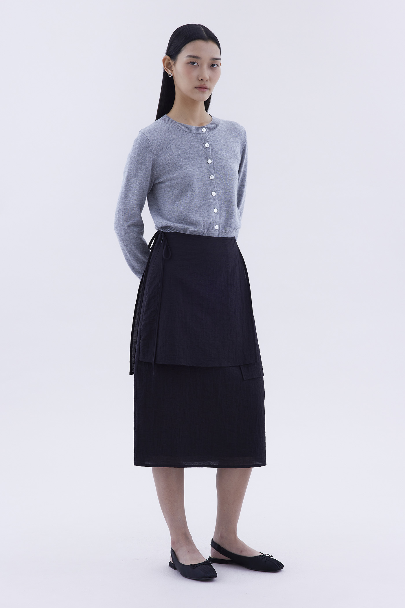 Topping it all off. Made from light and textured fabric, this midi skirt features a layered, wrap-around waist with a side tie-strap, as well as a side zip closure.
