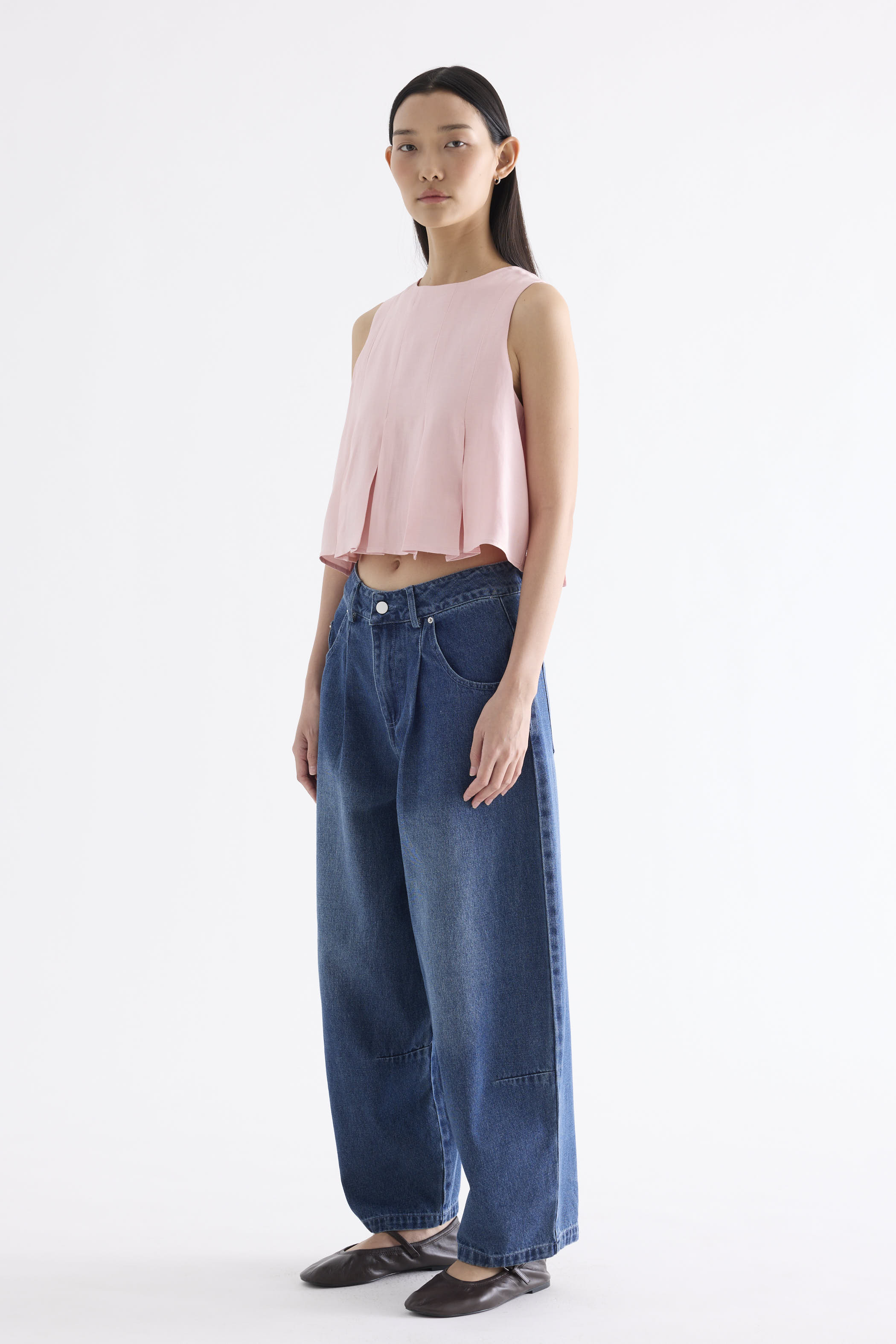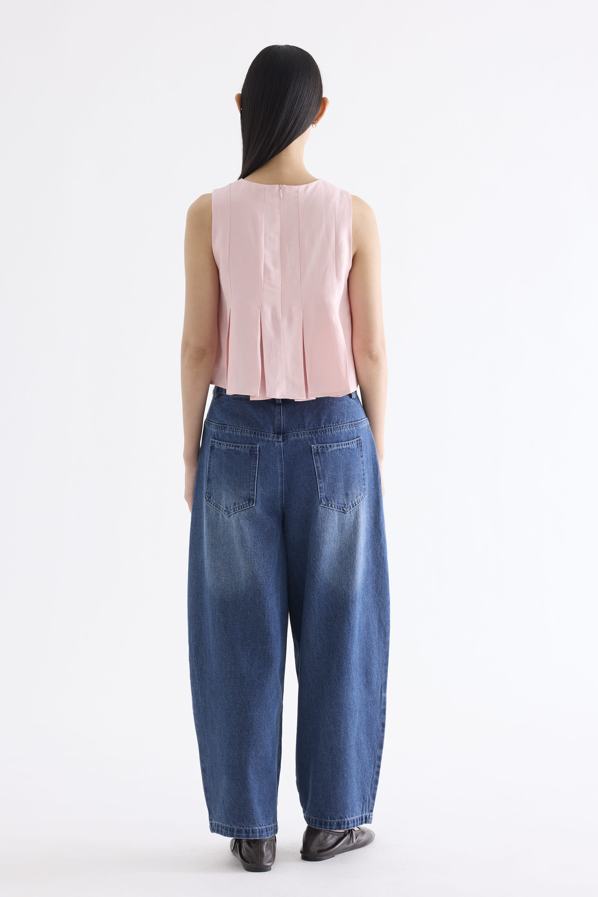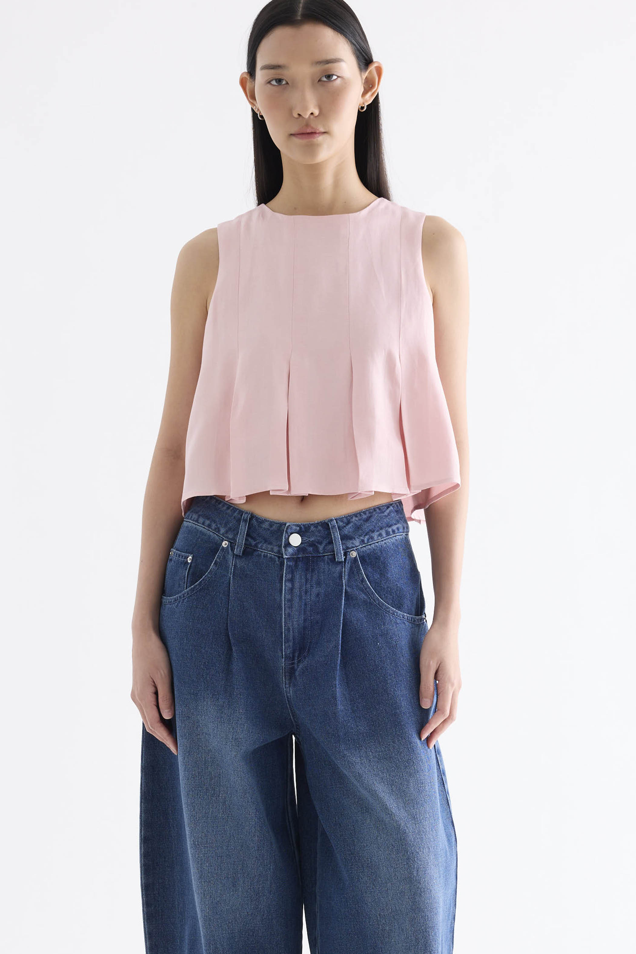 Clean lines. Cut from smooth and softly tailored fabric, this sleeveless top features a round-neckline, cut-in shoulders, box pleats and a panelled construction. Fits relaxed with a back zip closure.