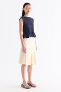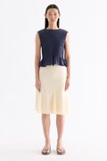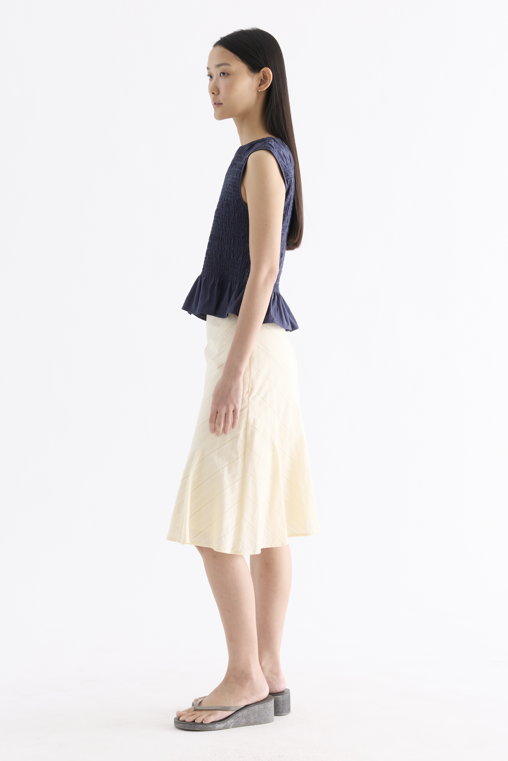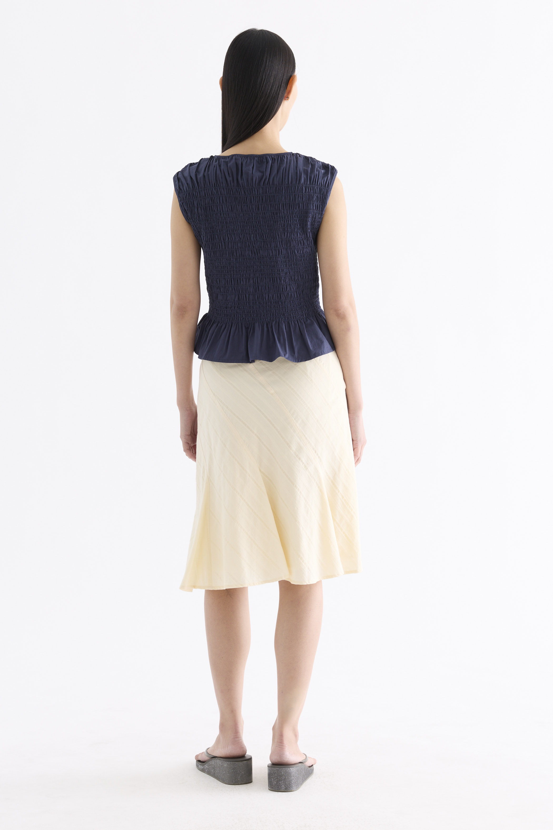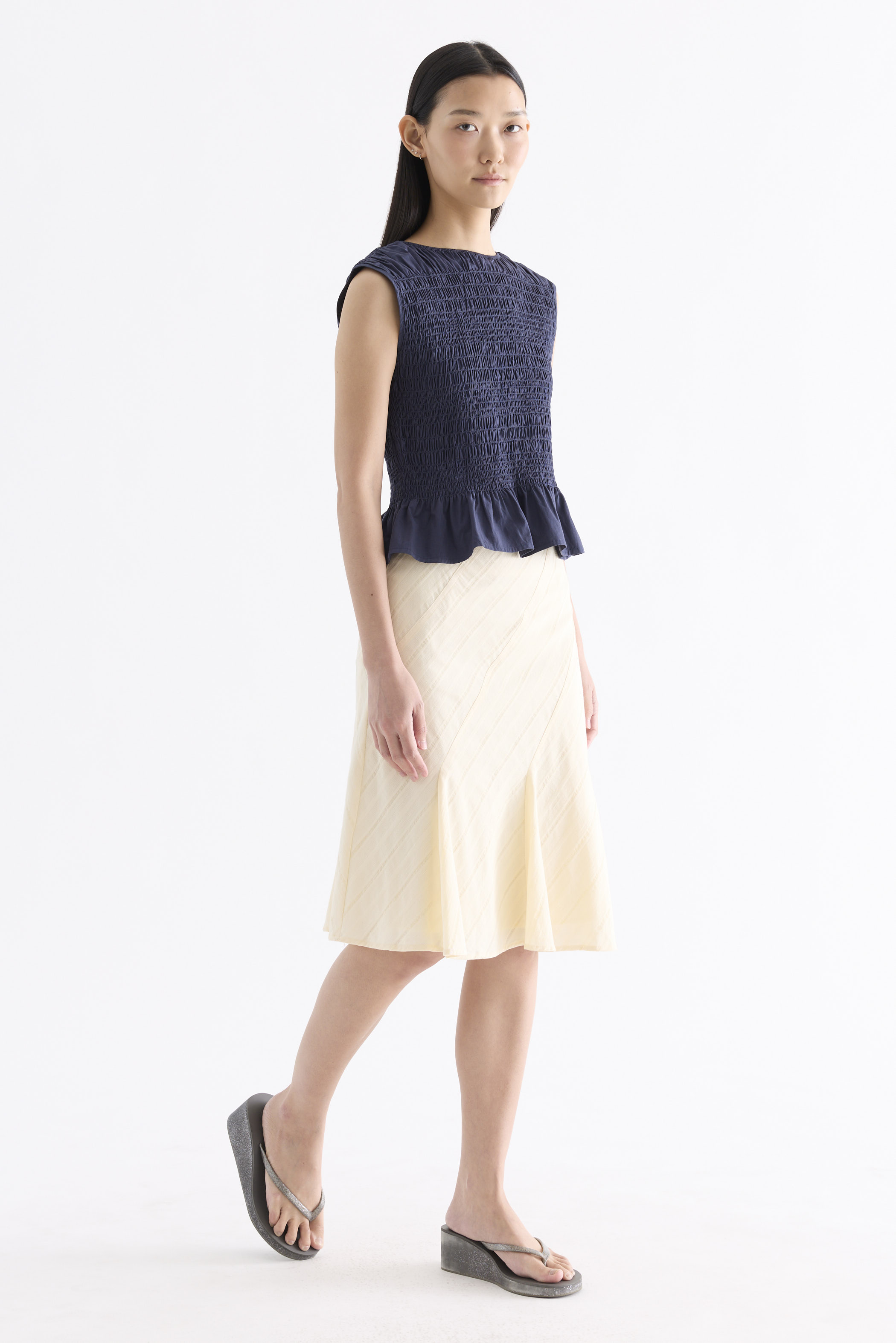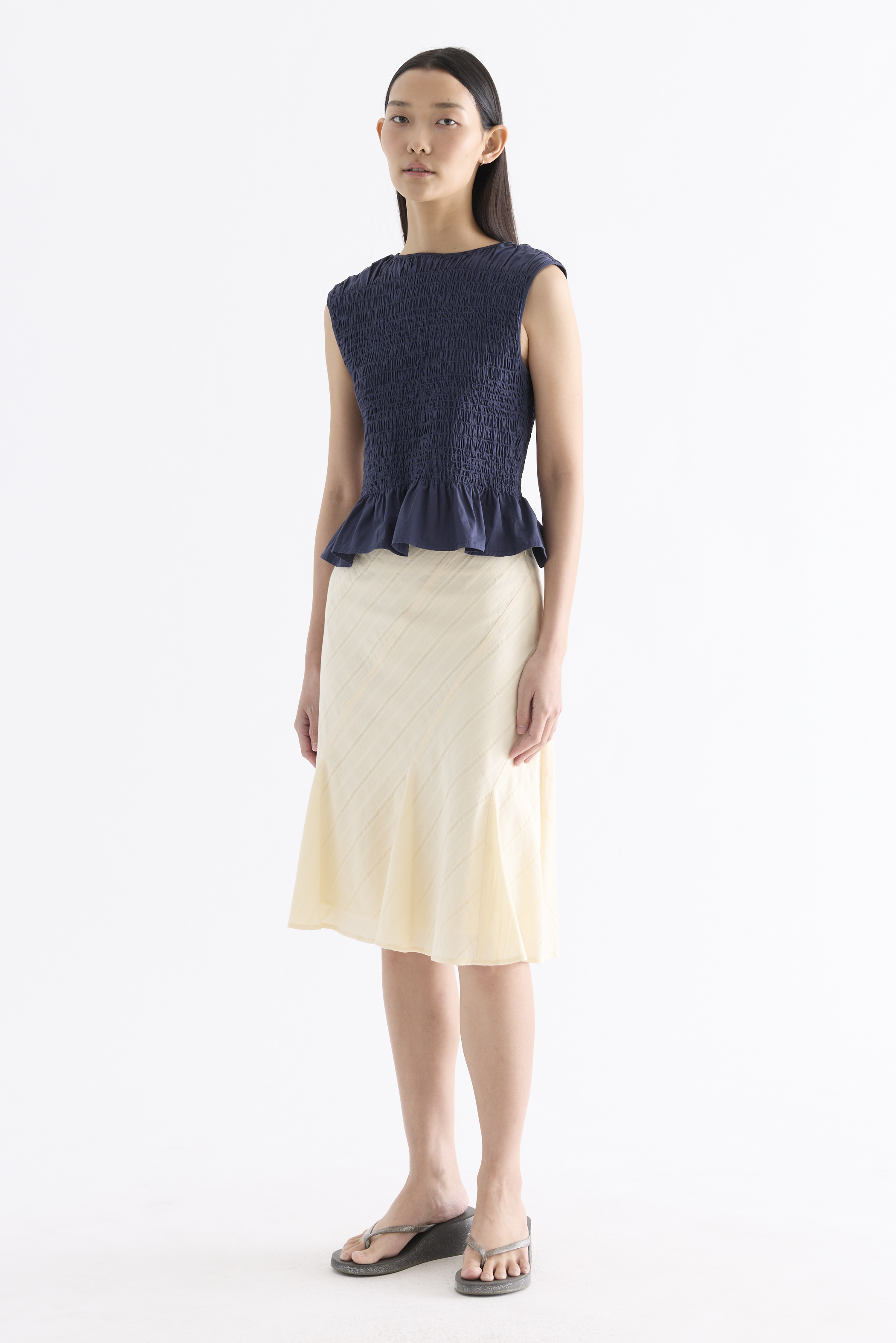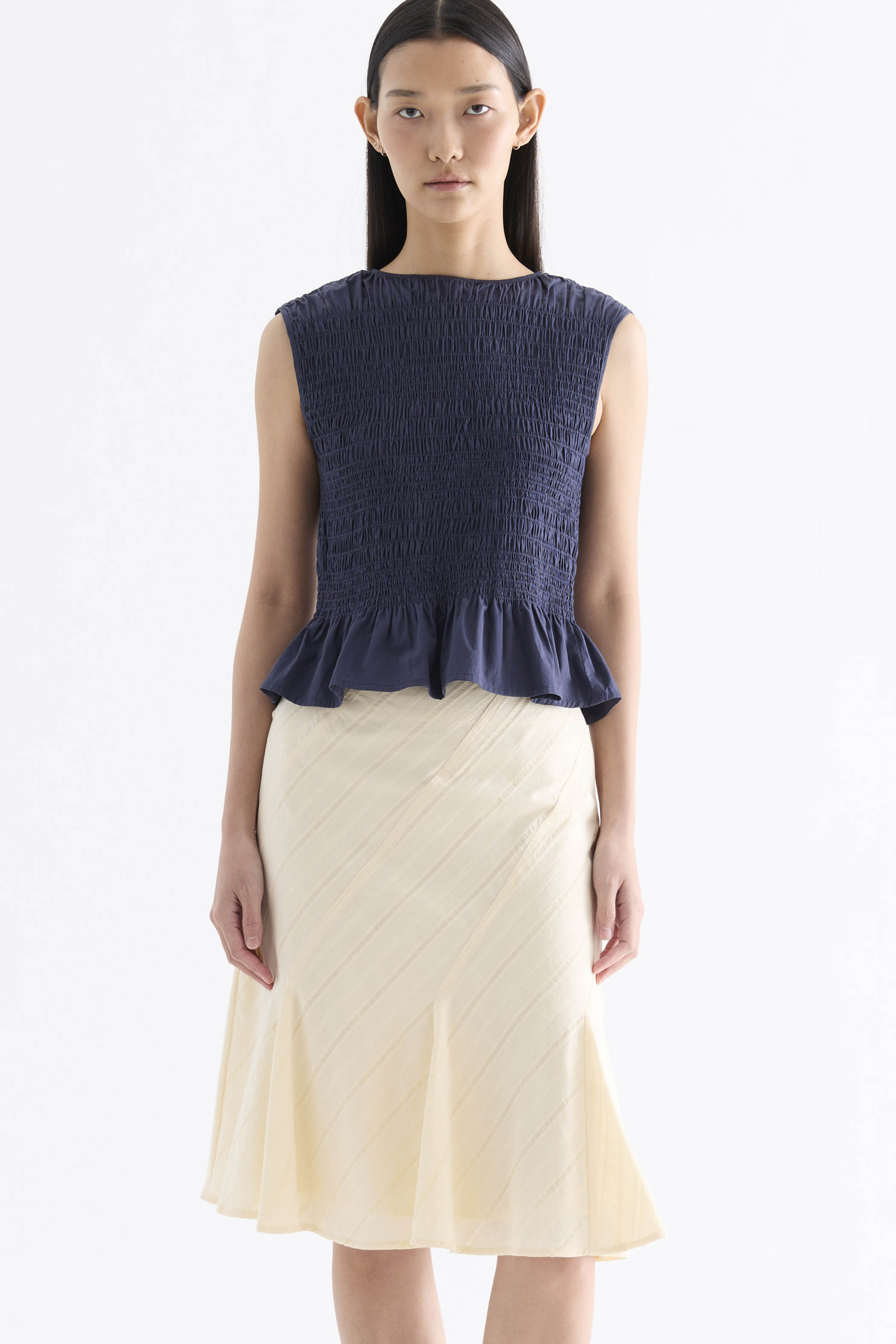 But first, textures. Cut from crisp and softly structured cotton, this sleeveless top features a smocked bodice, gathered round neckline and frilled hem. Fits slim.