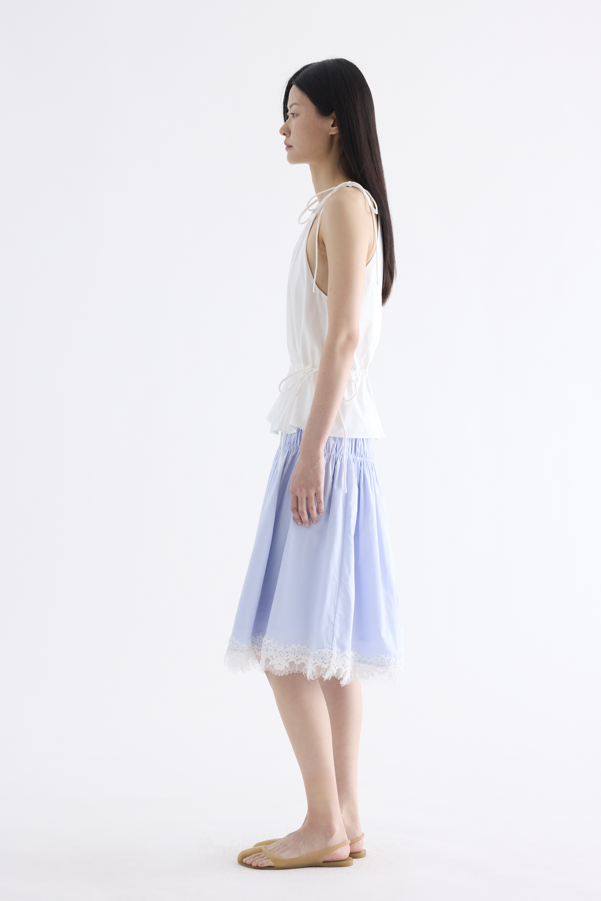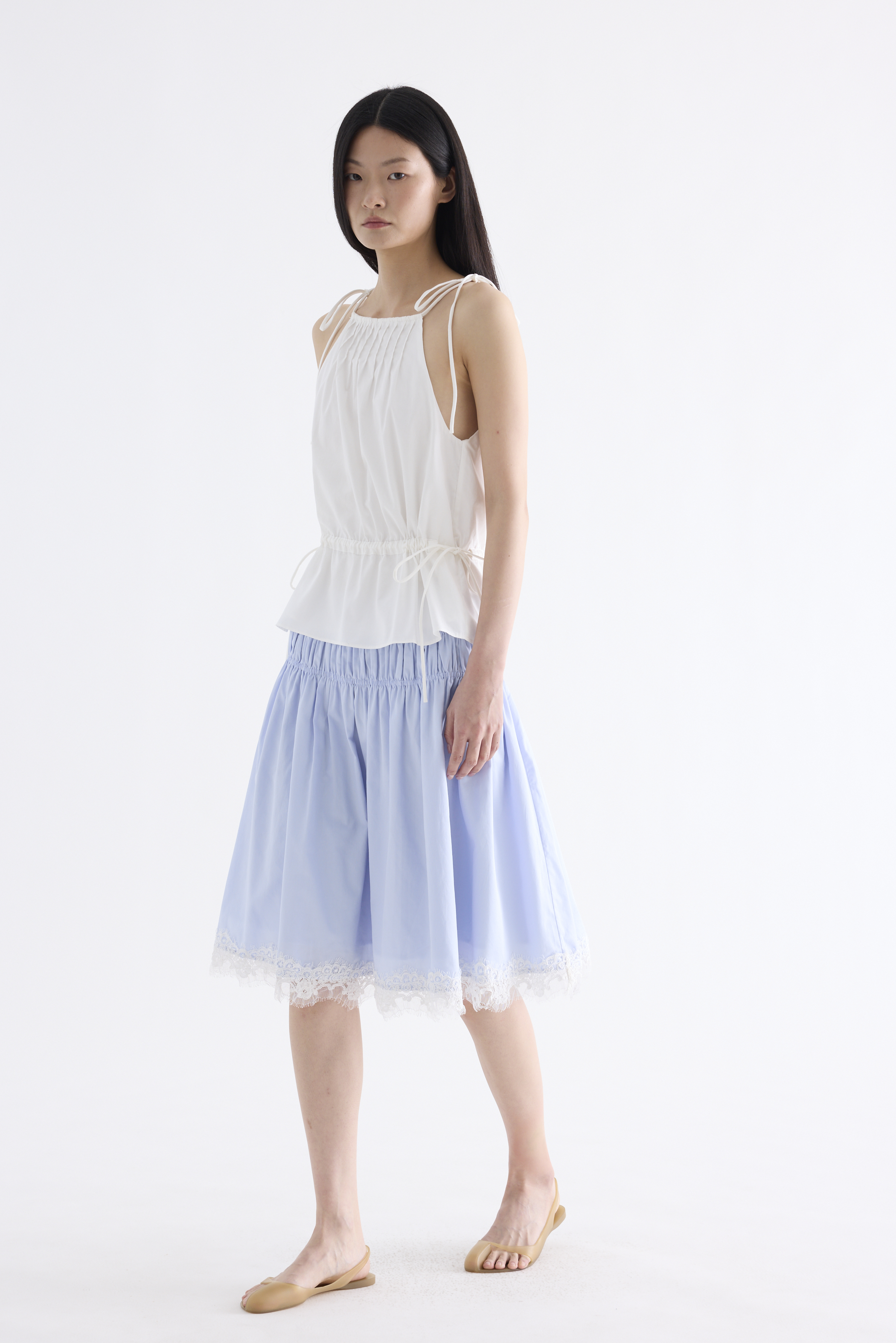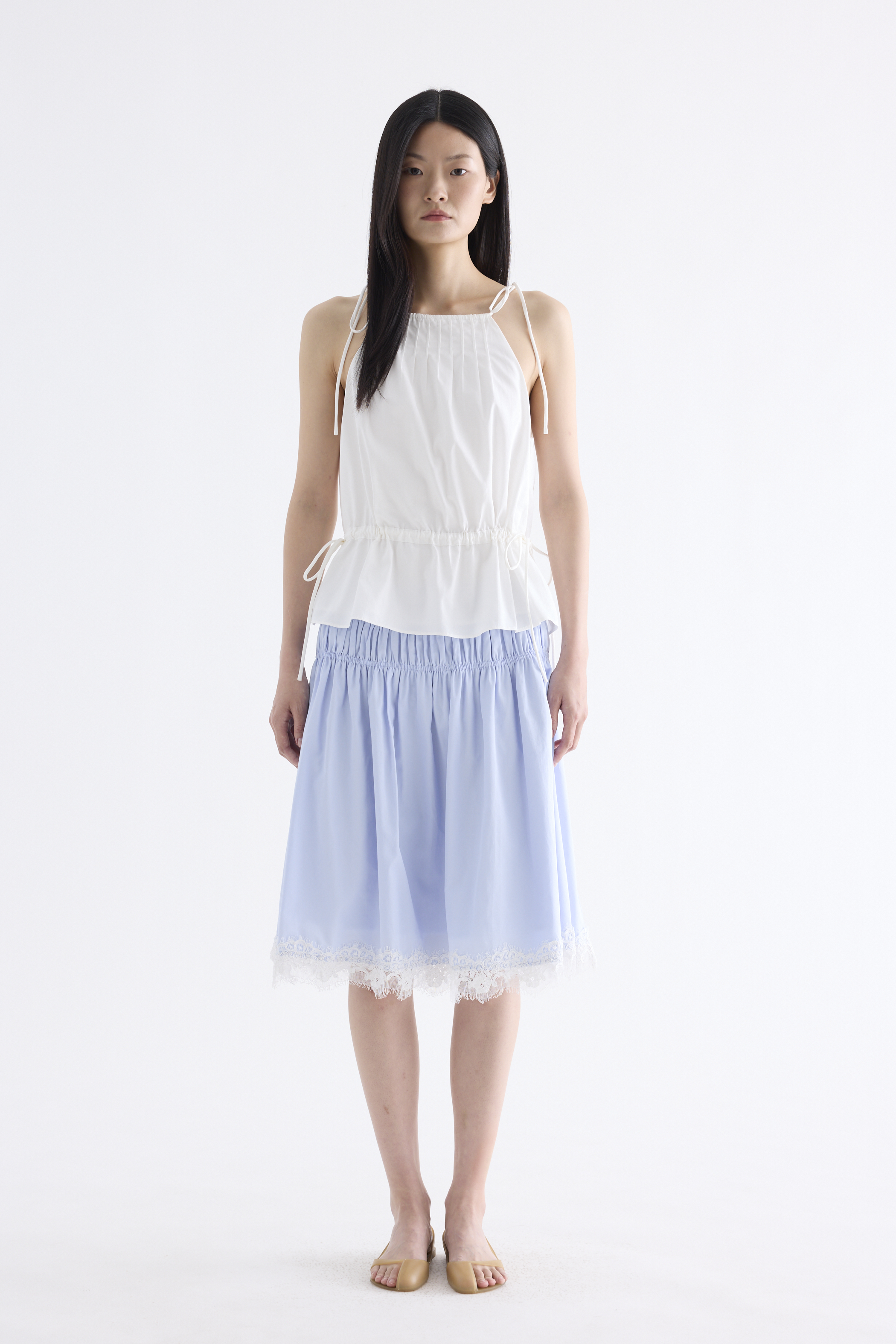 From the Postscript collection. Cut from soft and smooth cotton, this sleeveless top features an adjustable drawstring halter neckline, self-tying shoulder straps, front pleats and a statement back slit. Its fit is adjustable via a drawstring waist-tie.
