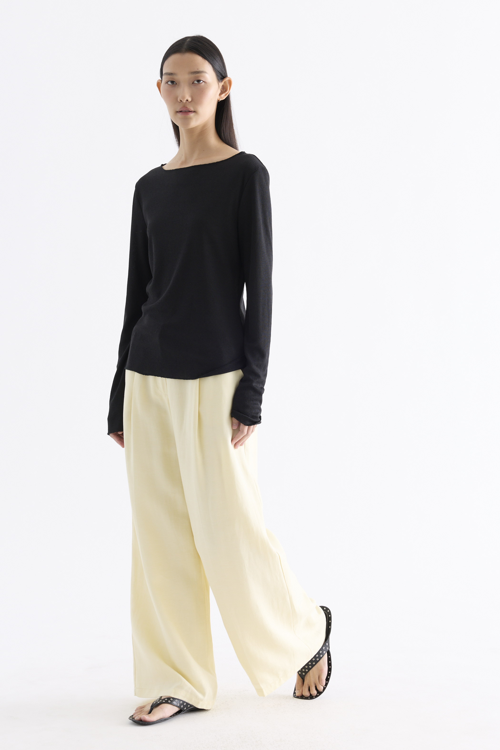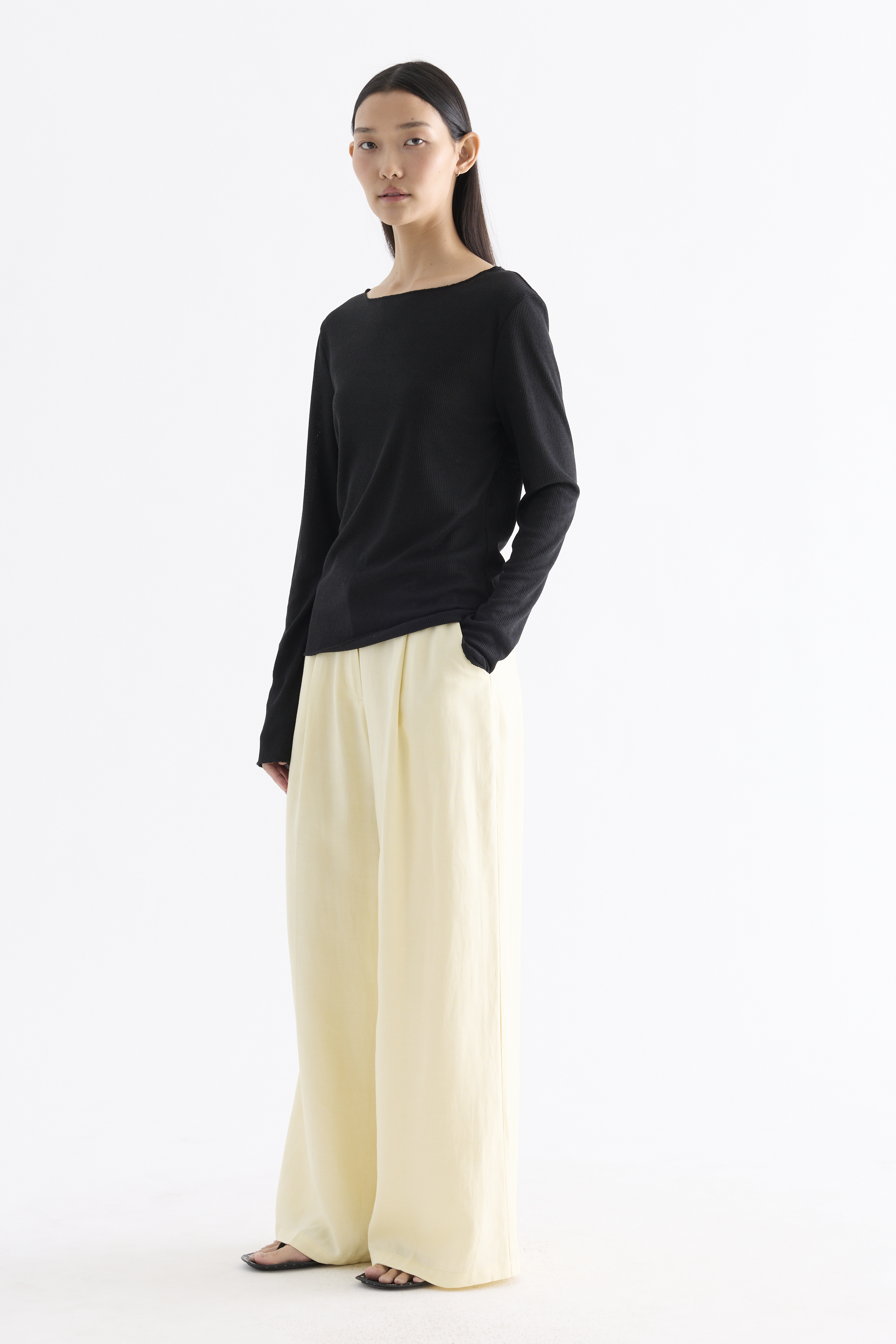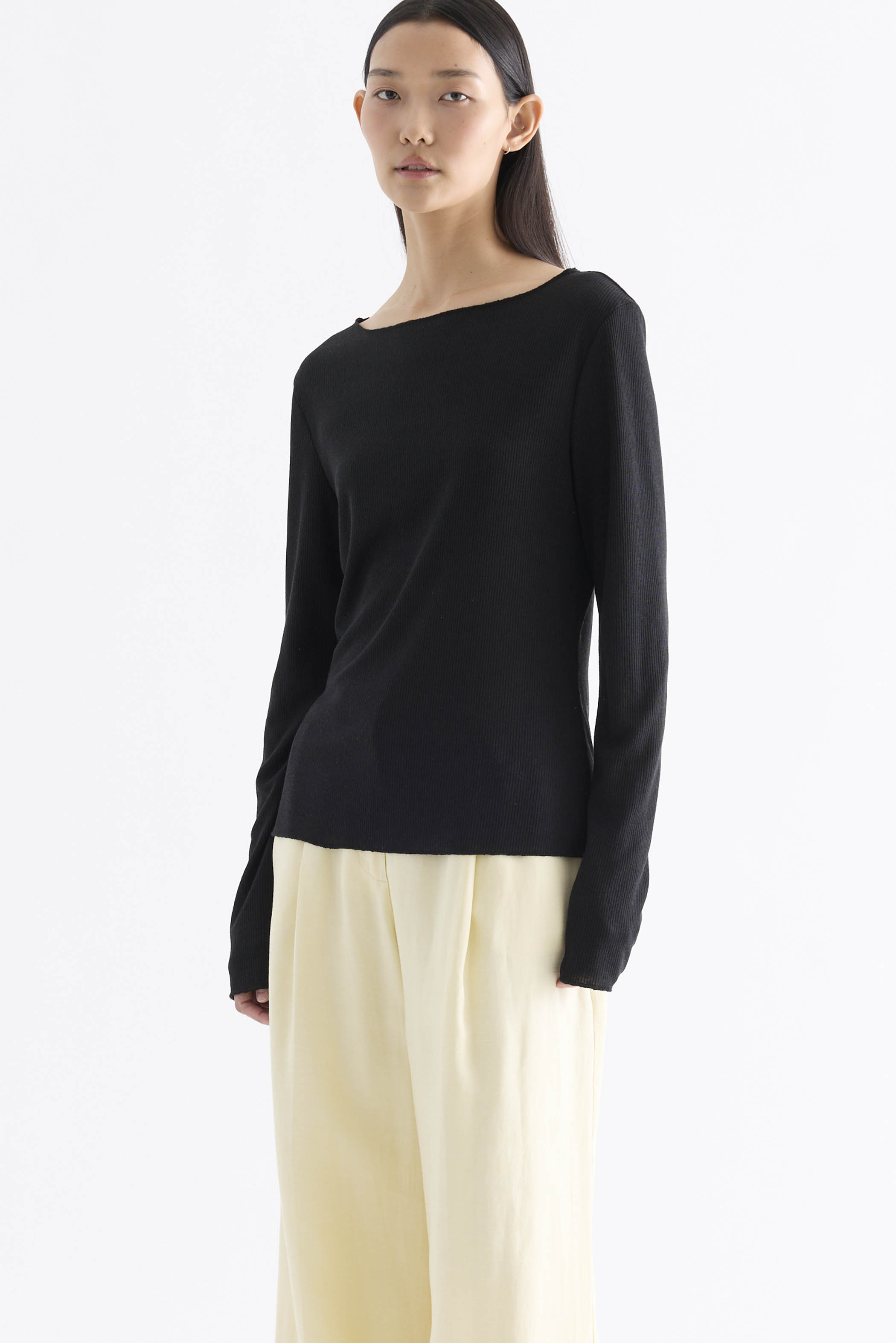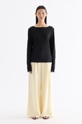 Sheer to impress. Made from soft and light fabric, this top features a wide neckline, long sleeves and a relaxed fit.
