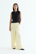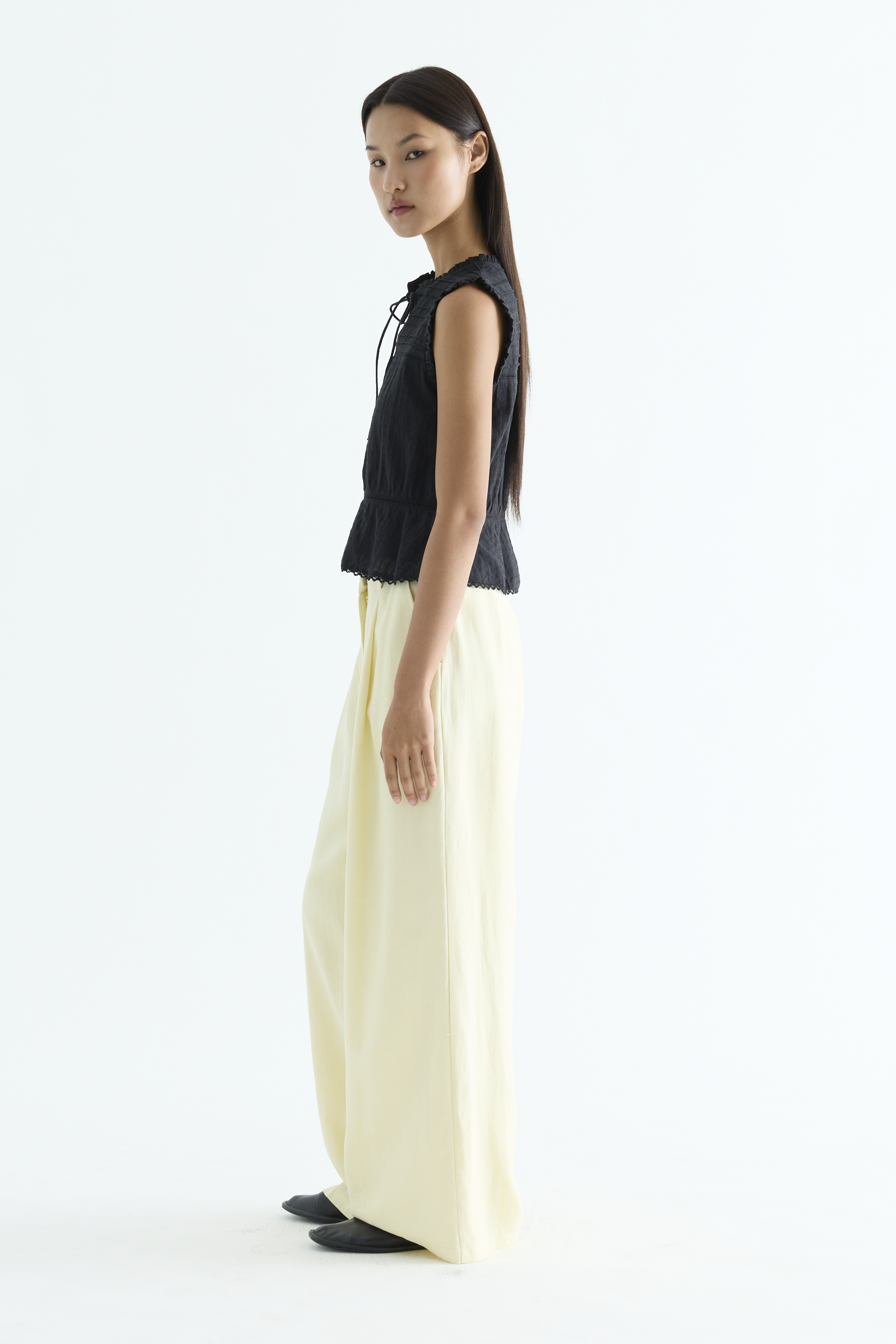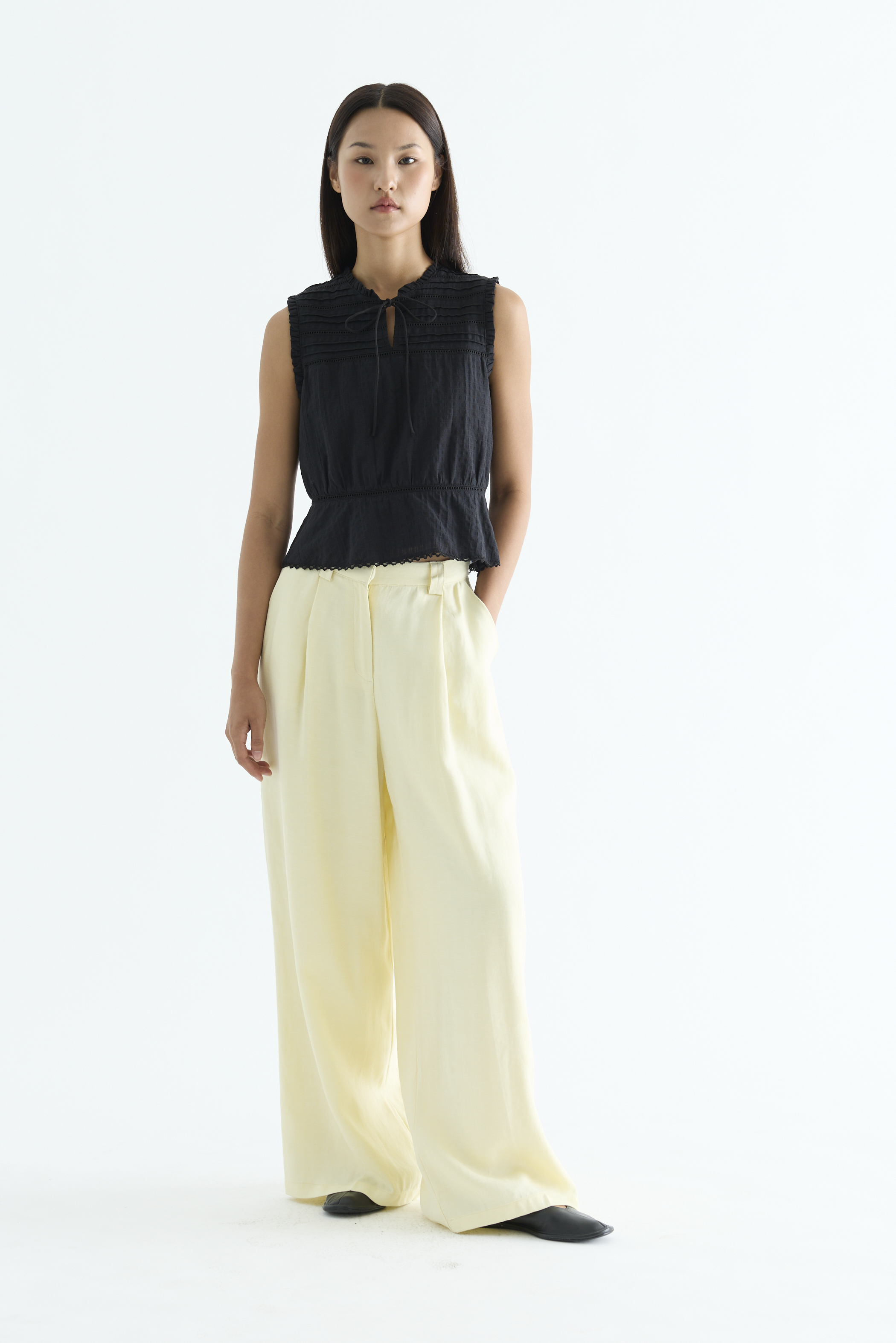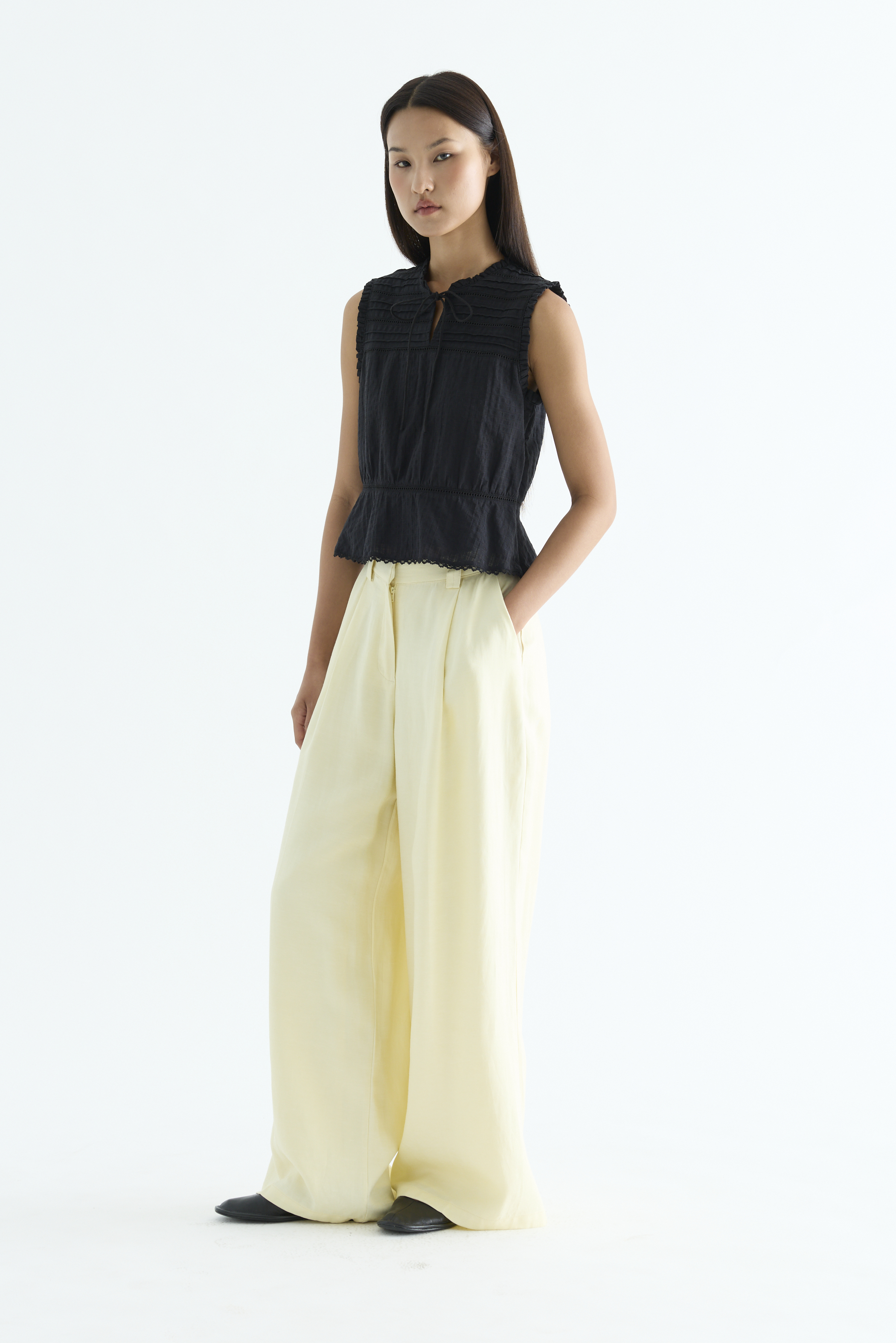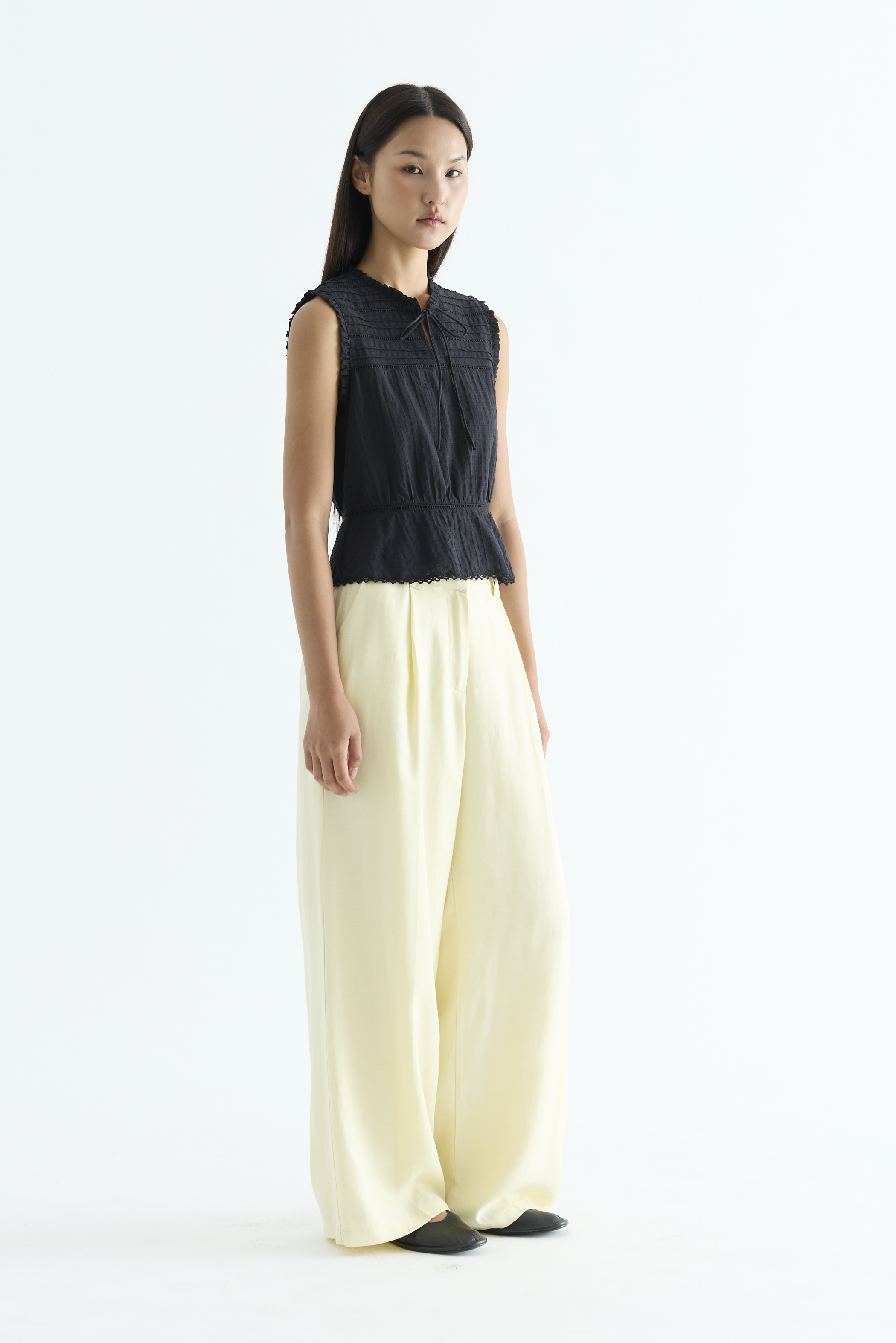 Warm-weather approved. Cut from airy and softly structured seersucker cotton, this top features a frill-trimmed neckline, front keyhole opening with tie-strap, pleat and lace detailing, as well as a lace-trimmed hem. Worn in a slim fit with a side zip closure.