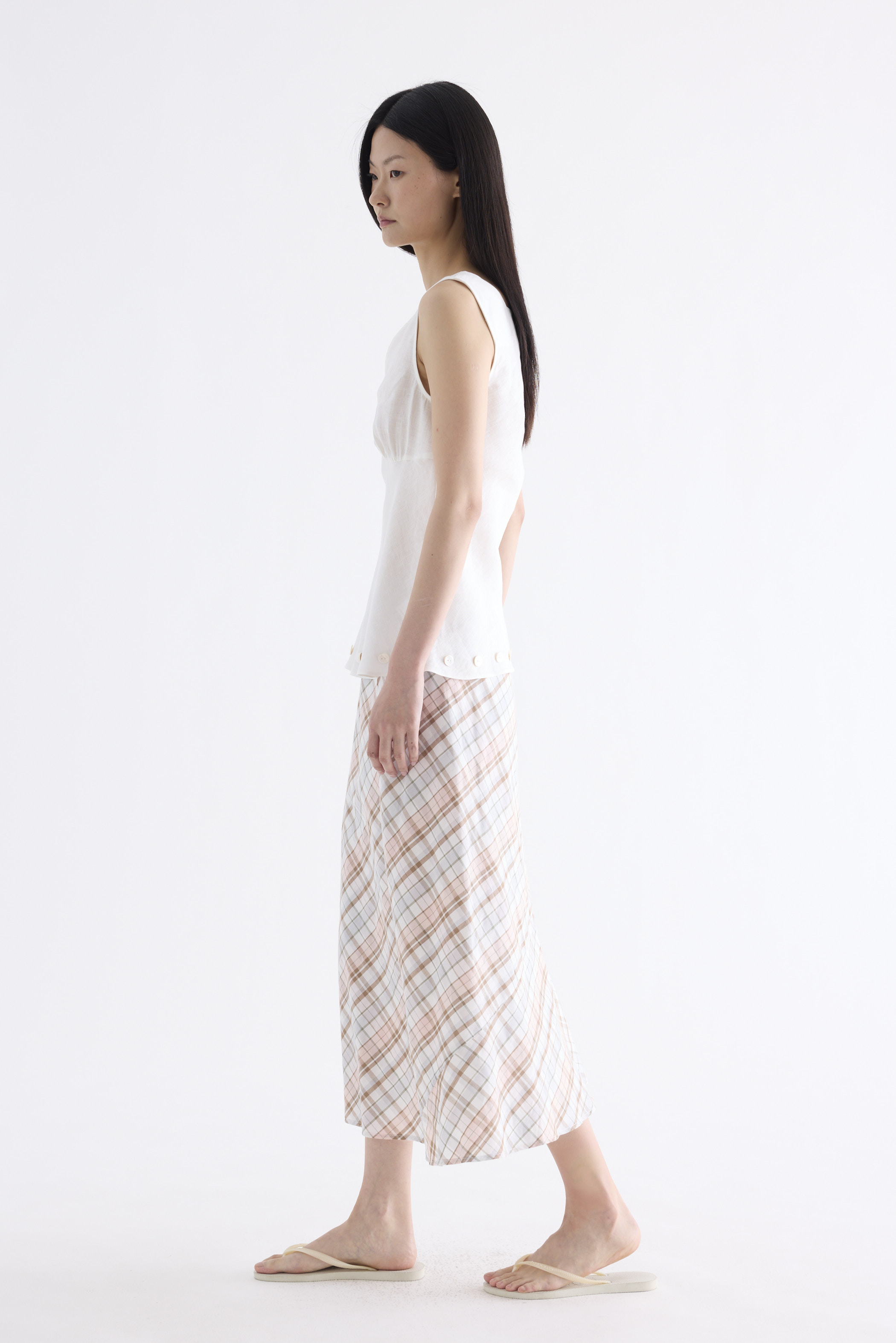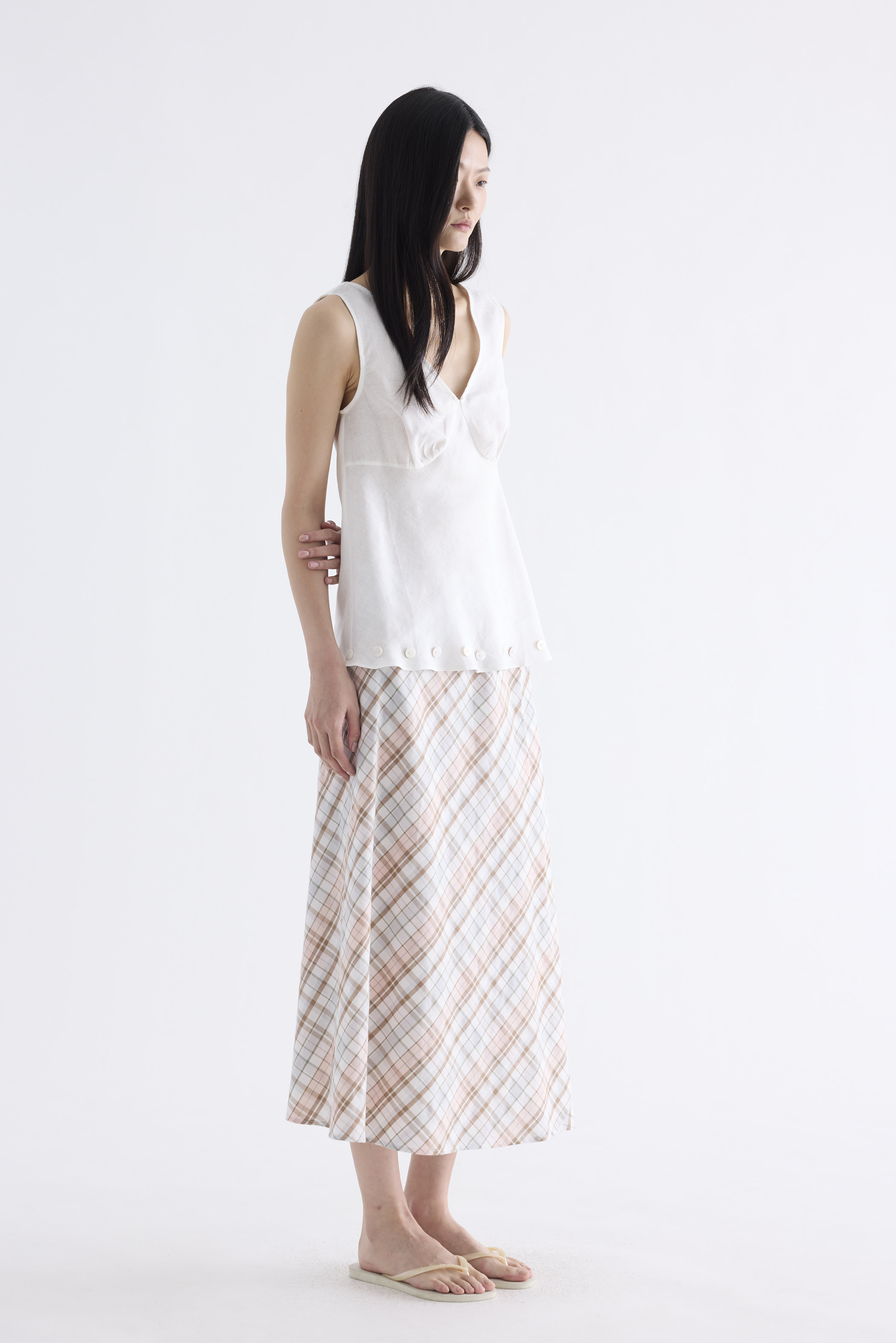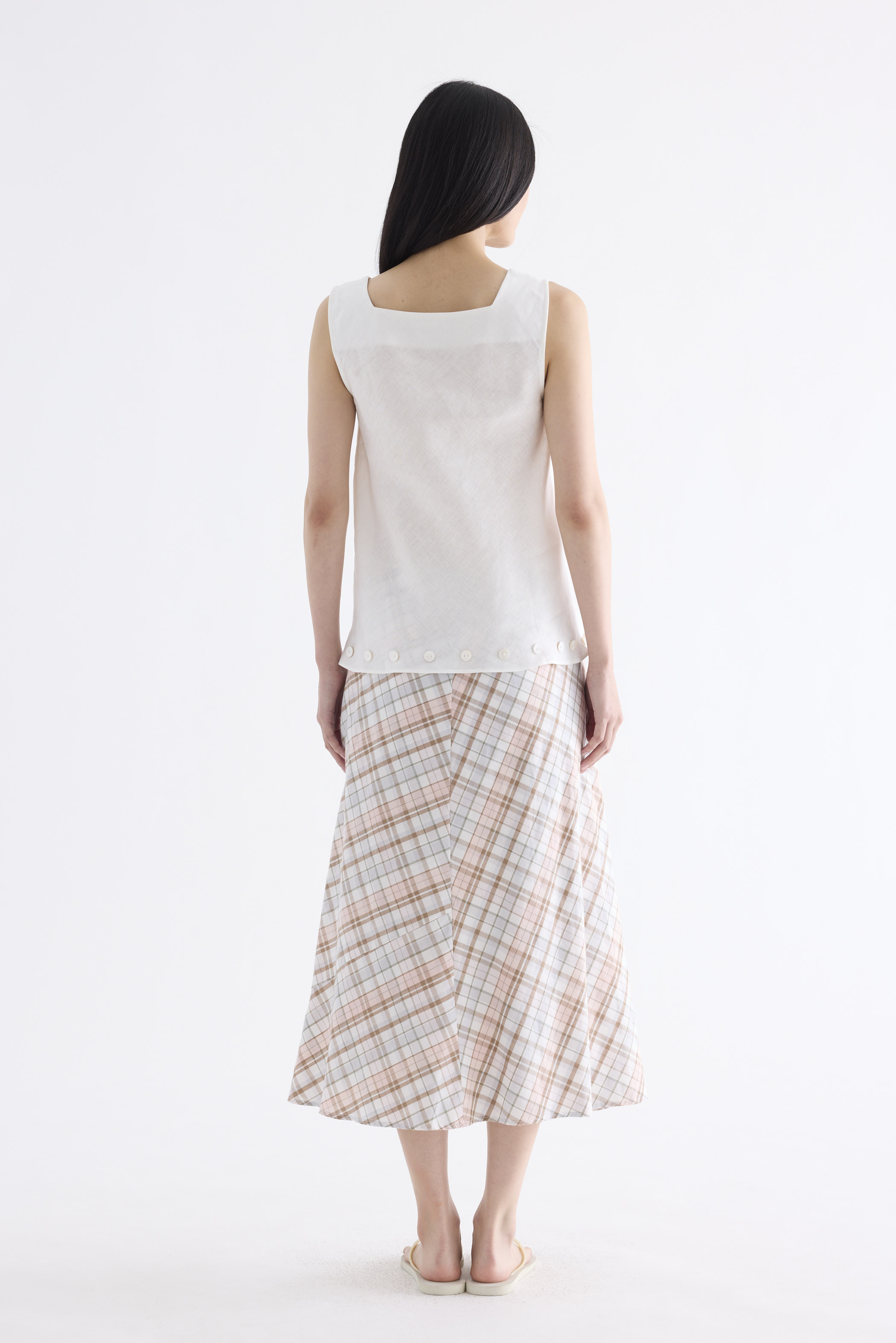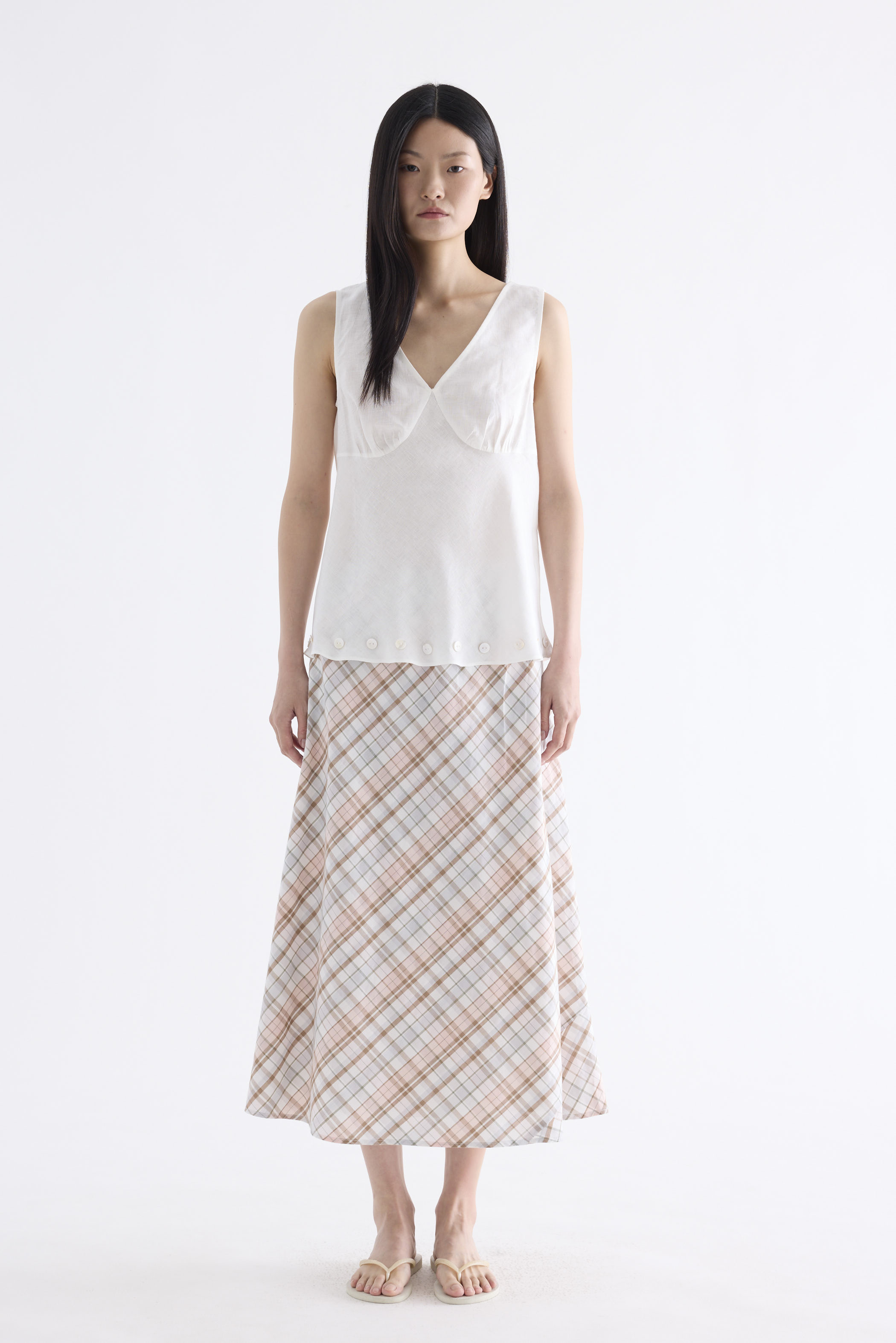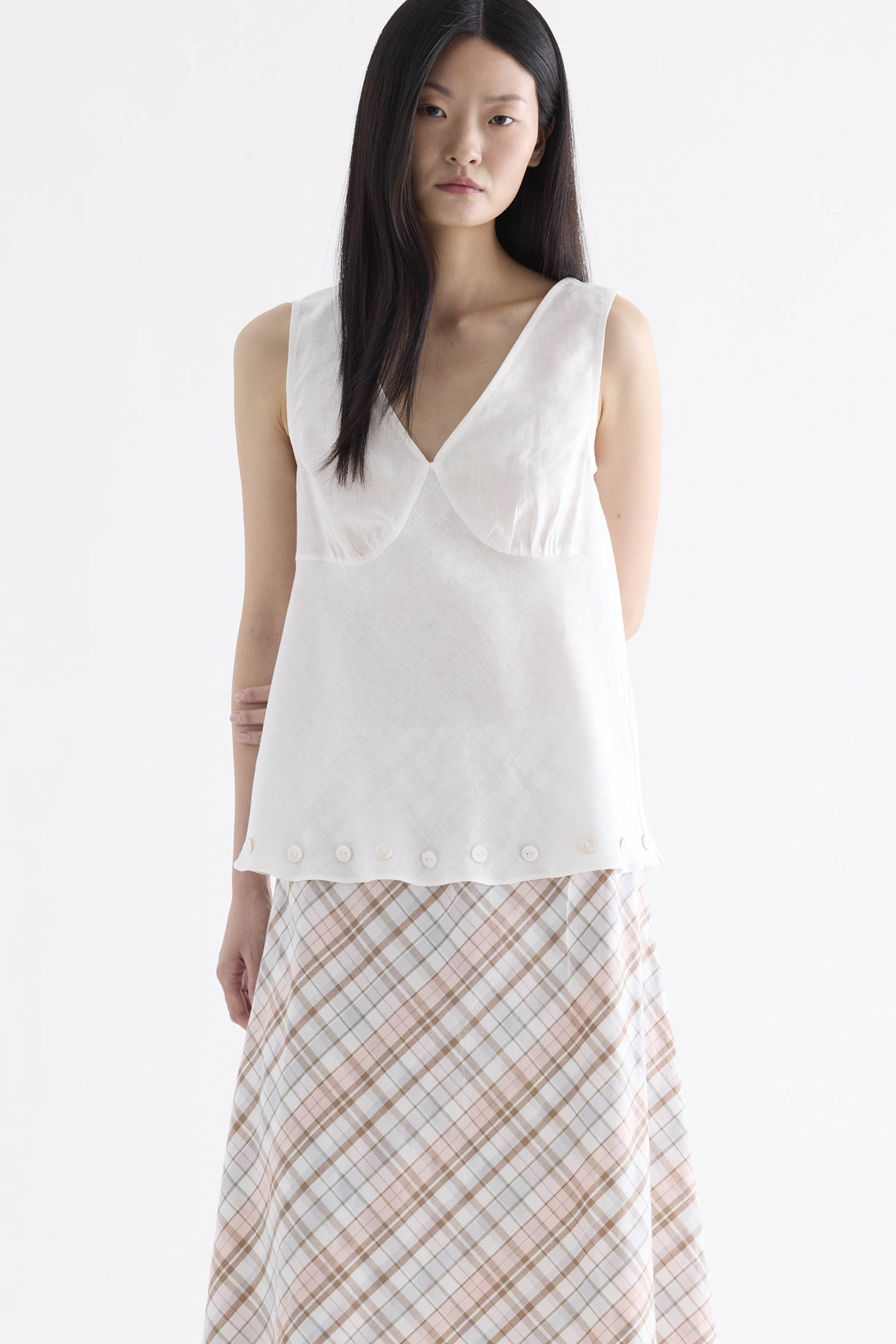 From the Postscript collection. Cut from light and airy 100% linen, this sleeveless top features a V-neckline, ruched bust and decorative buttons along its hem. Worn in a relaxed fit, with a gentle flare.