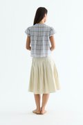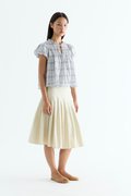 Here for the flare. Cut from crisp and softly structured cotton, this top features a frill-trimmed neckline, front opening with tie-strap, pin-tuck pleats and elasticated puffy sleeves. Worn in a relaxed swing silhouette.