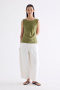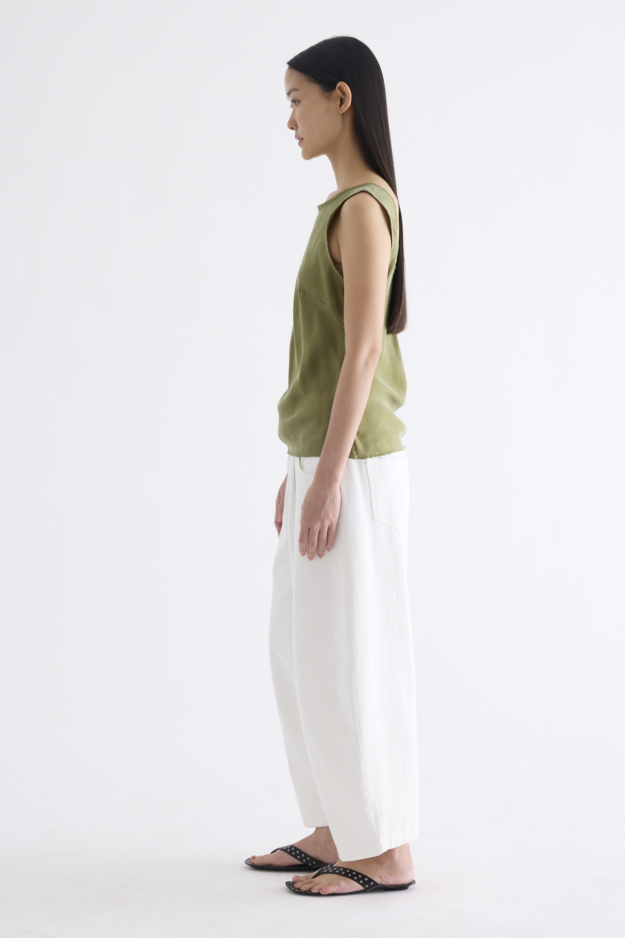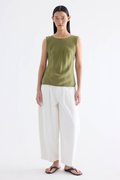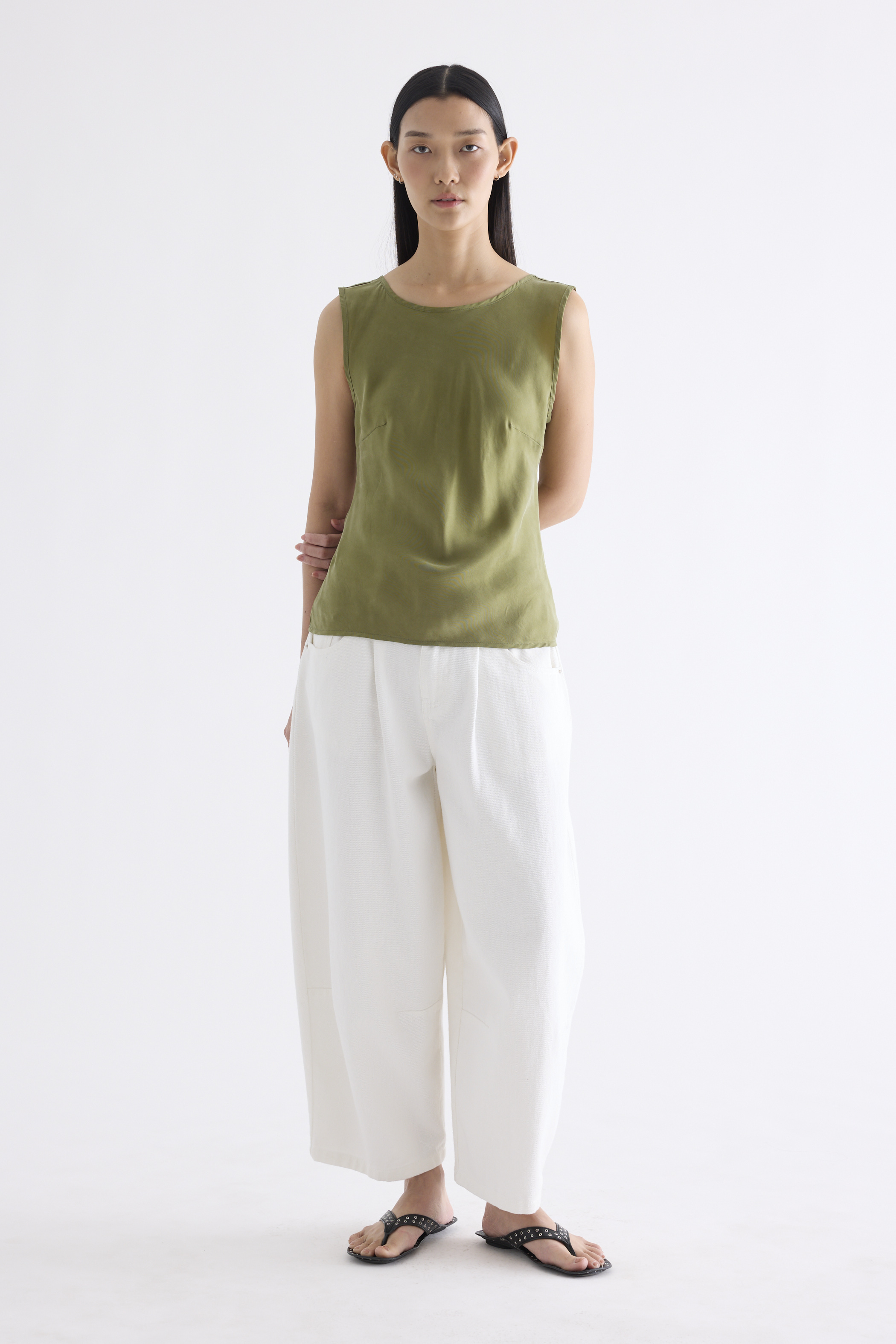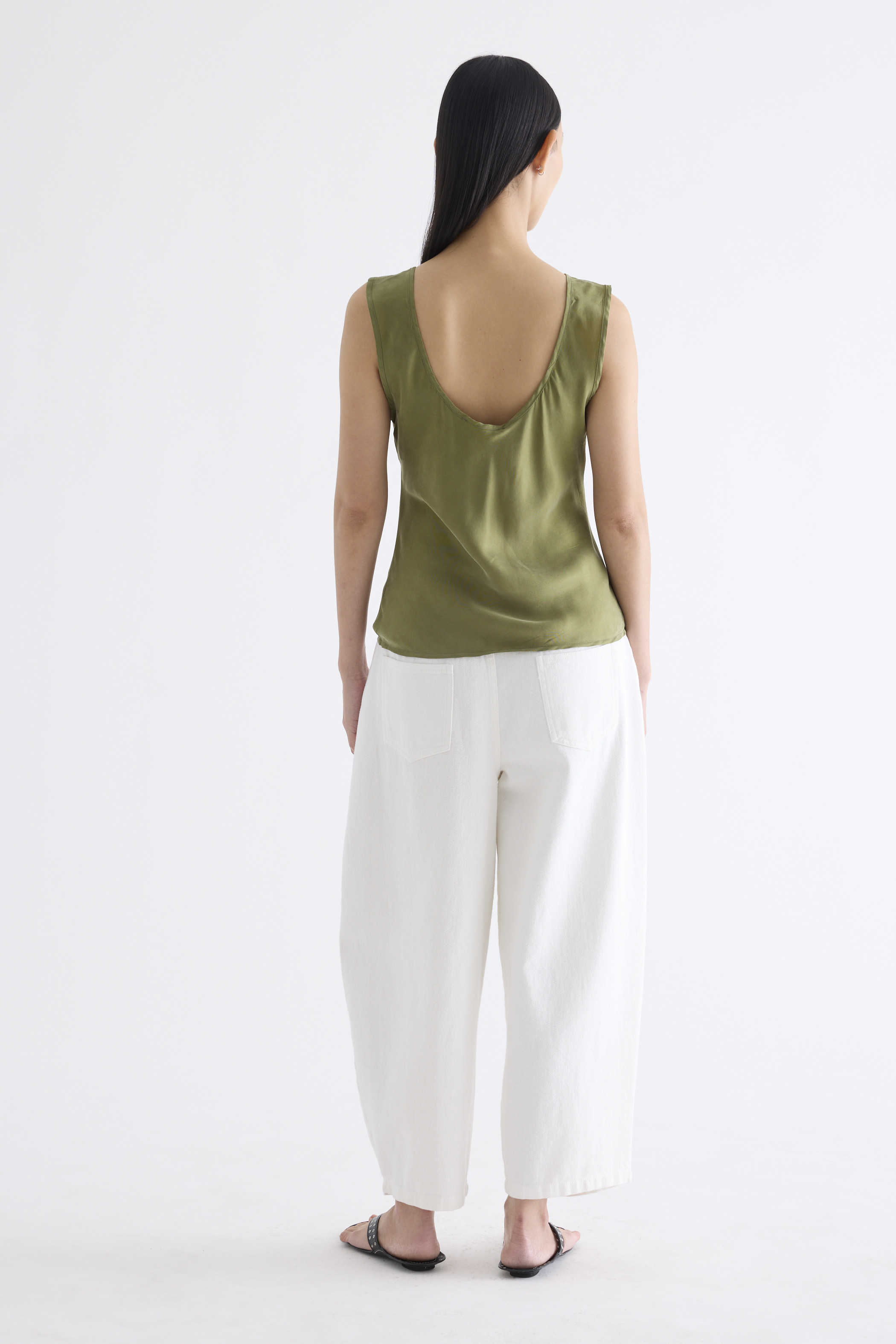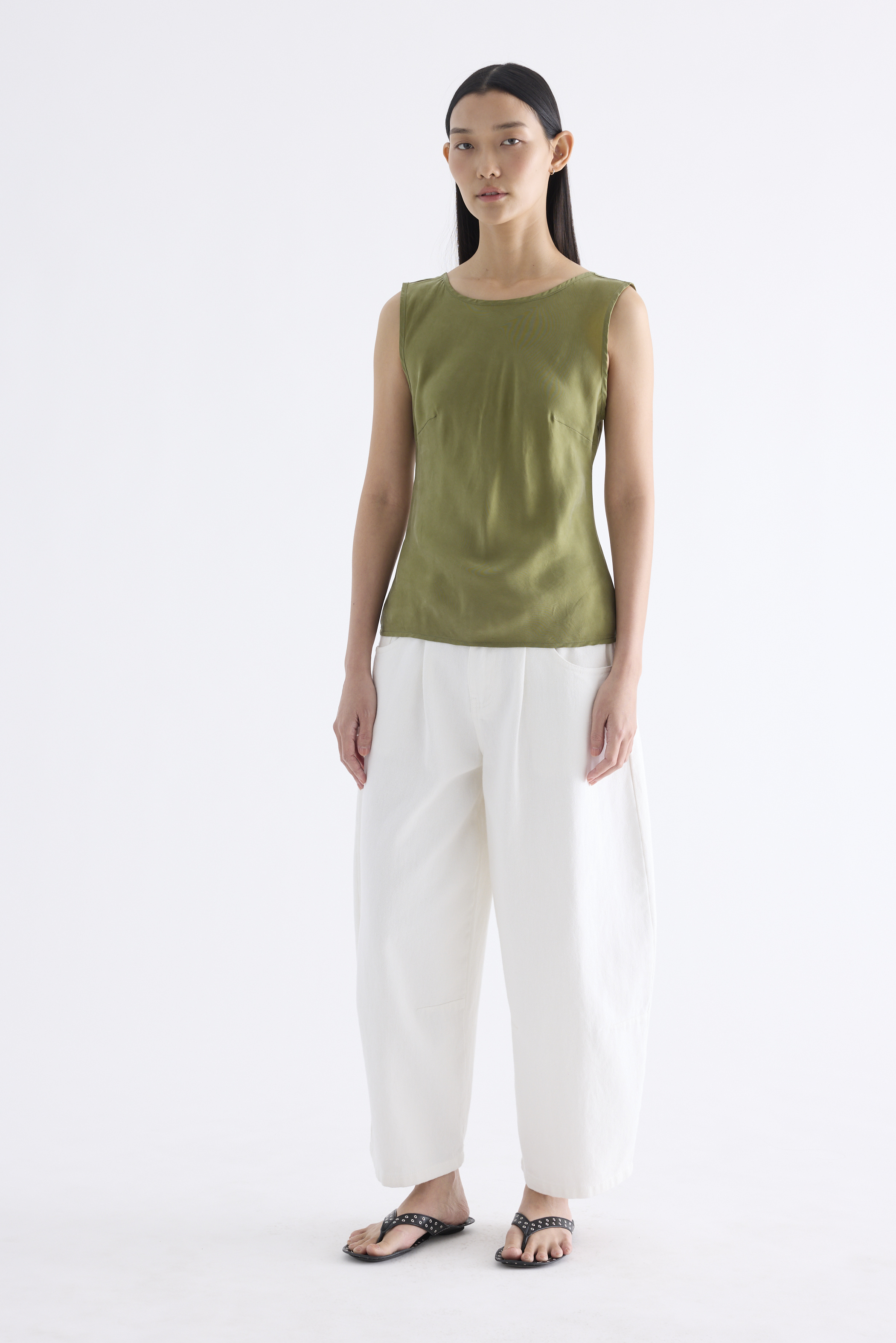 Fluid. Made from smooth and light fabric with a soft sheen, this sleeveless top features a bias silhouette, round neckline and scooped back. Worn in a slim fit.