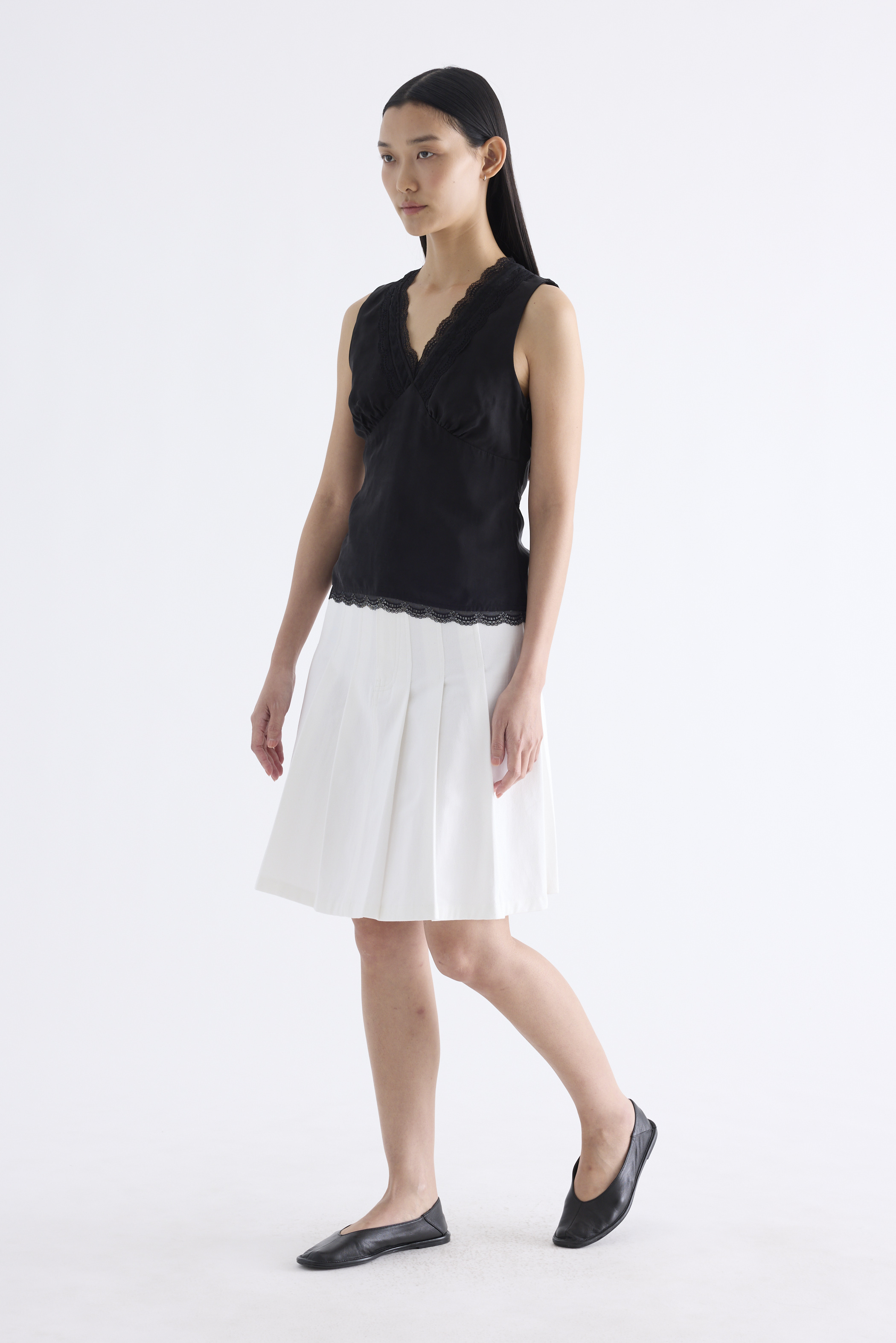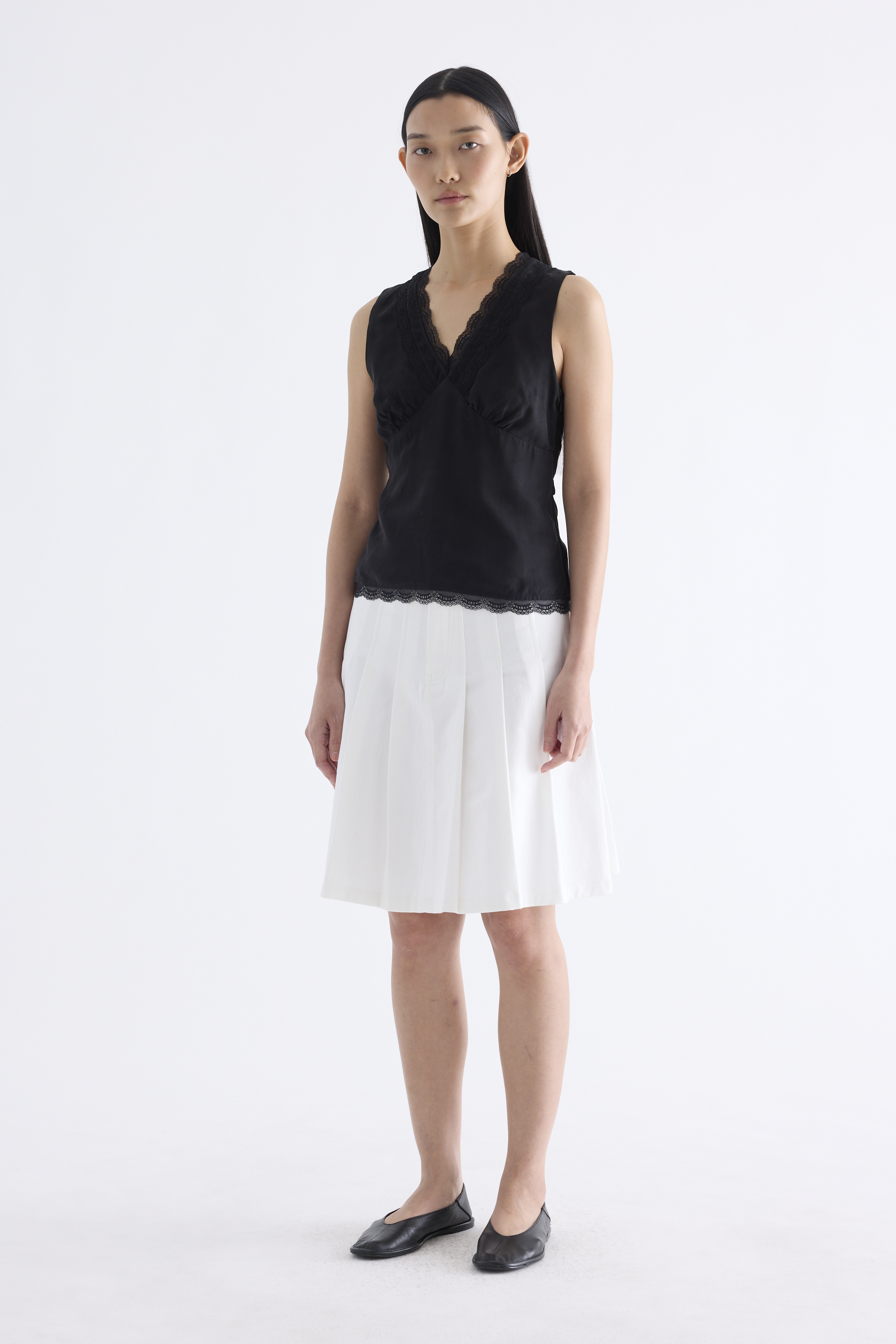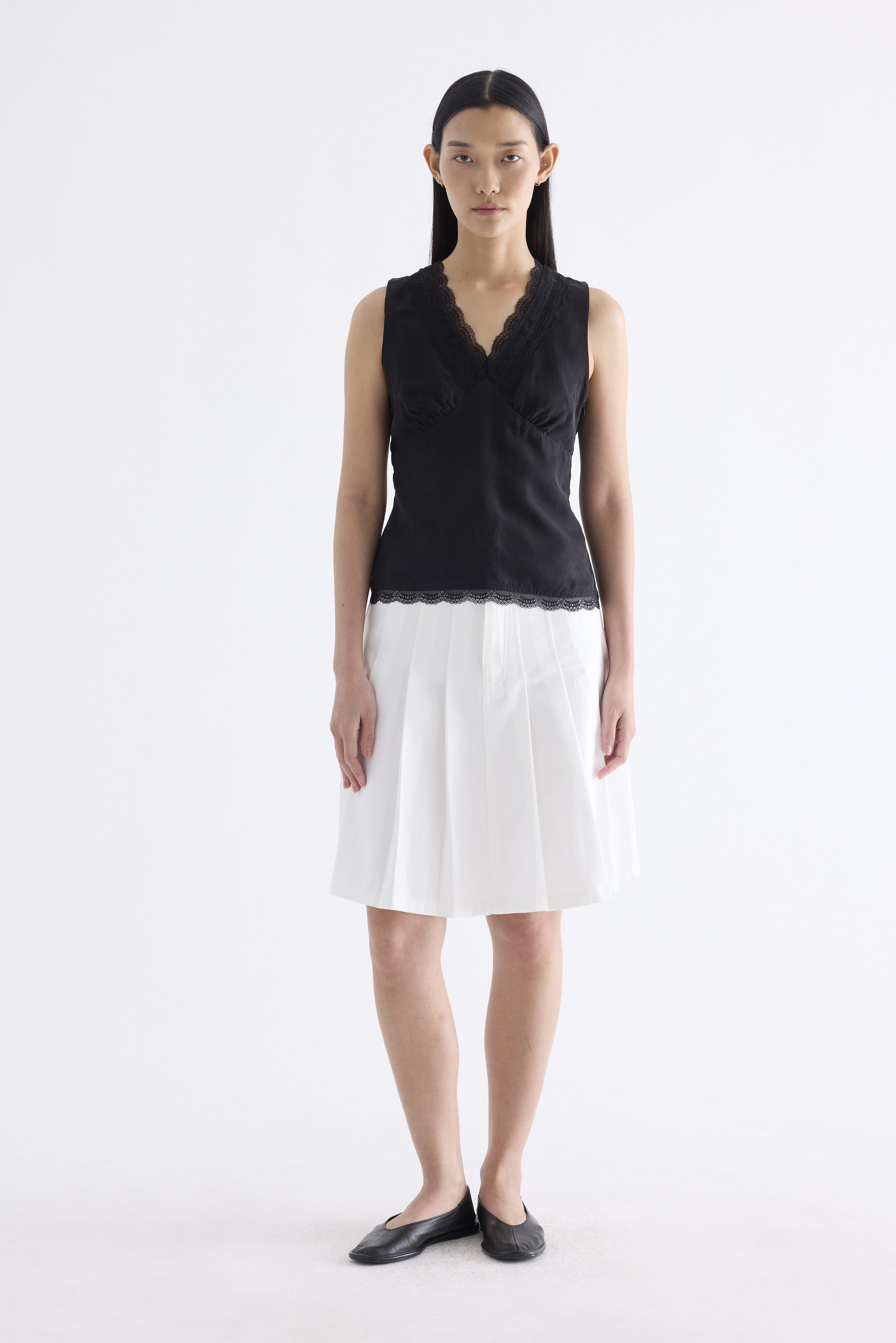 Form flattering, Made from smooth and light fabric, this sleeveless top features a lace-trimmed V-neckline, ruched bust, side zip and fitted waist with back tie straps. Worn in a slim fit.
