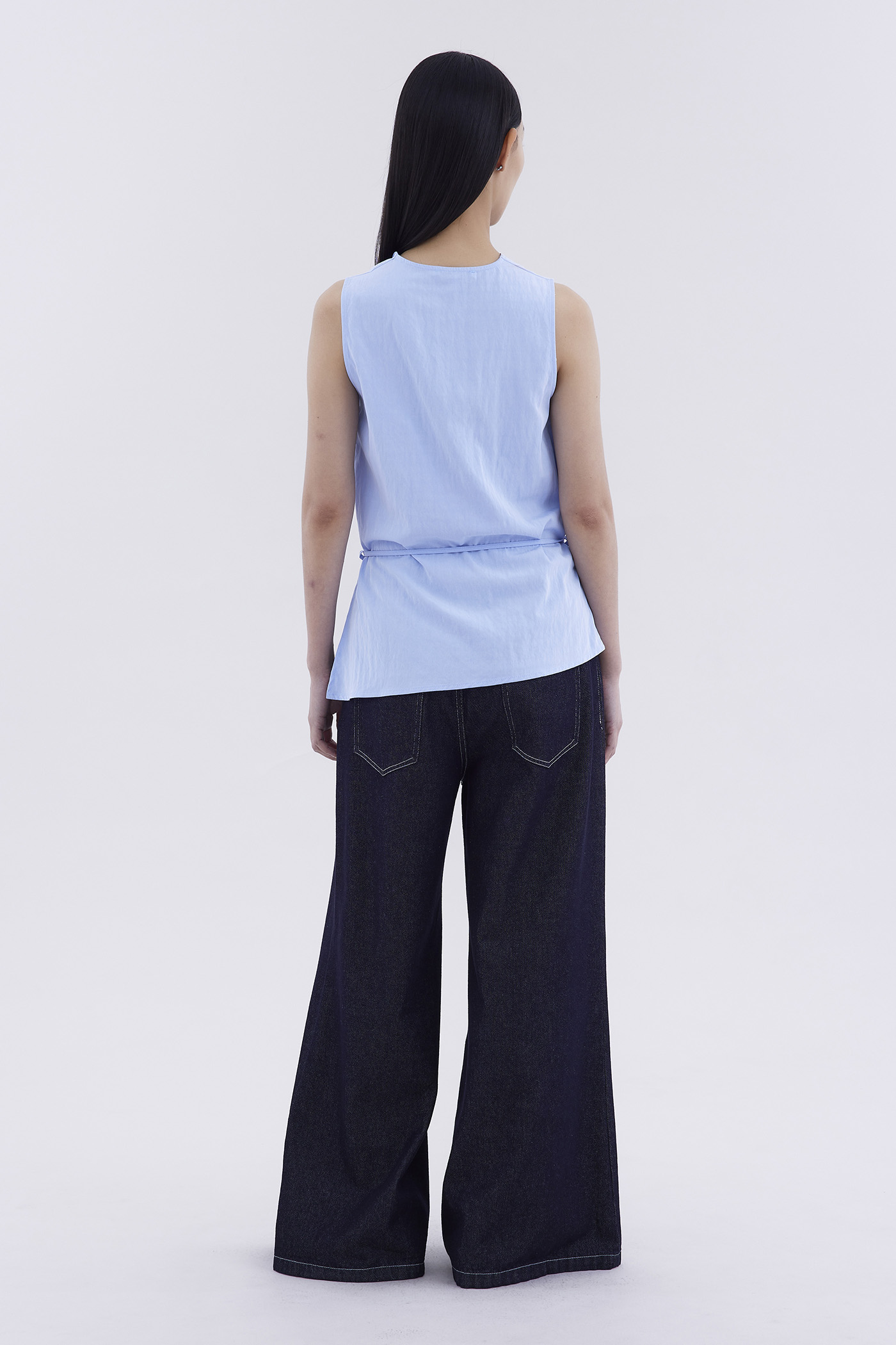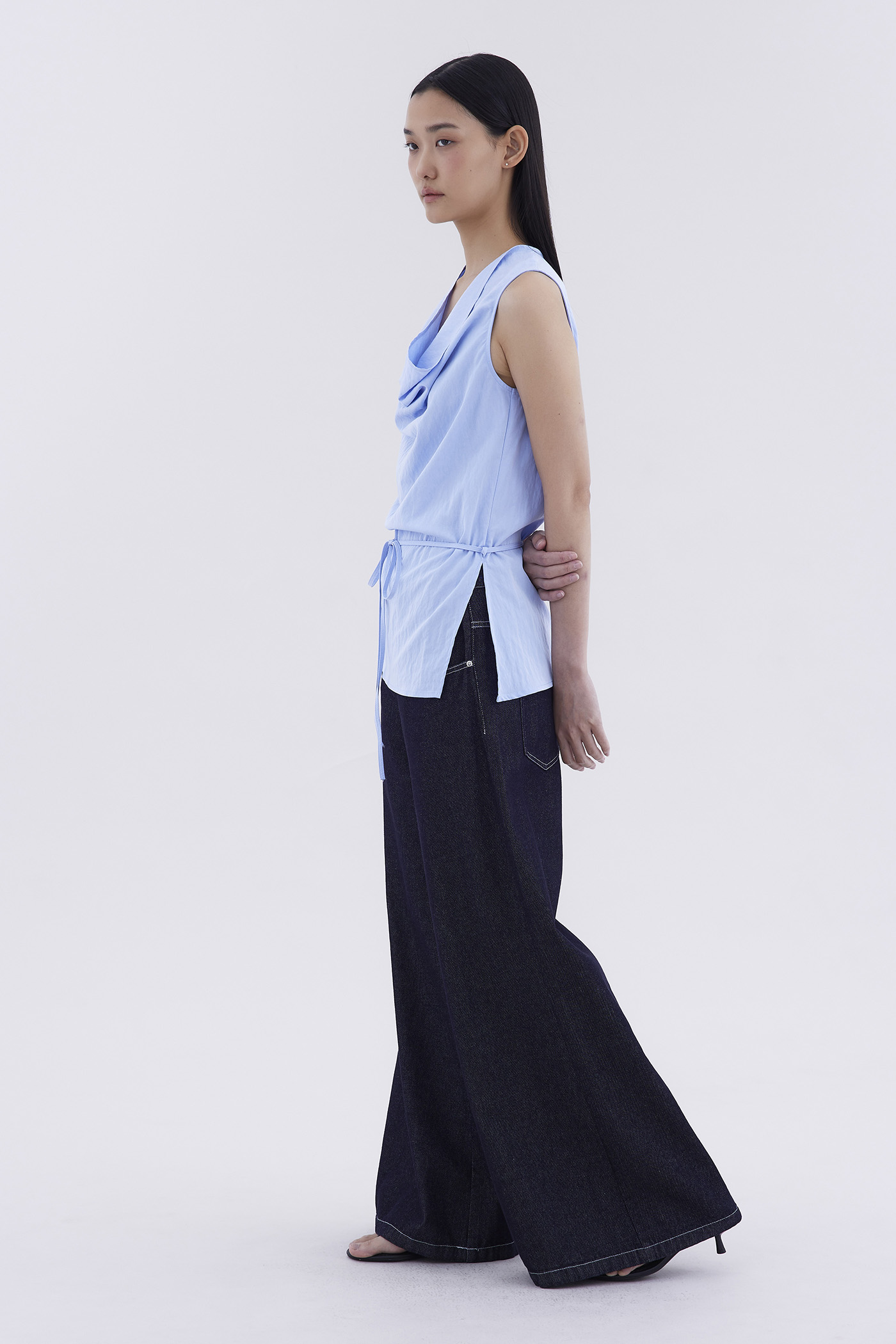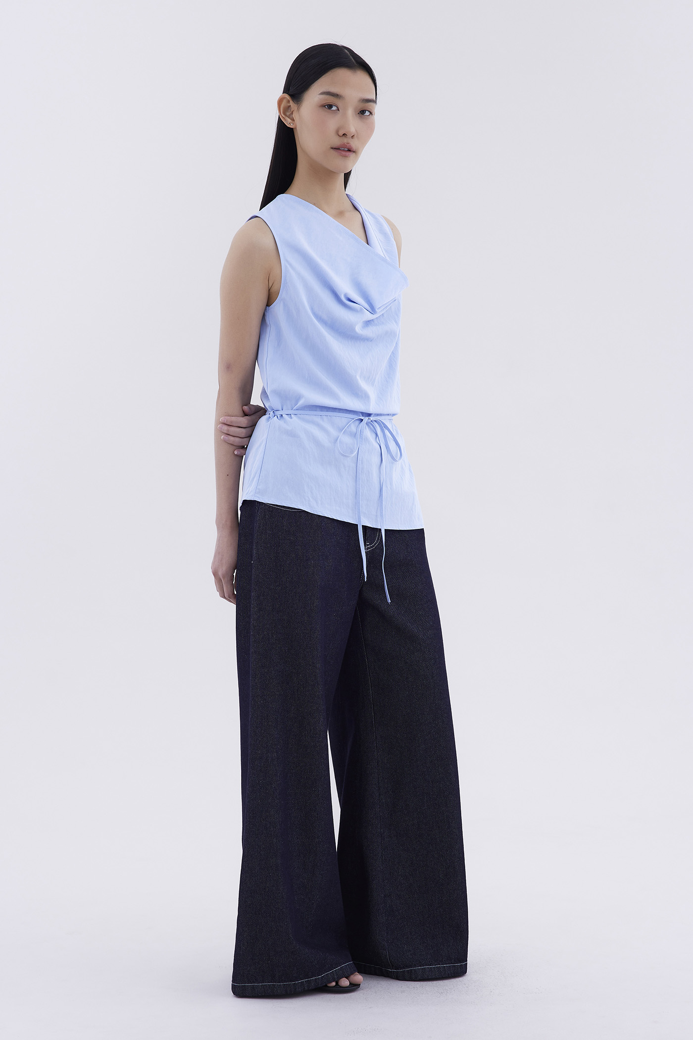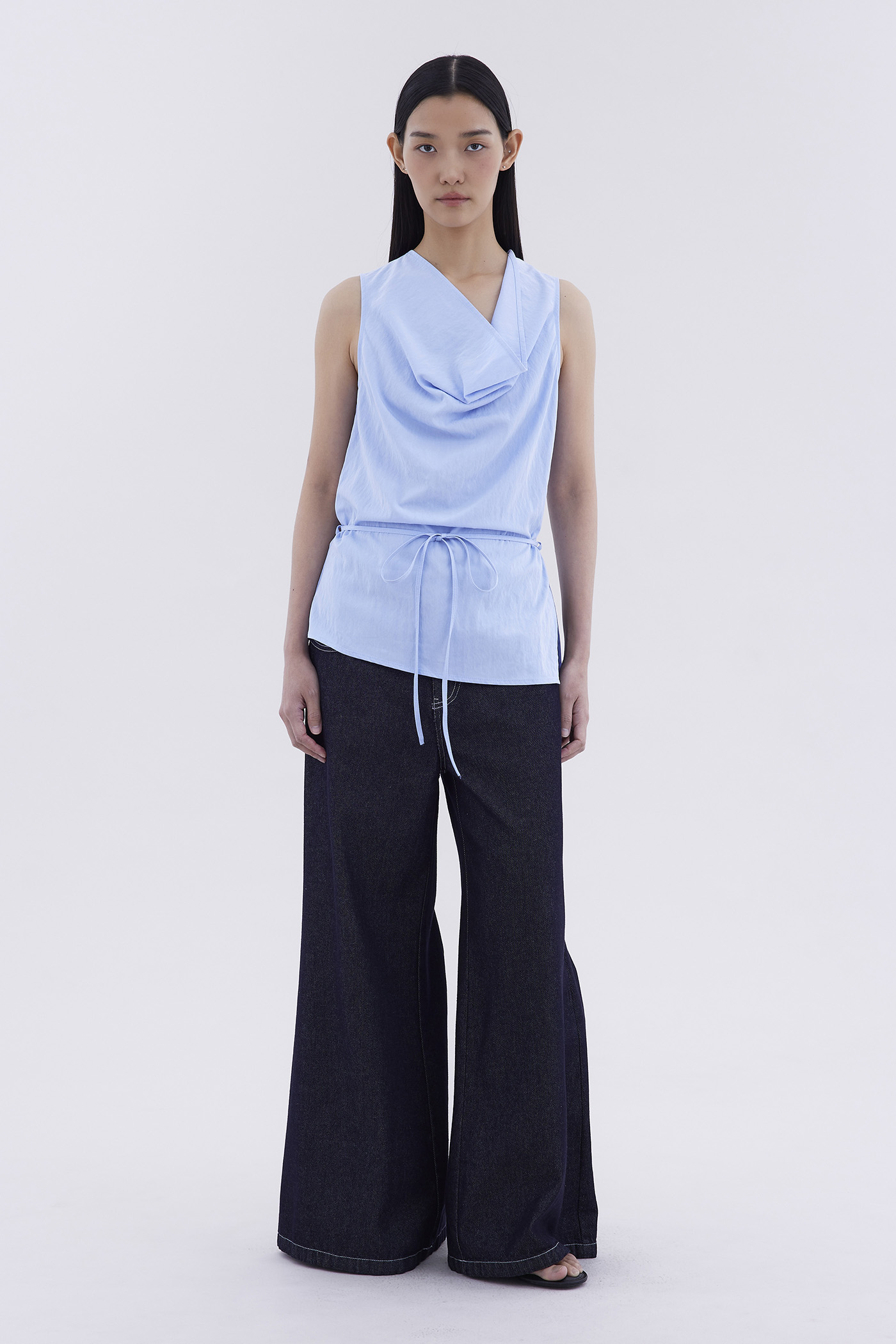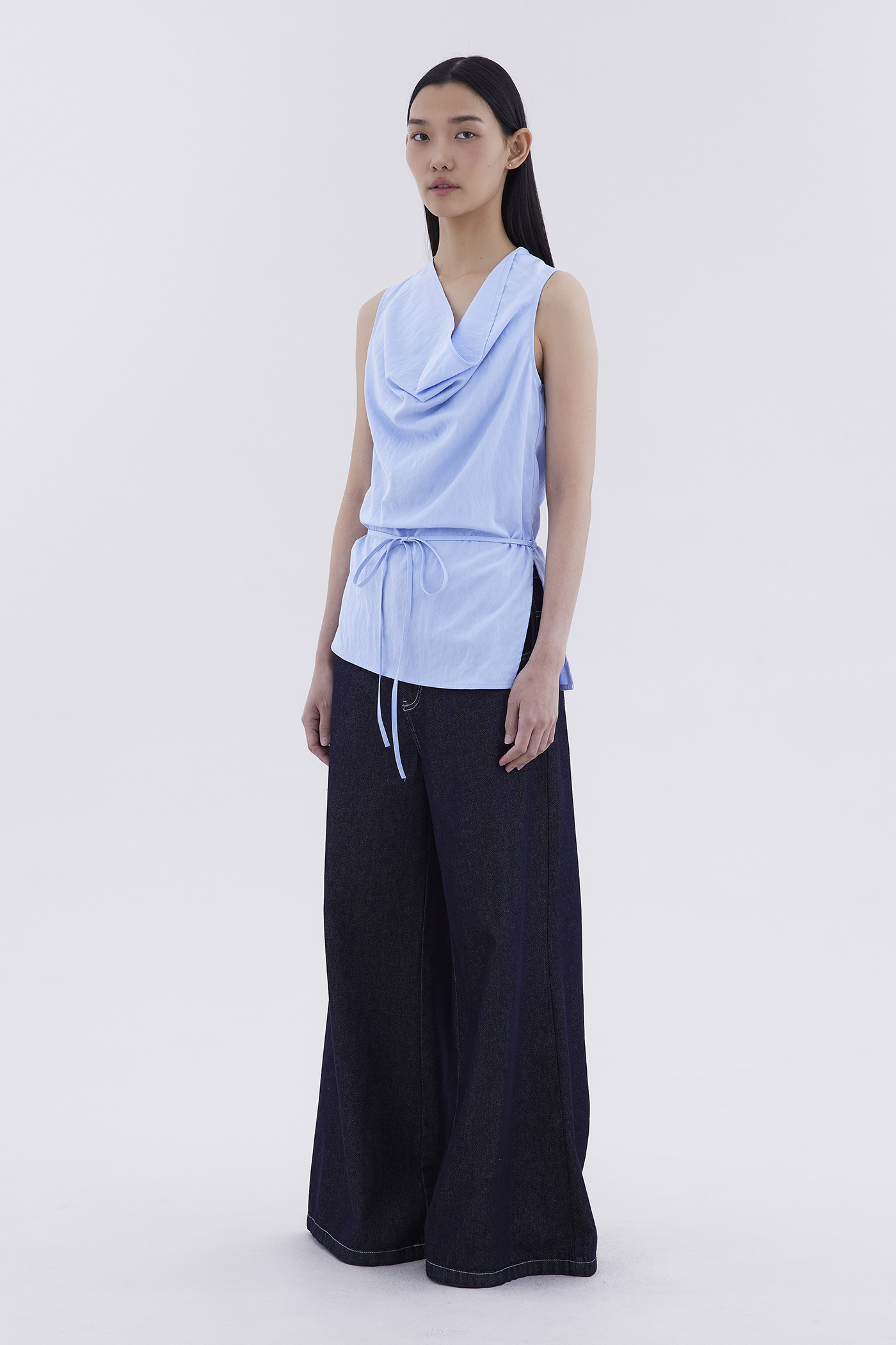 Bold statement. Made from light and smooth fabric, this sleeveless top features a cowl neckline, removable waist tie-strap and side zip closure. Worn in a relaxed fit.