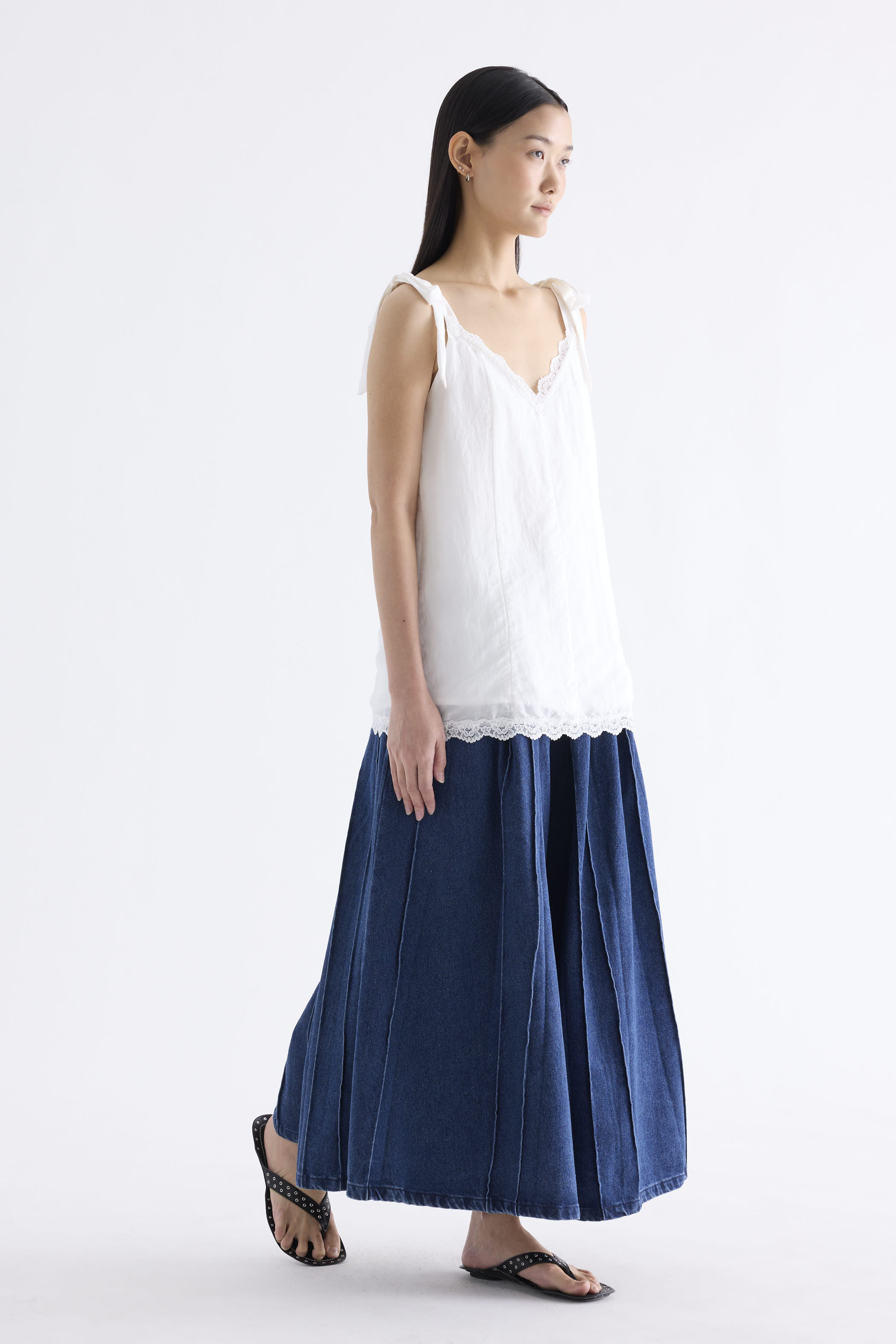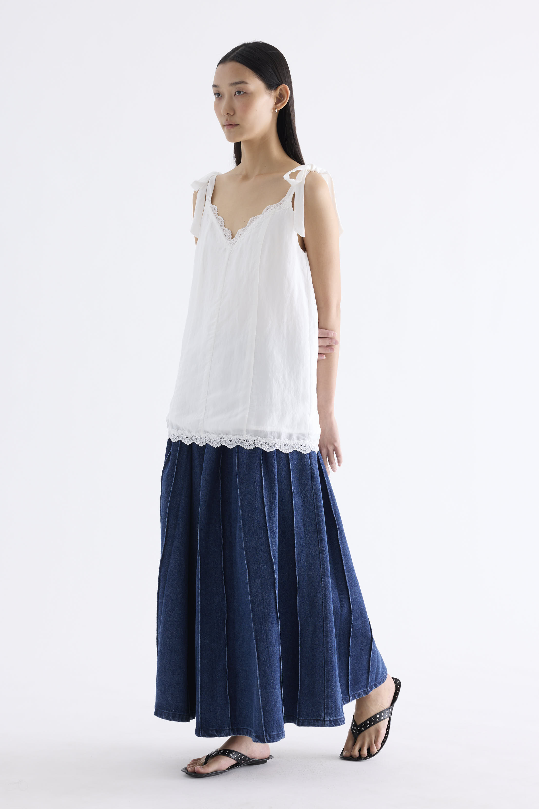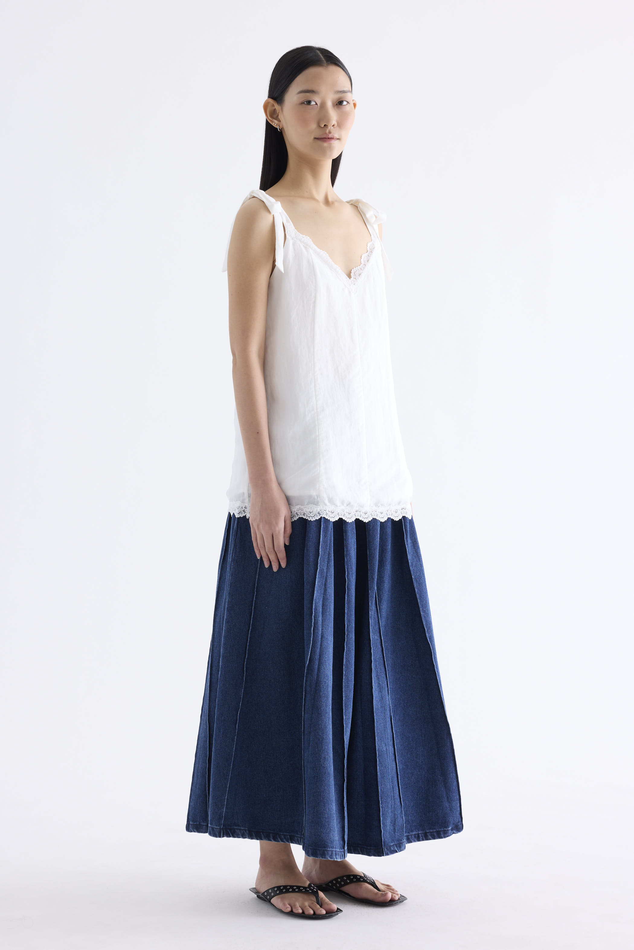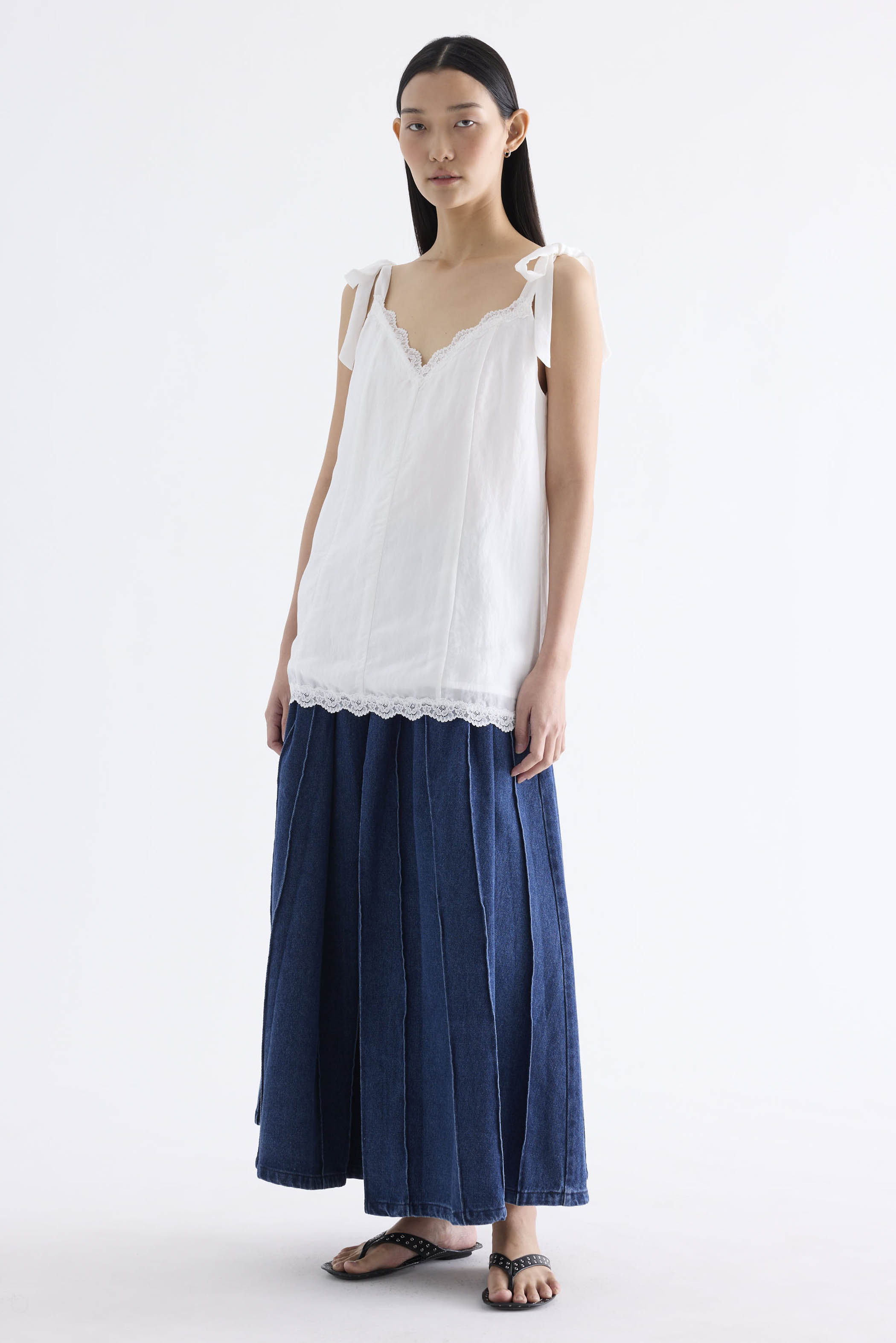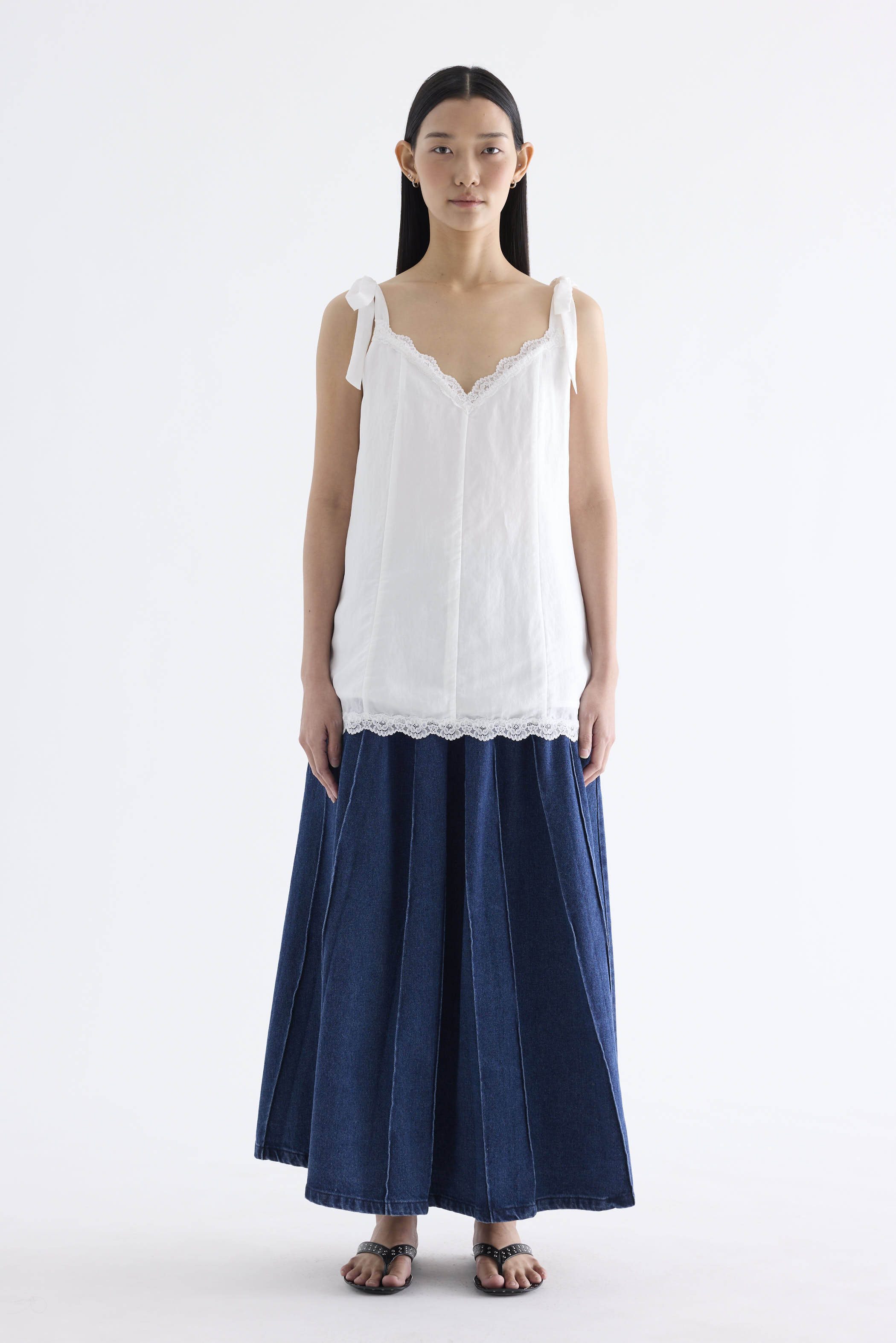 Go to new lengths. Made from light fabric with a soft sheen, this longline slip top features a lace-trimmed V-neckline, self-tying shoulder straps and a panelled construction. Worn in a relaxed fit.
