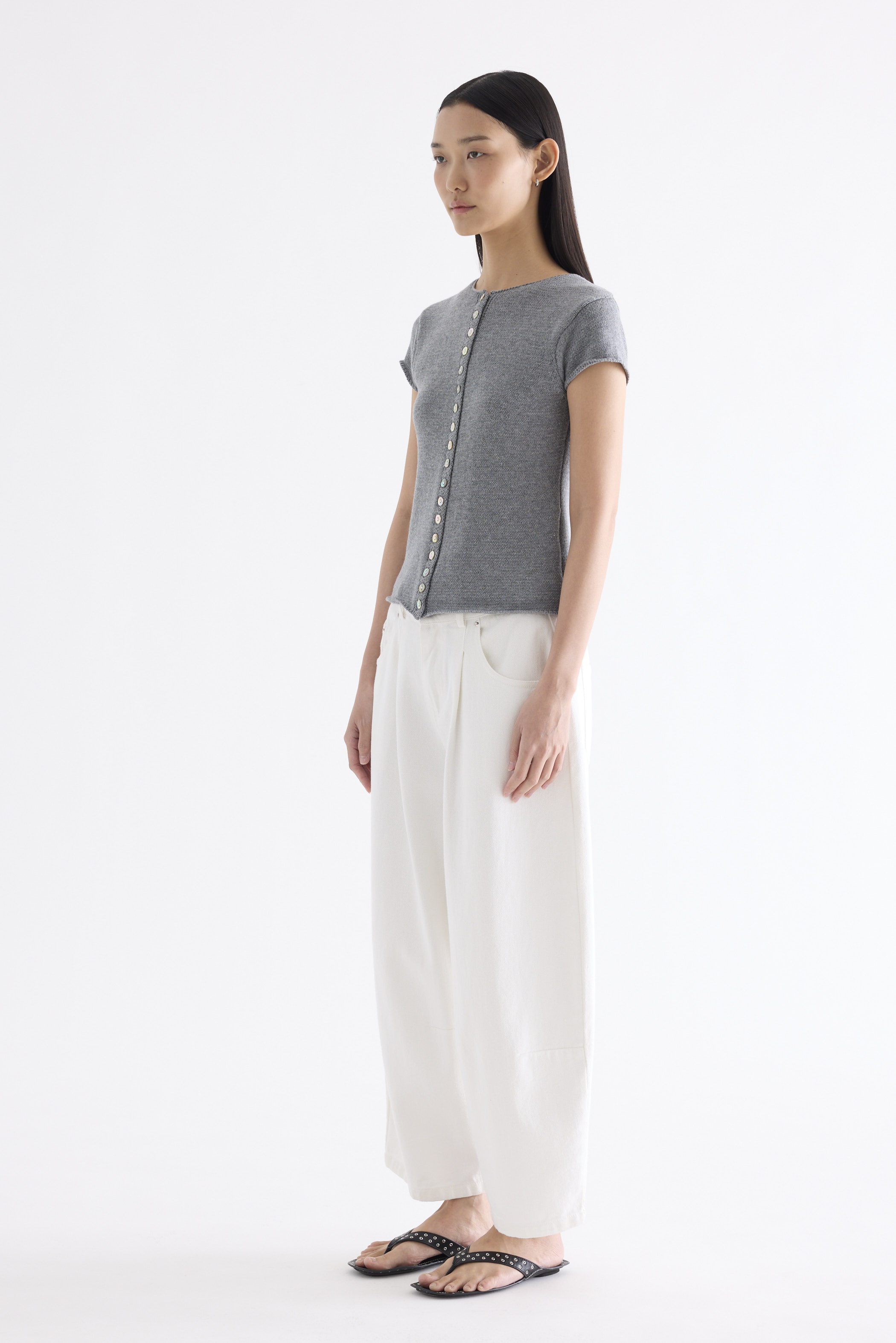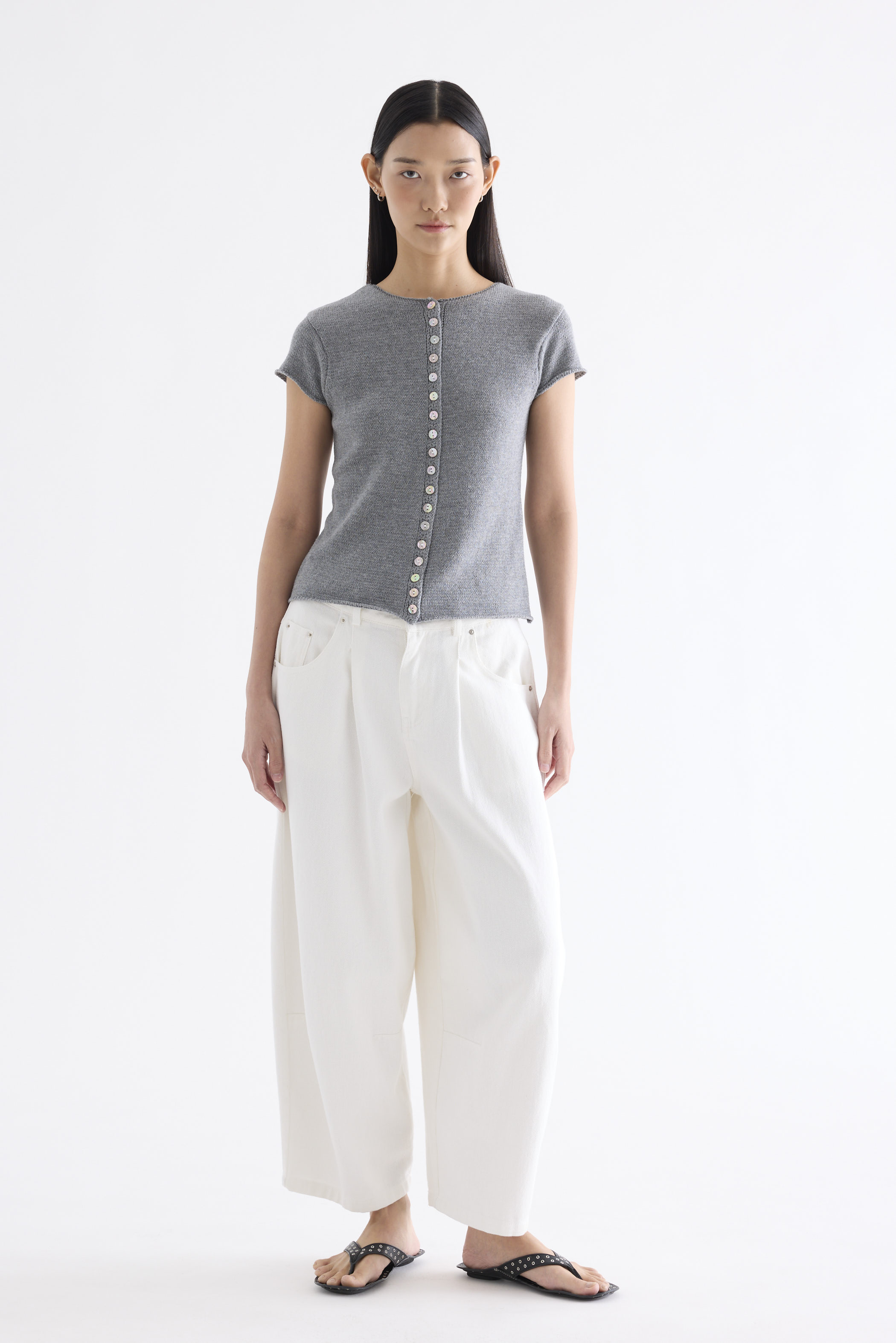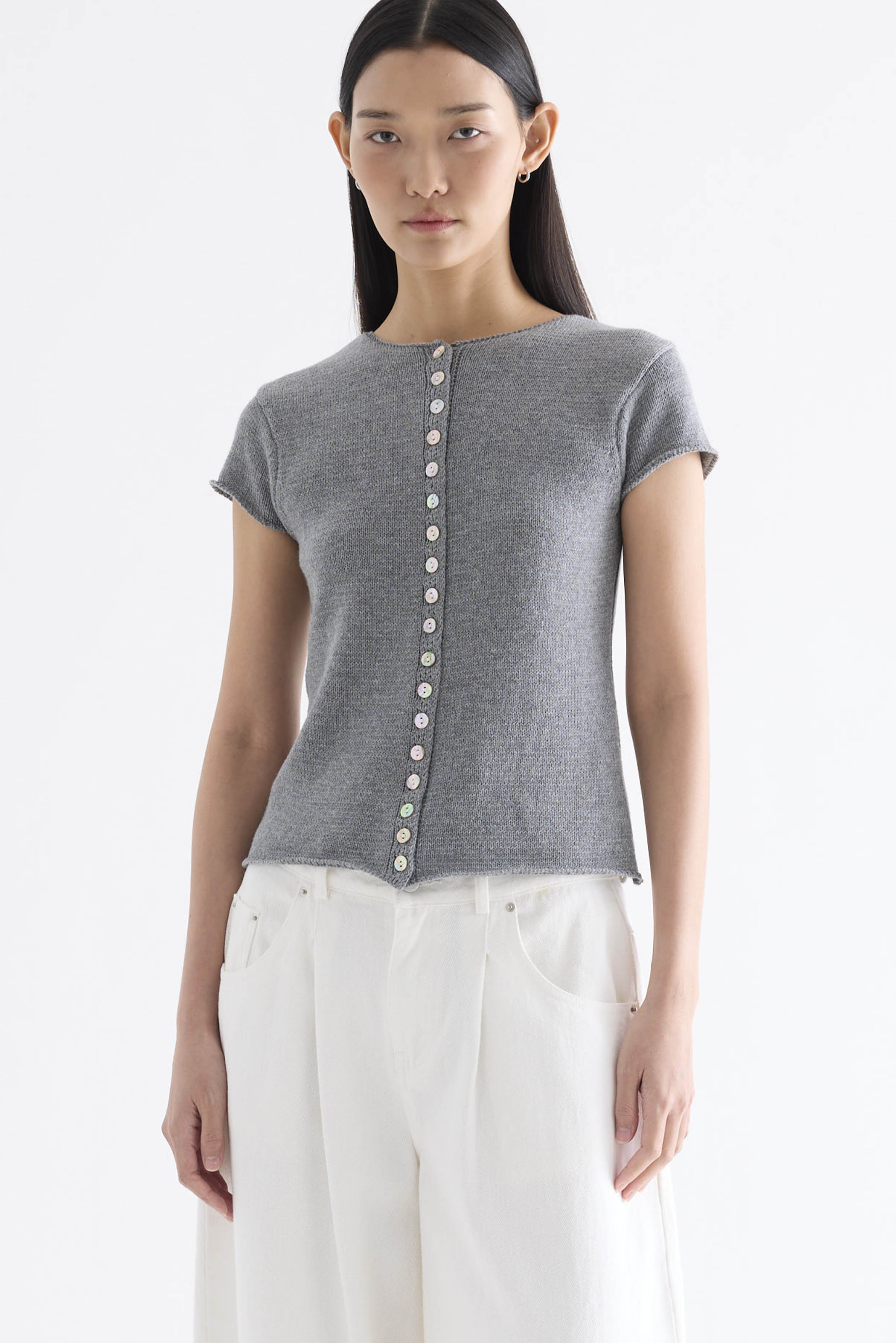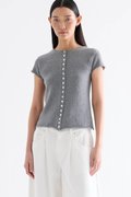 Subtle details. Made from soft and cosy knit, this top features a round neckline, button-down front and rolled hem. Worn in a slim fit.