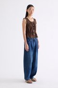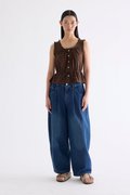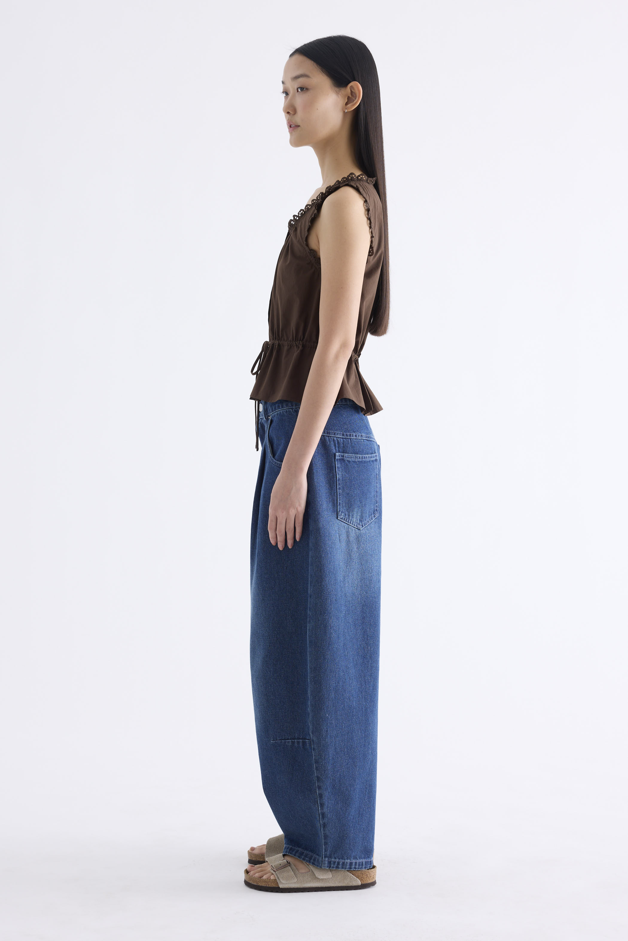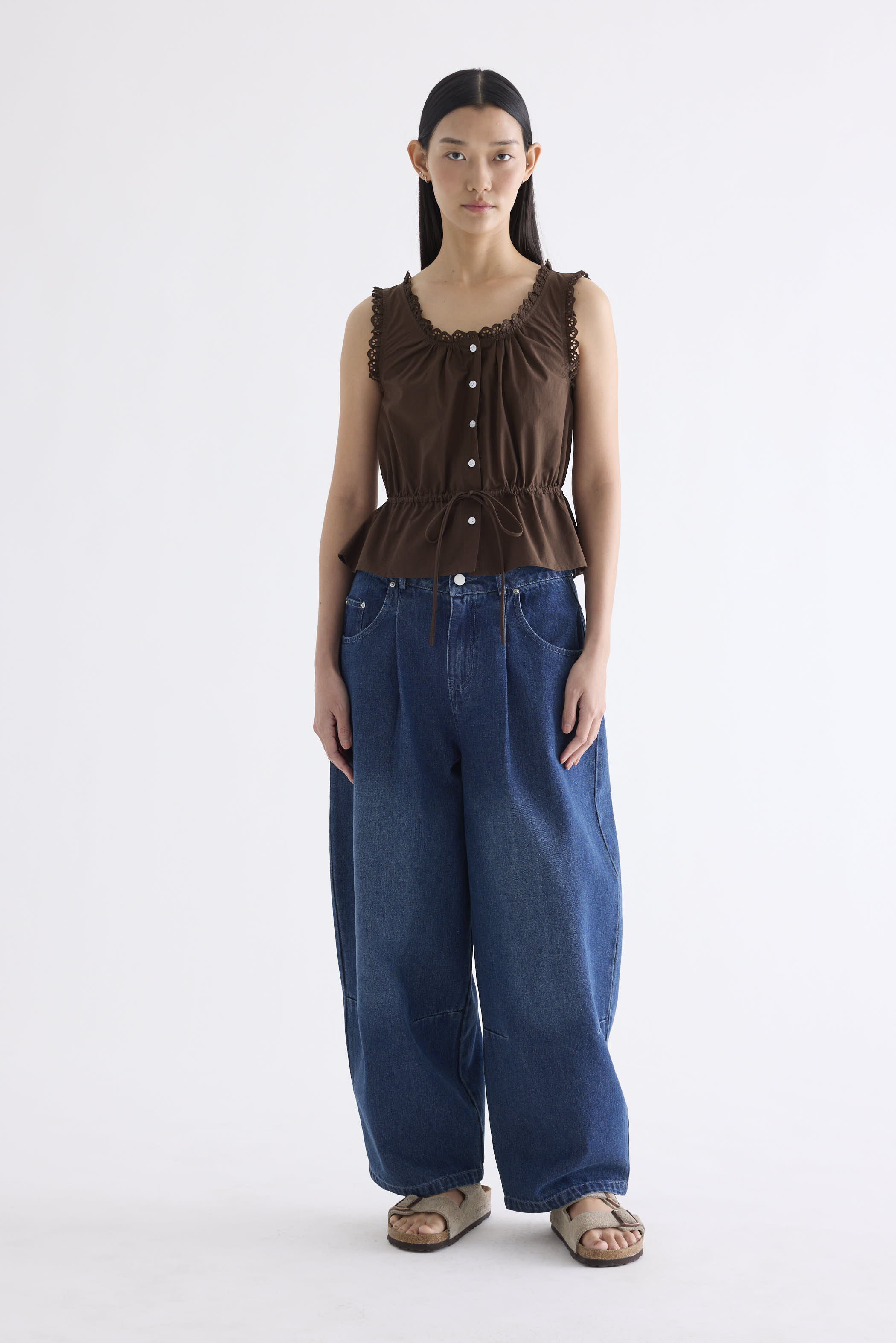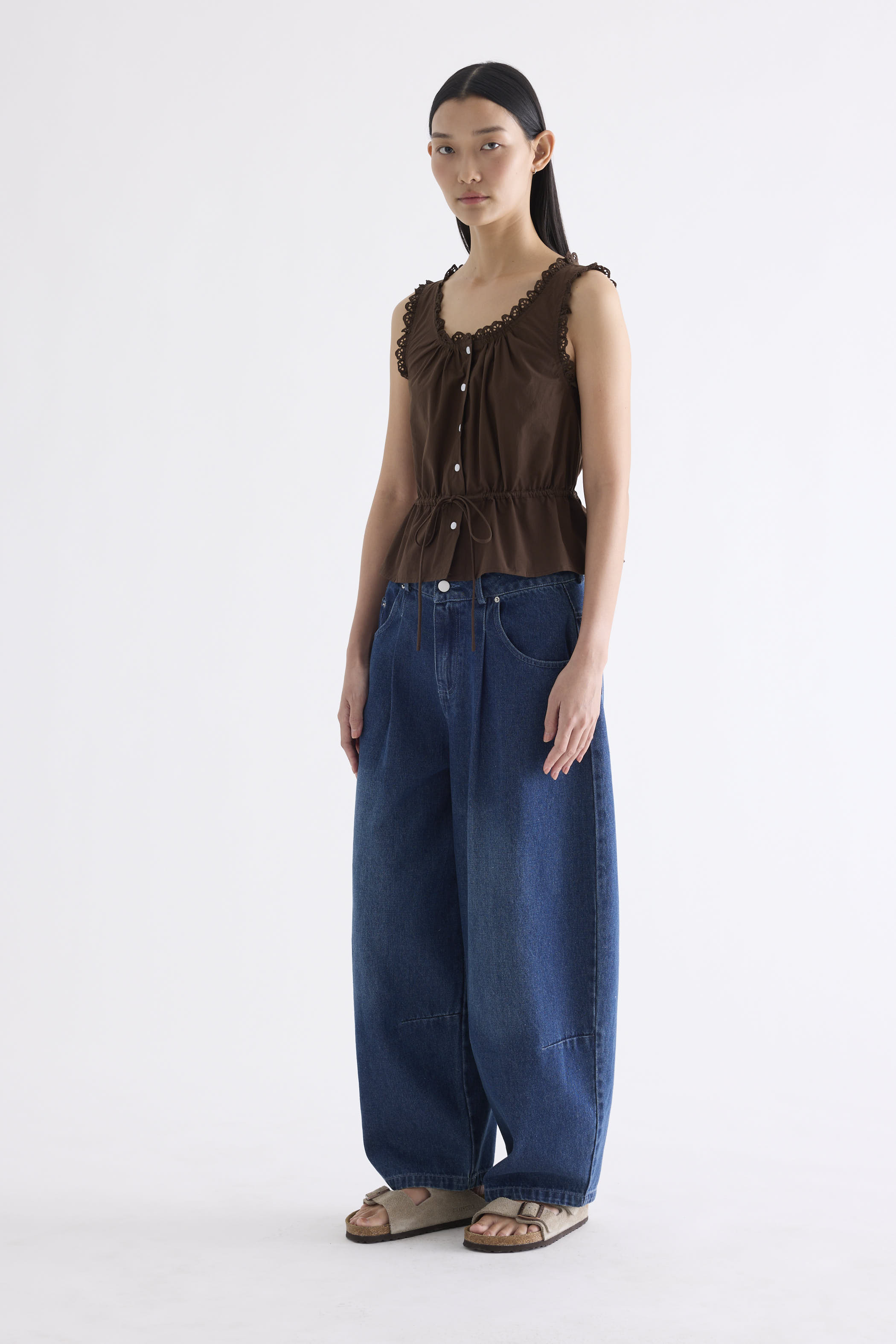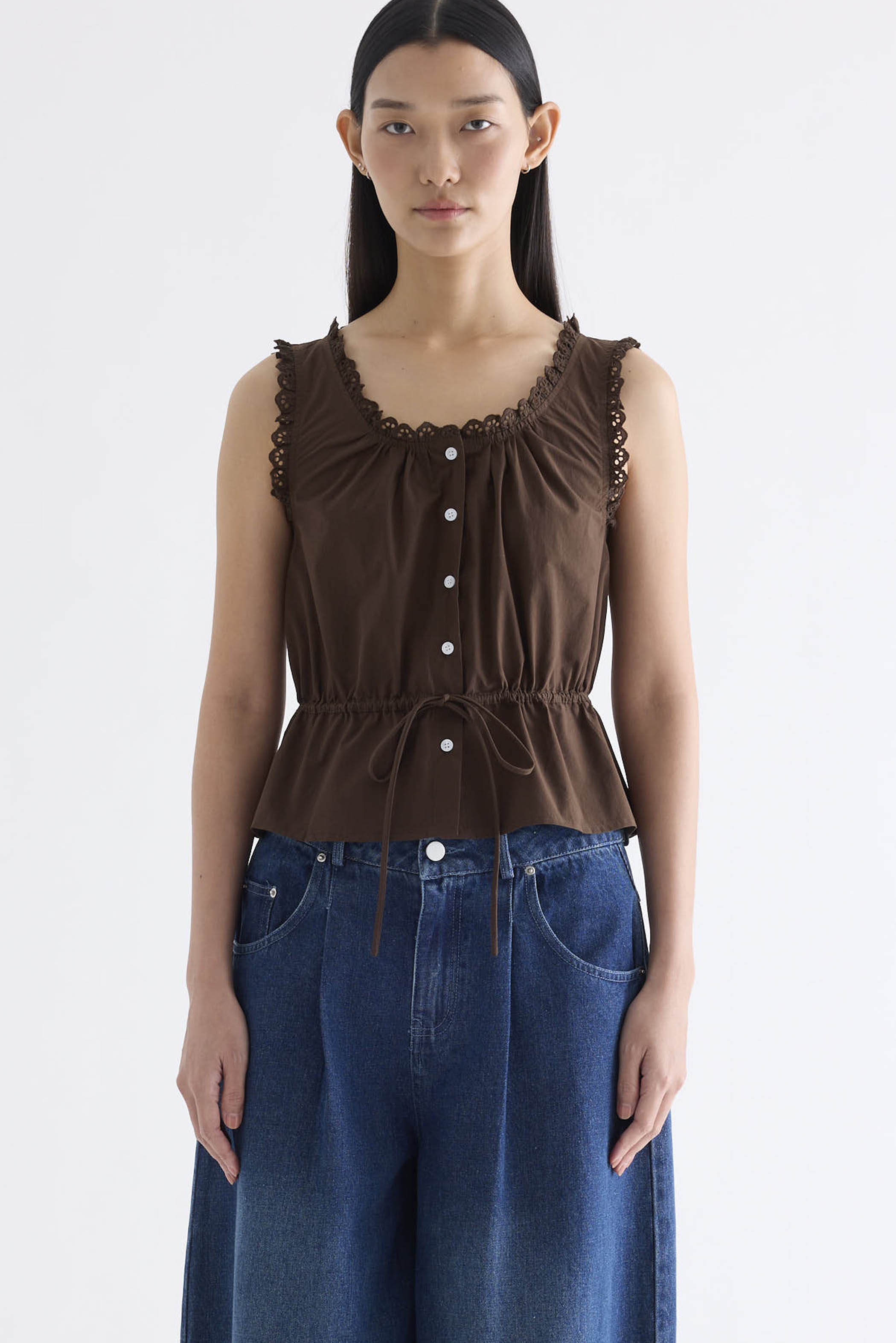 Details first. Made from smooth and softly structured cotton, this sleeveless top features a lace-trimmed U-shaped neckline, lace-trimmed shoulder straps, an adjustable drawstring waist-tie and a button-down front. Worn in a slim fit.