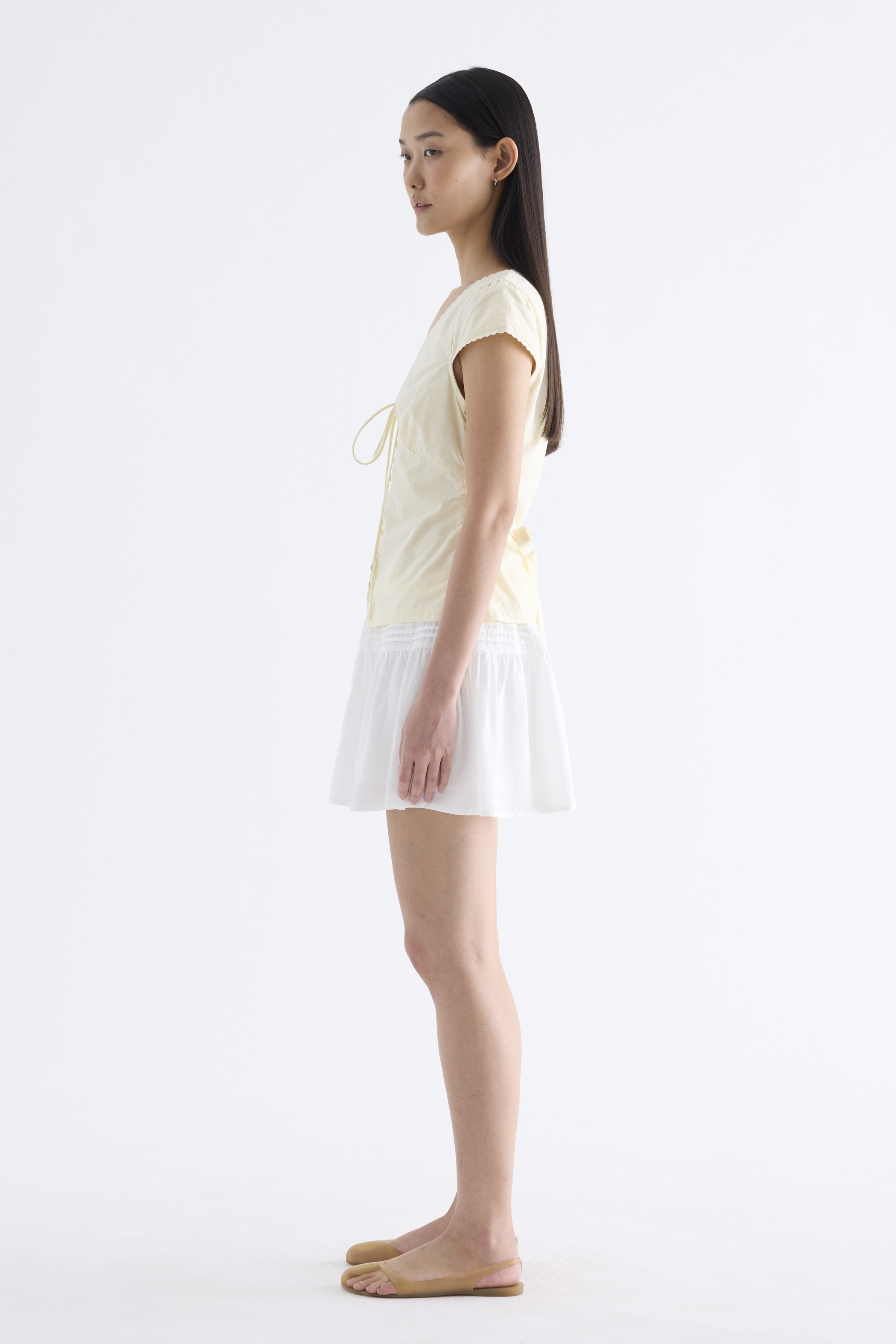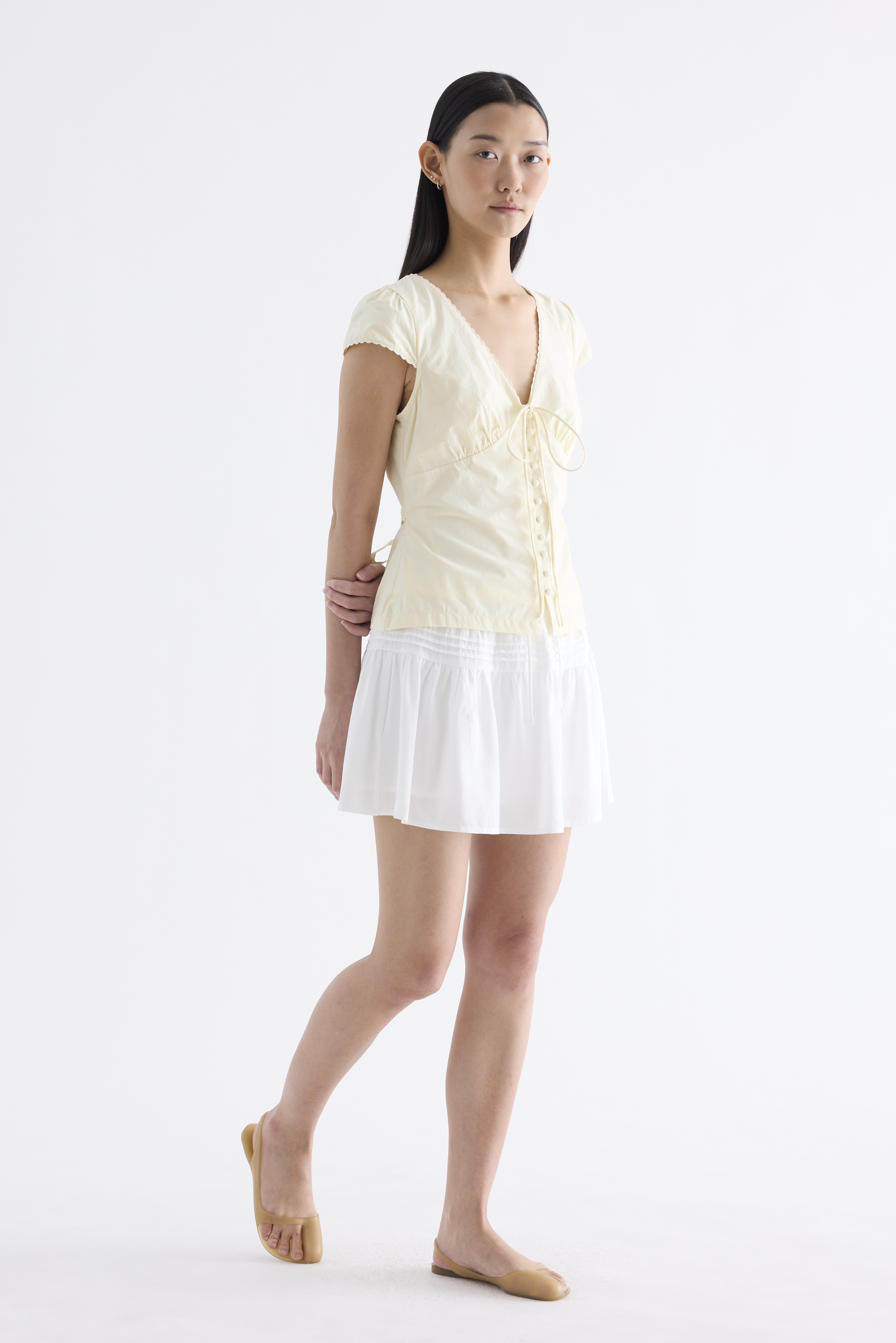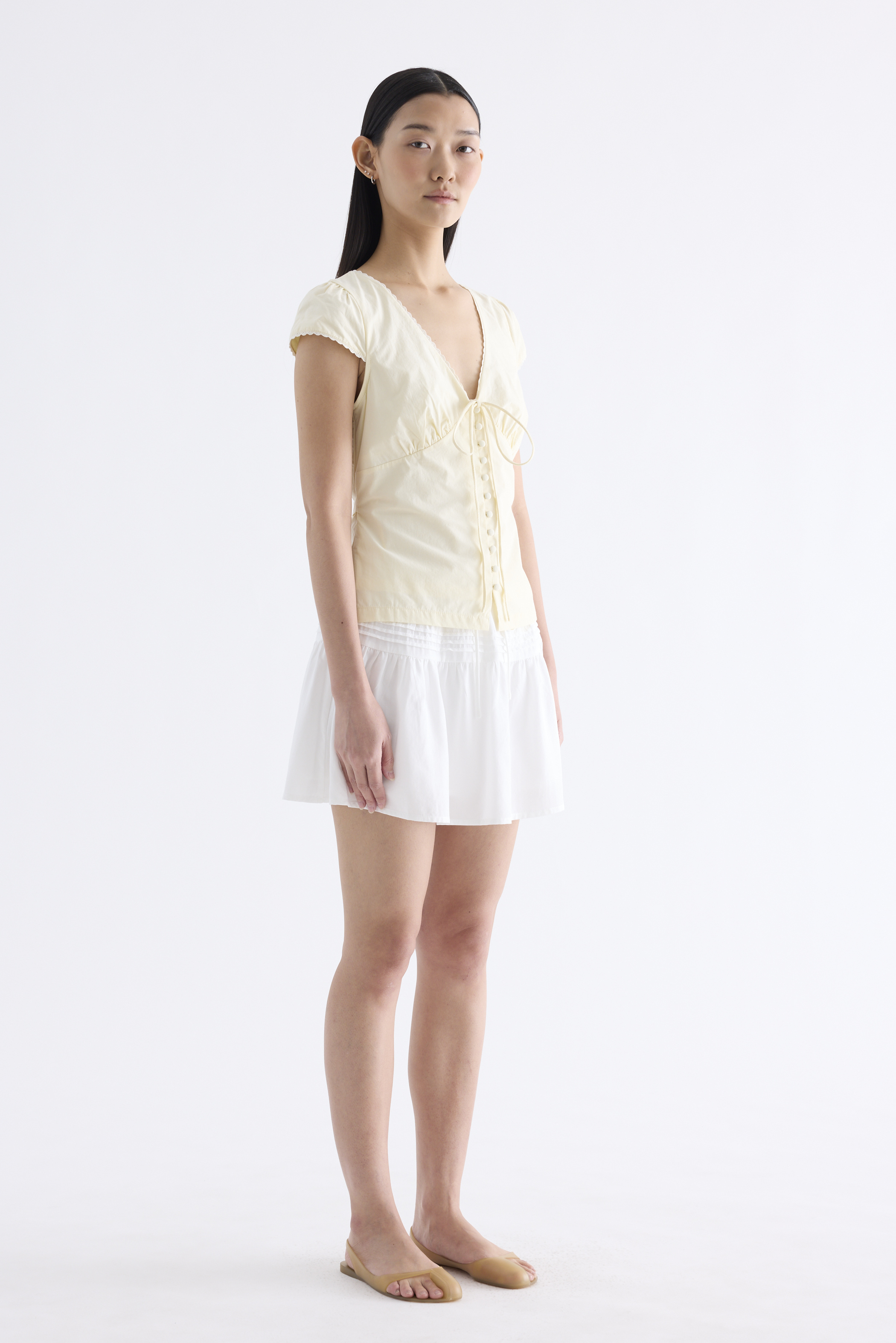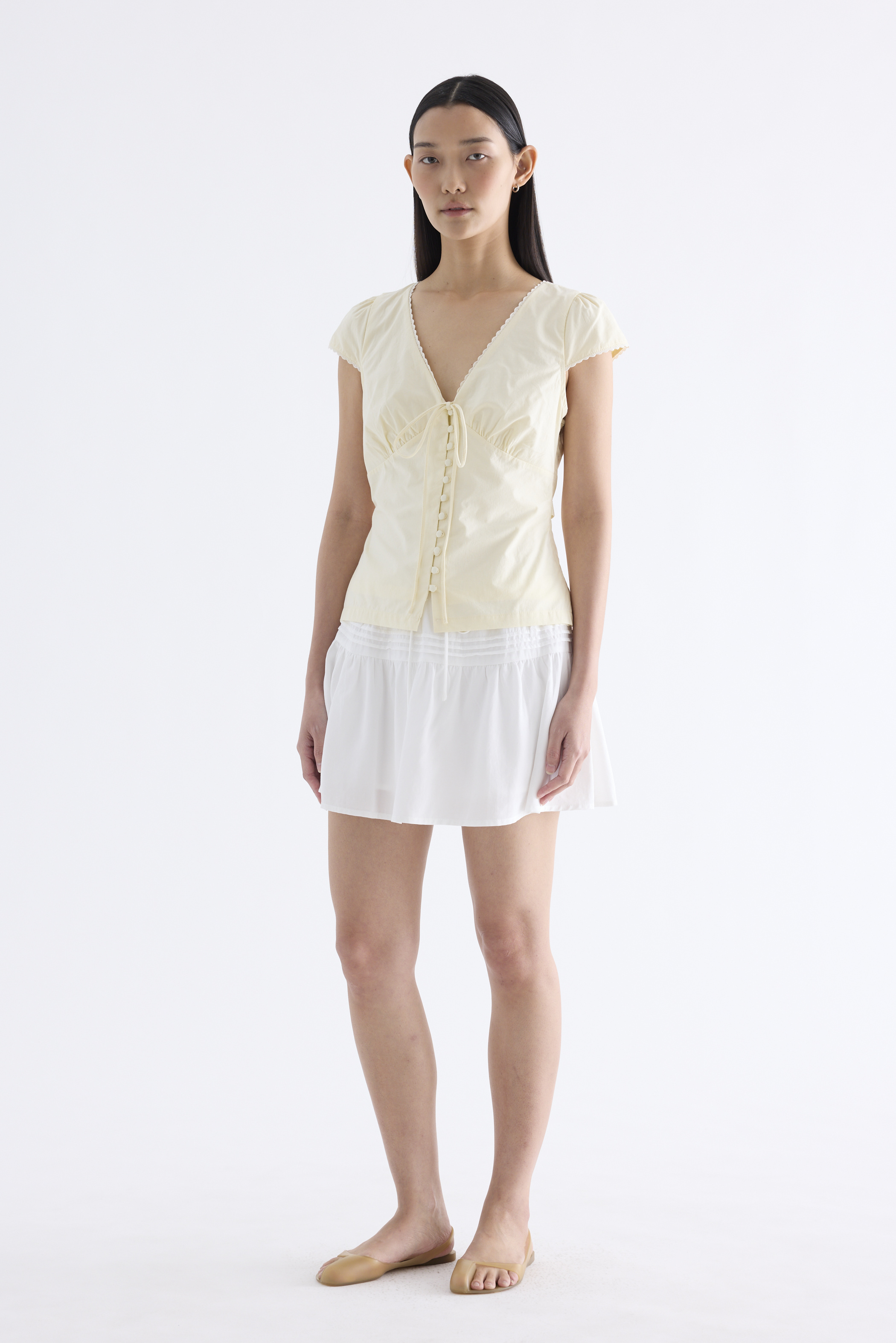 Details that count. Made from crisp and softly structured cotton, this lace-trimmed blouse features a V-shaped bustier neckline with a tie-strap, cap sleeves, front loop buttons and a back tie-strap. Worn in a slim fit with a side zip closure.