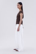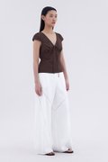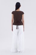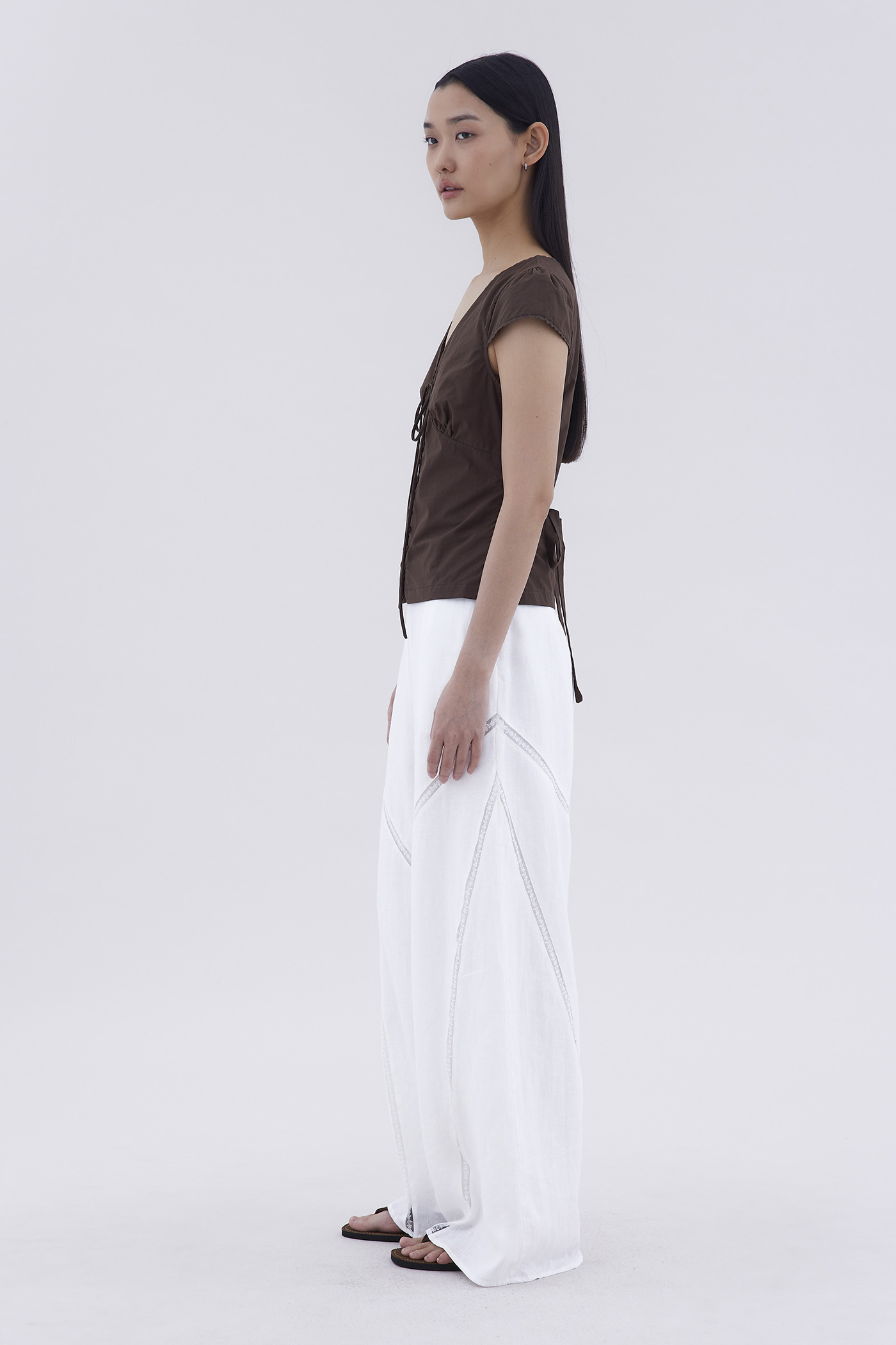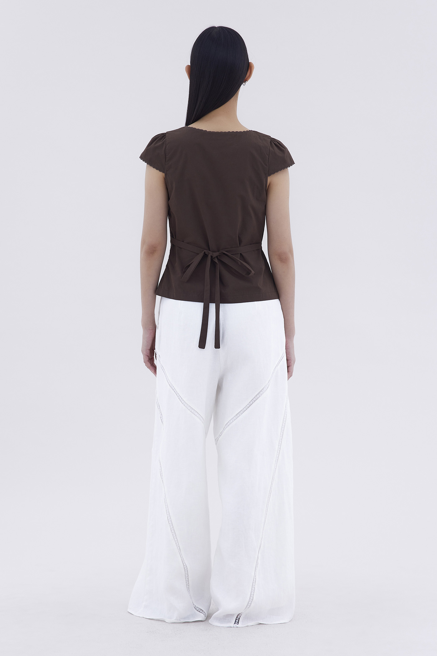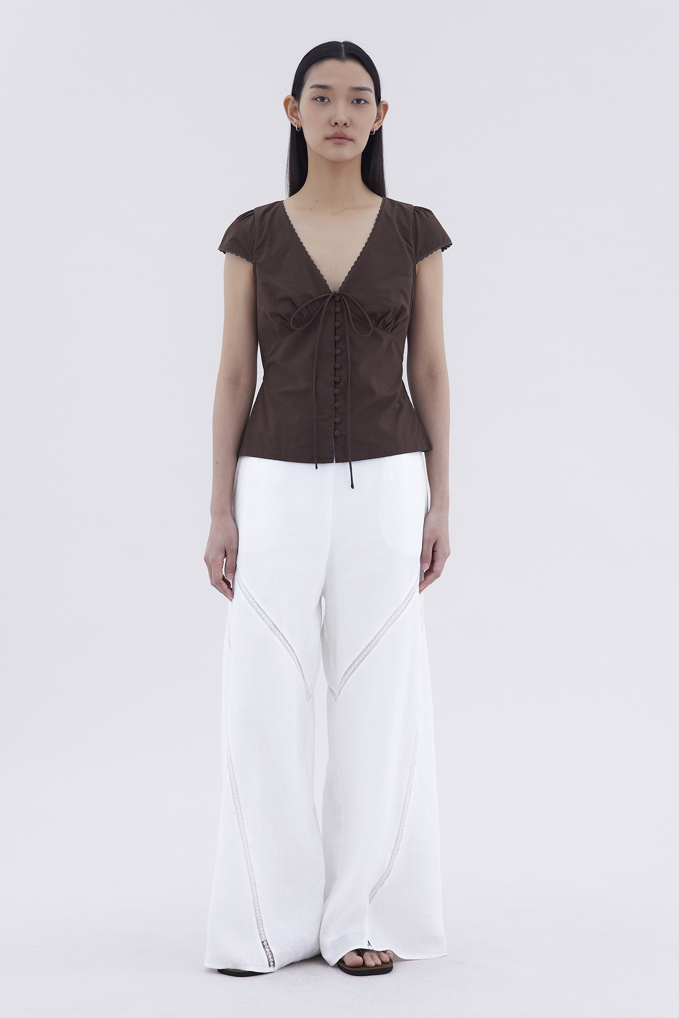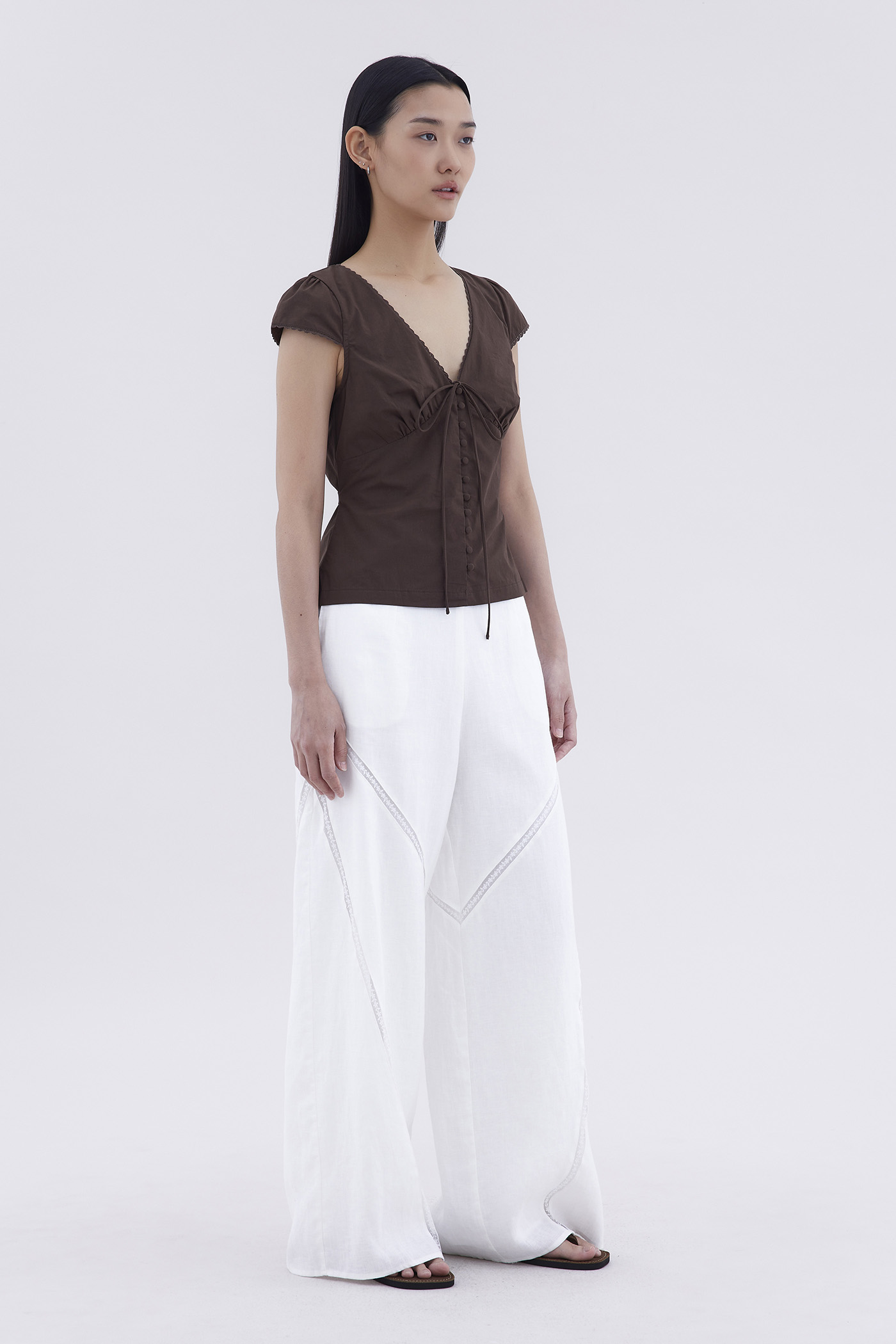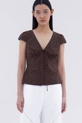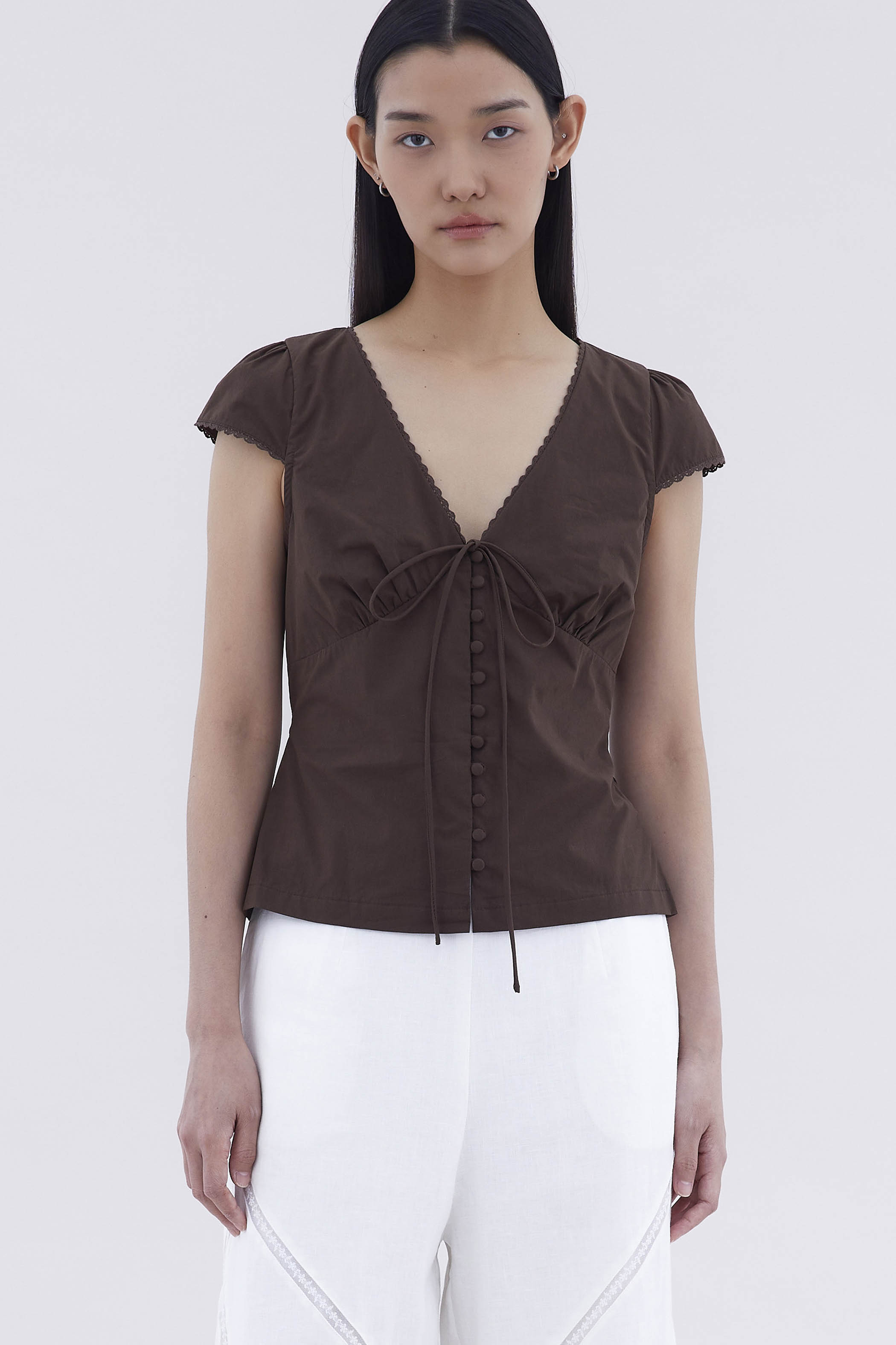 Details that count. Made from crisp and softly structured cotton, this lace-trimmed blouse features a V-shaped bustier neckline with a tie-strap, cap sleeves, front loop buttons and a back tie-strap. Worn in a slim fit with a side zip closure.