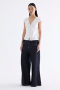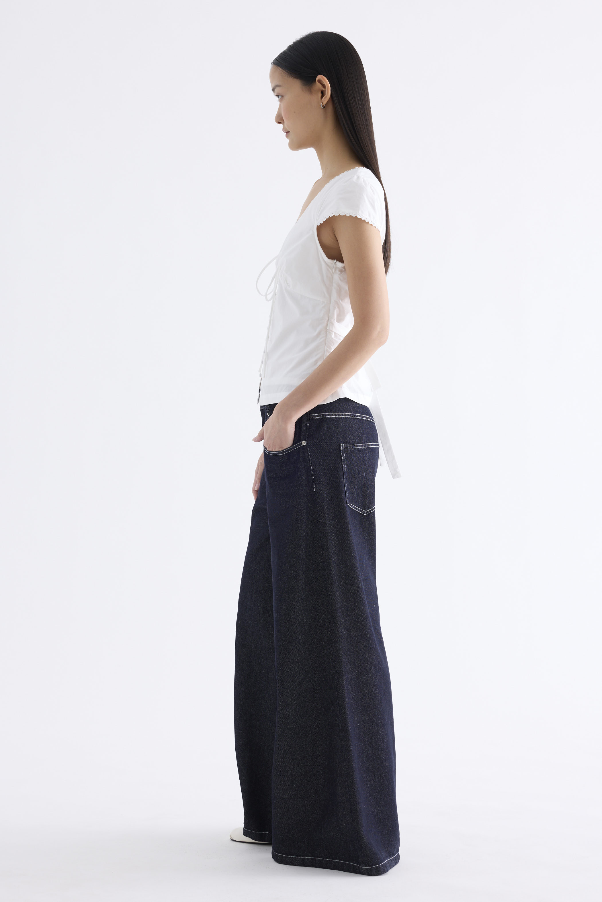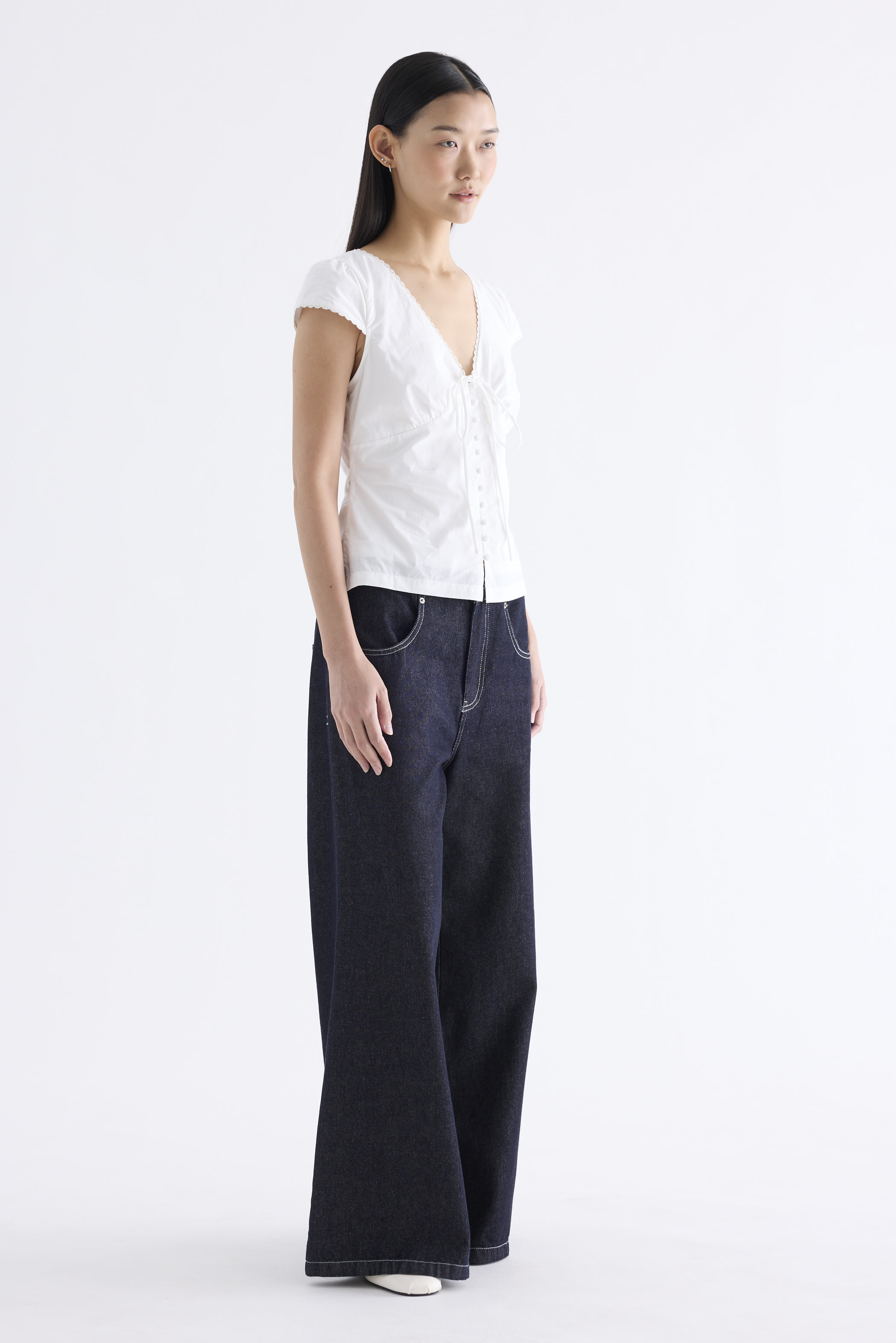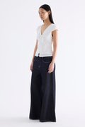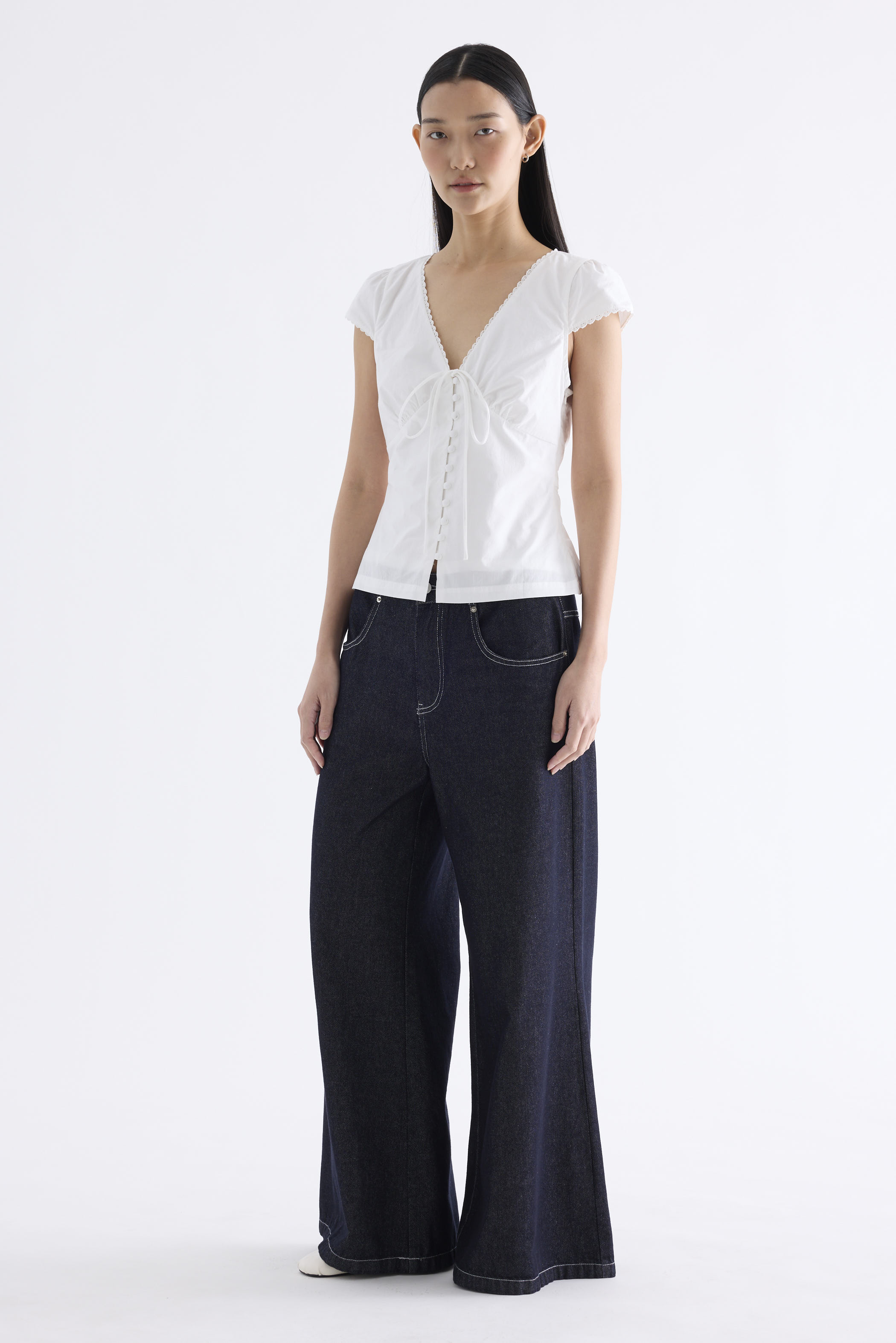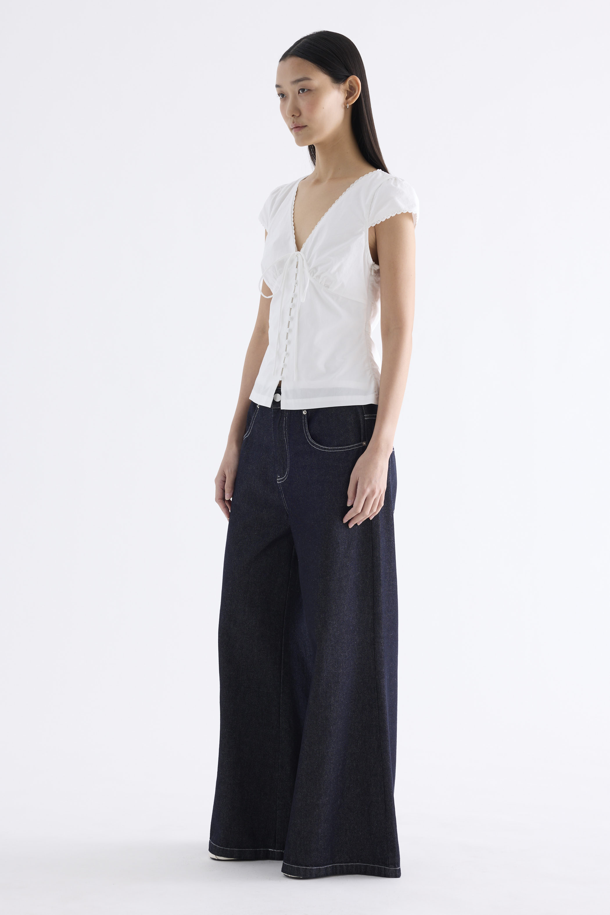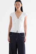 Details that count. Made from crisp and softly structured cotton, this lace-trimmed blouse features a V-shaped bustier neckline with a tie-strap, cap sleeves, front loop buttons and a back tie-strap. Worn in a slim fit with a side zip closure.
