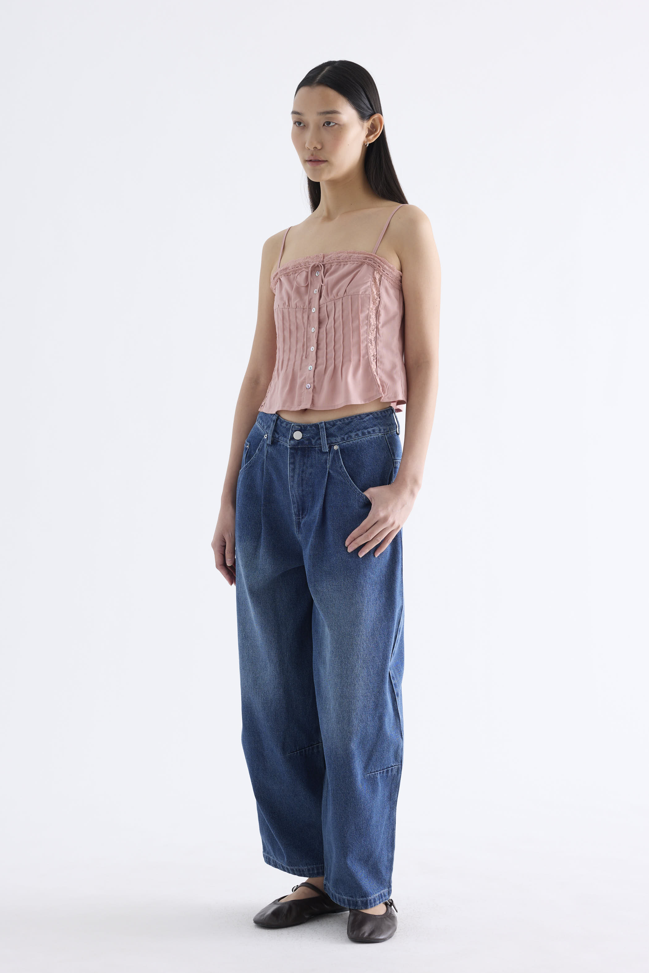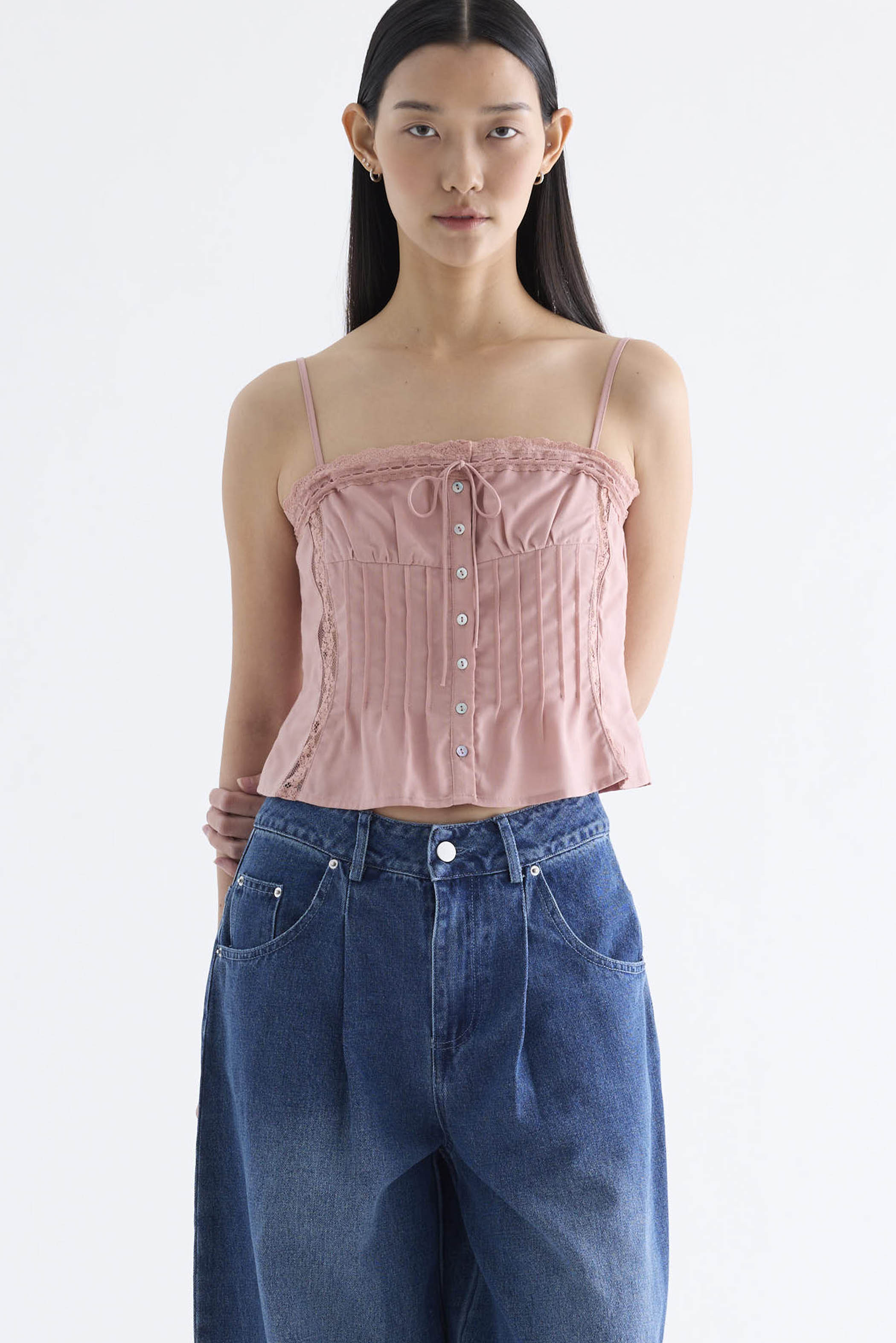 Always cool. Made from light and non-stretch Tencel, this sleeveless button-down top features a drawstring lace-trimmed neckline with a front tie-strap, slim adjustable shoulder straps and a pleated bodice with lace panels. Fits slim and slightly cropped.