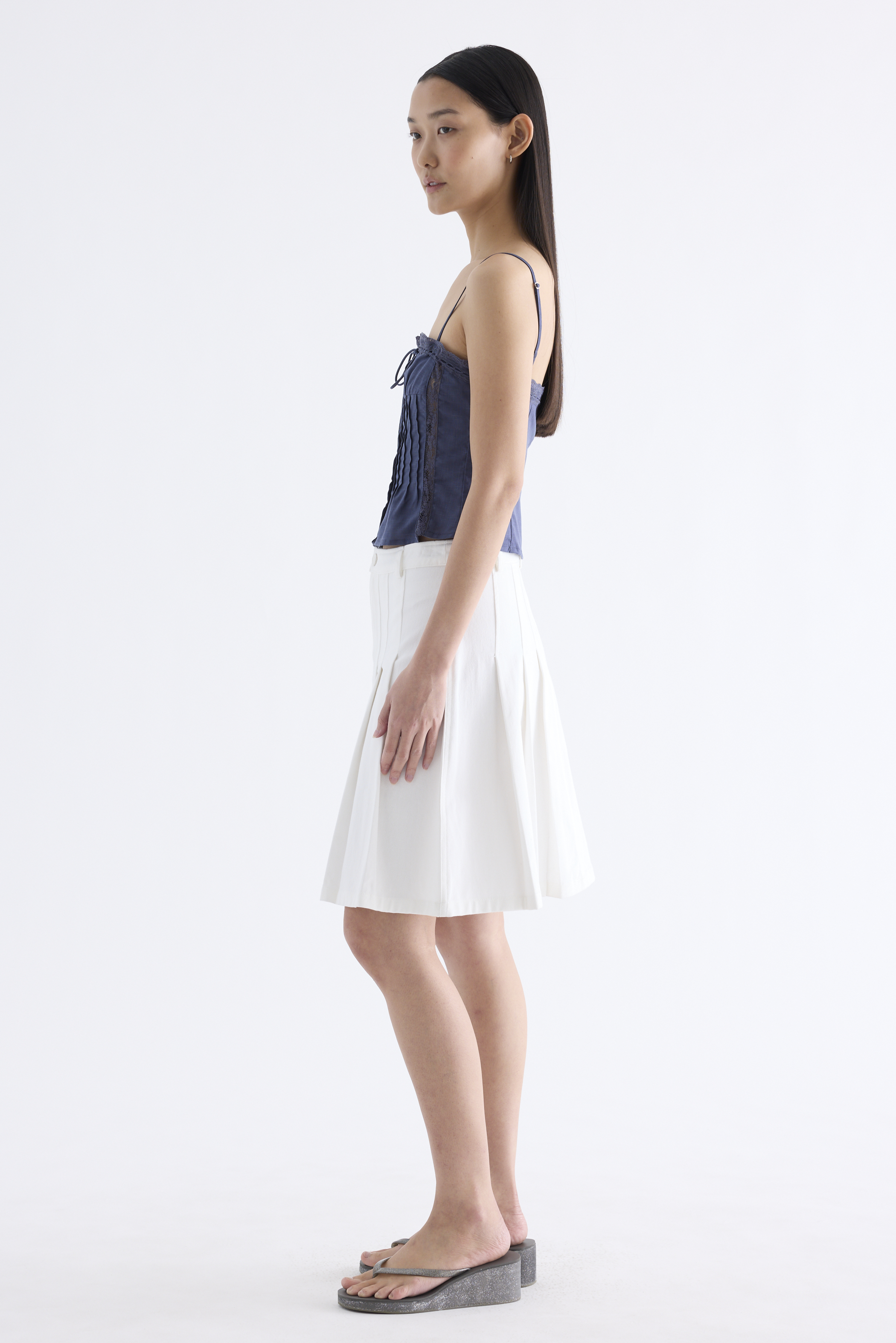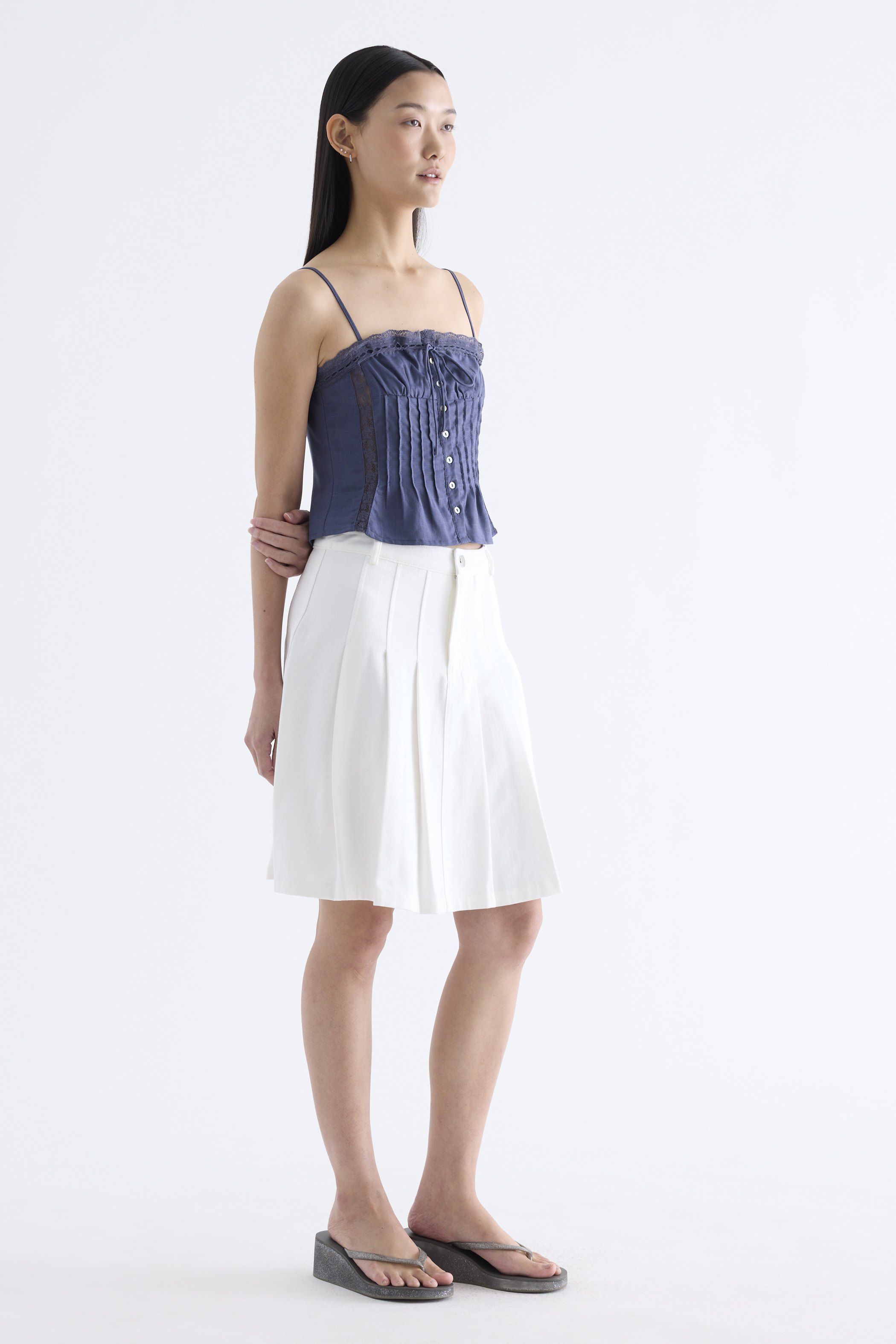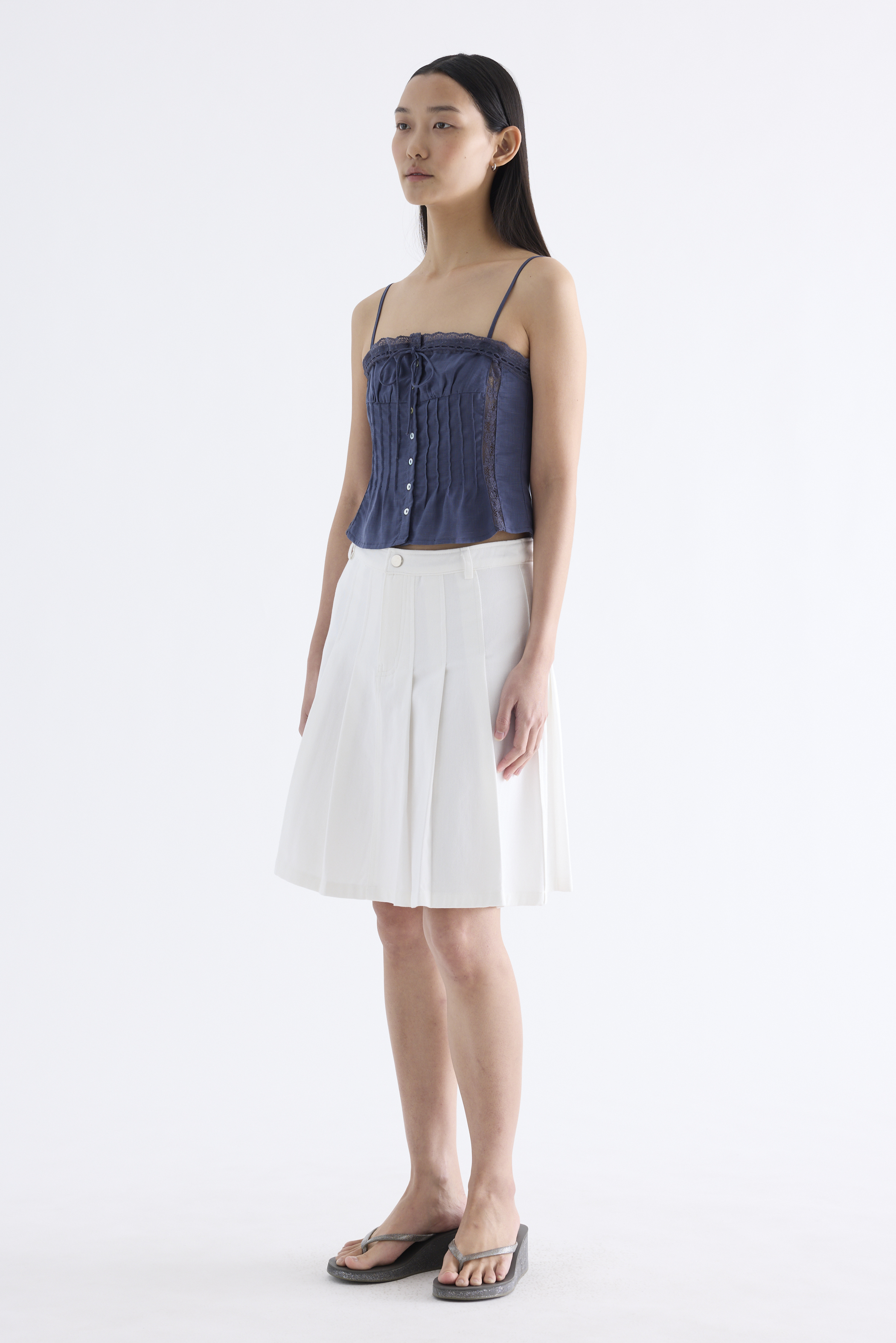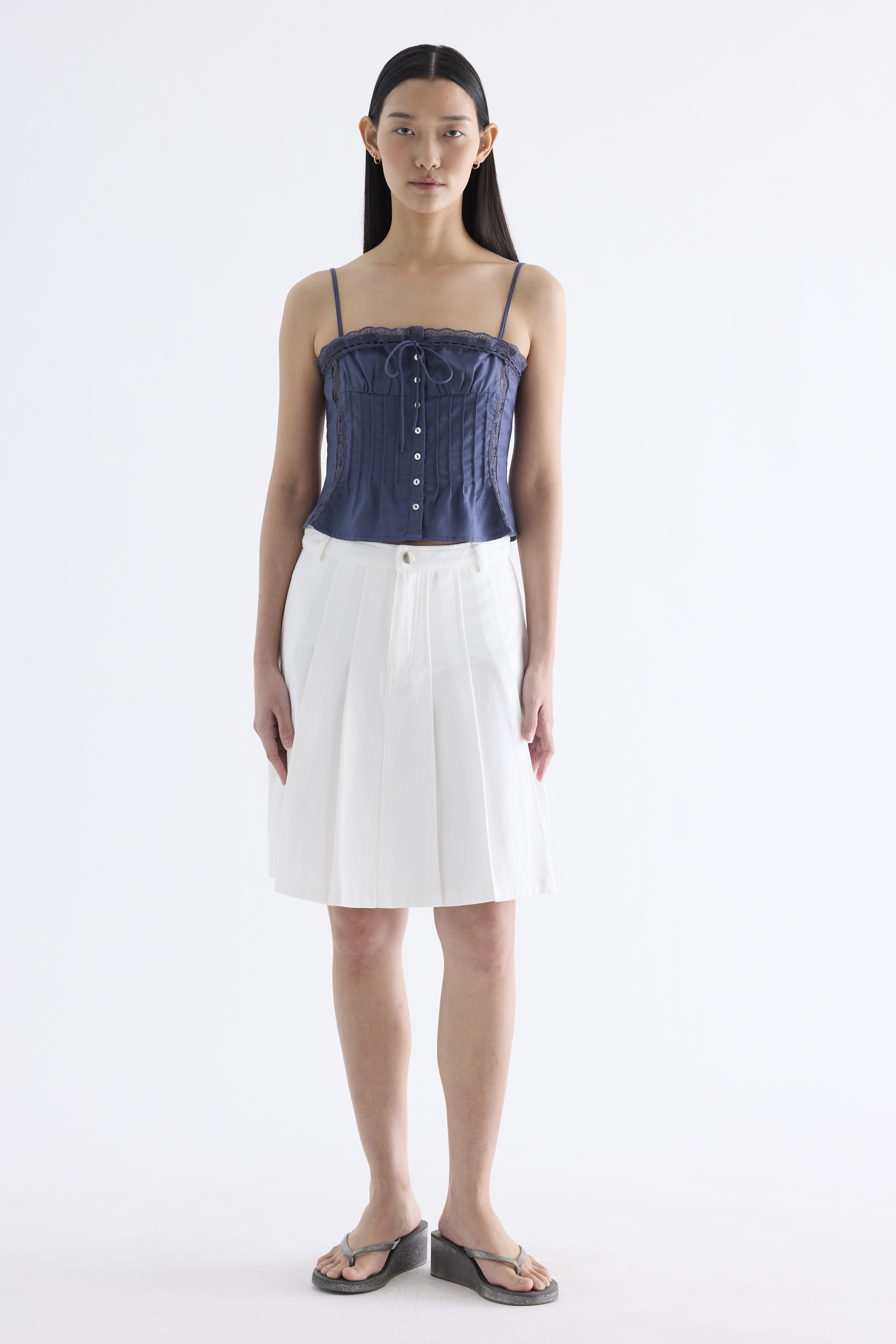 Always cool. Made from light and non-stretch Tencel, this sleeveless button-down top features a drawstring lace-trimmed neckline with a front tie-strap, slim adjustable shoulder straps and a pleated bodice with lace panels. Fits slim and slightly cropped.