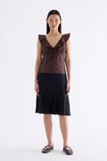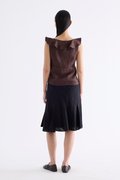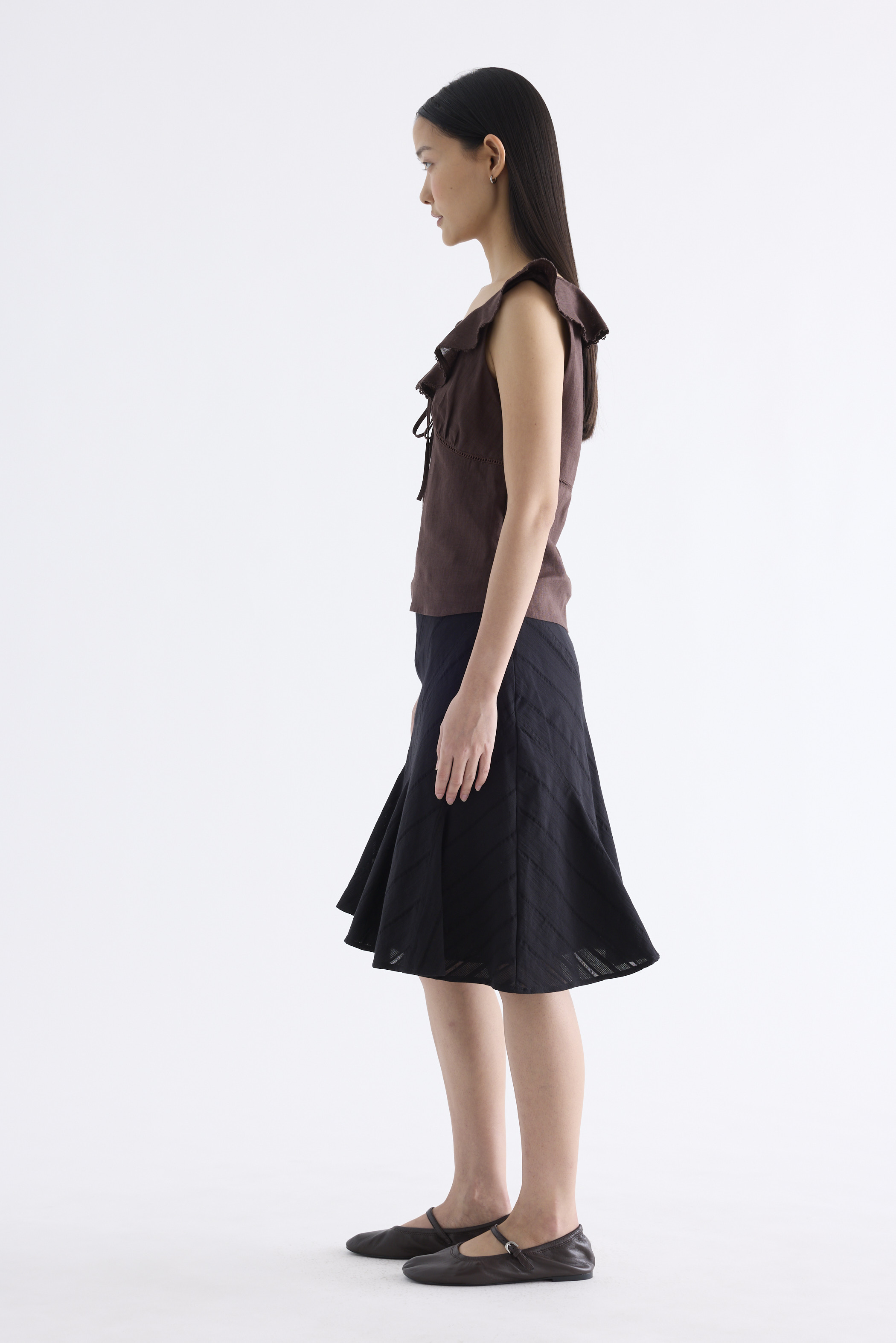 Warm-weather approved. Cut from airy and gently tailored 100% linen, this sleeveless top features a V-neckline with ruffled and oversized lace-trimmed collars, a ruched bust with ladder lace detailing, as well as a front tie-strap. Worn in a slim fit with a side zip closure.