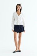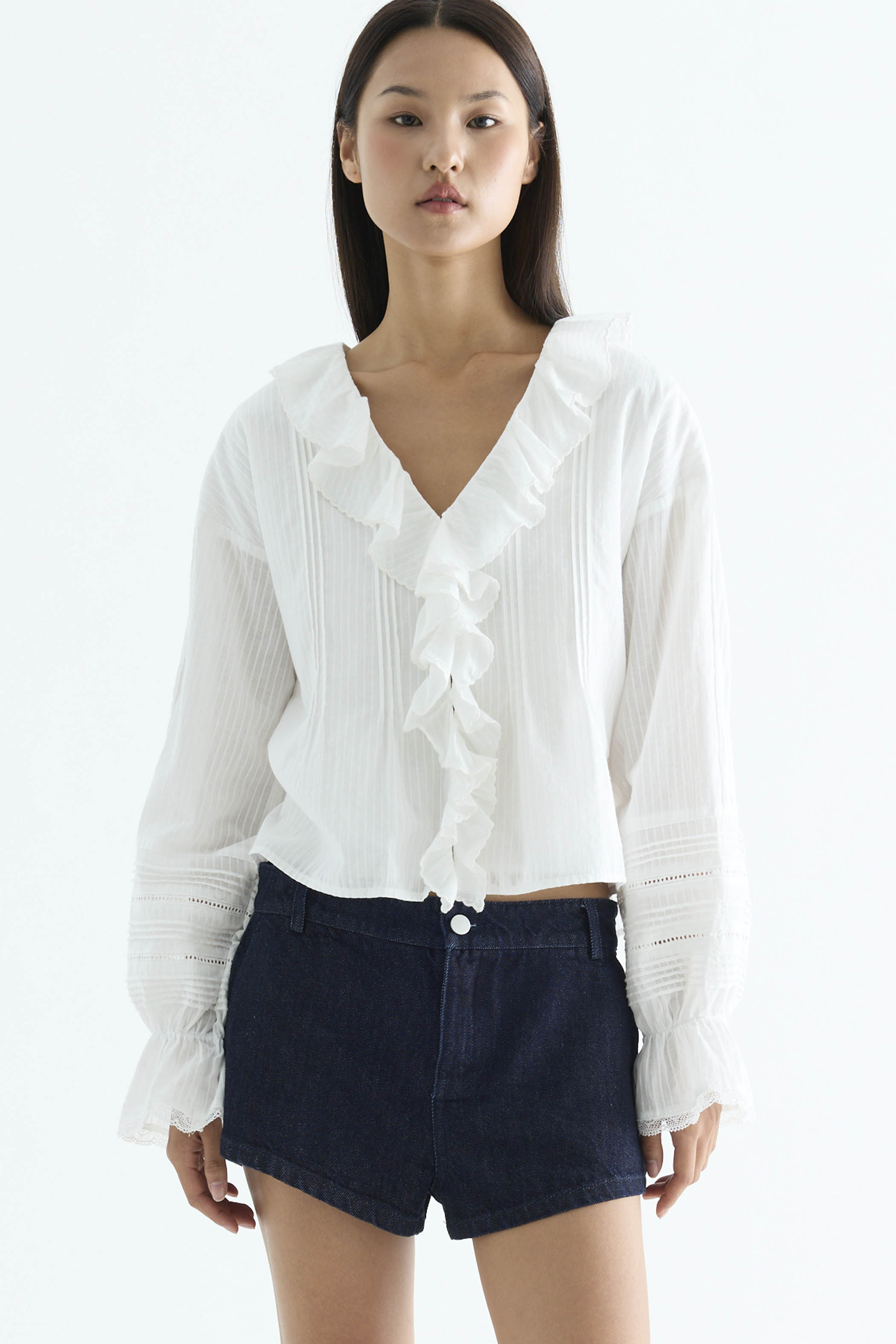 Statement details. Made from airy and striped cotton, this top features a ruffled V-neckline, button-down front, pleats and ladder lace details, as well as lantern sleeves with an elasticated cuff and lace-trimmed hem. Worn in a relaxed fit.