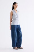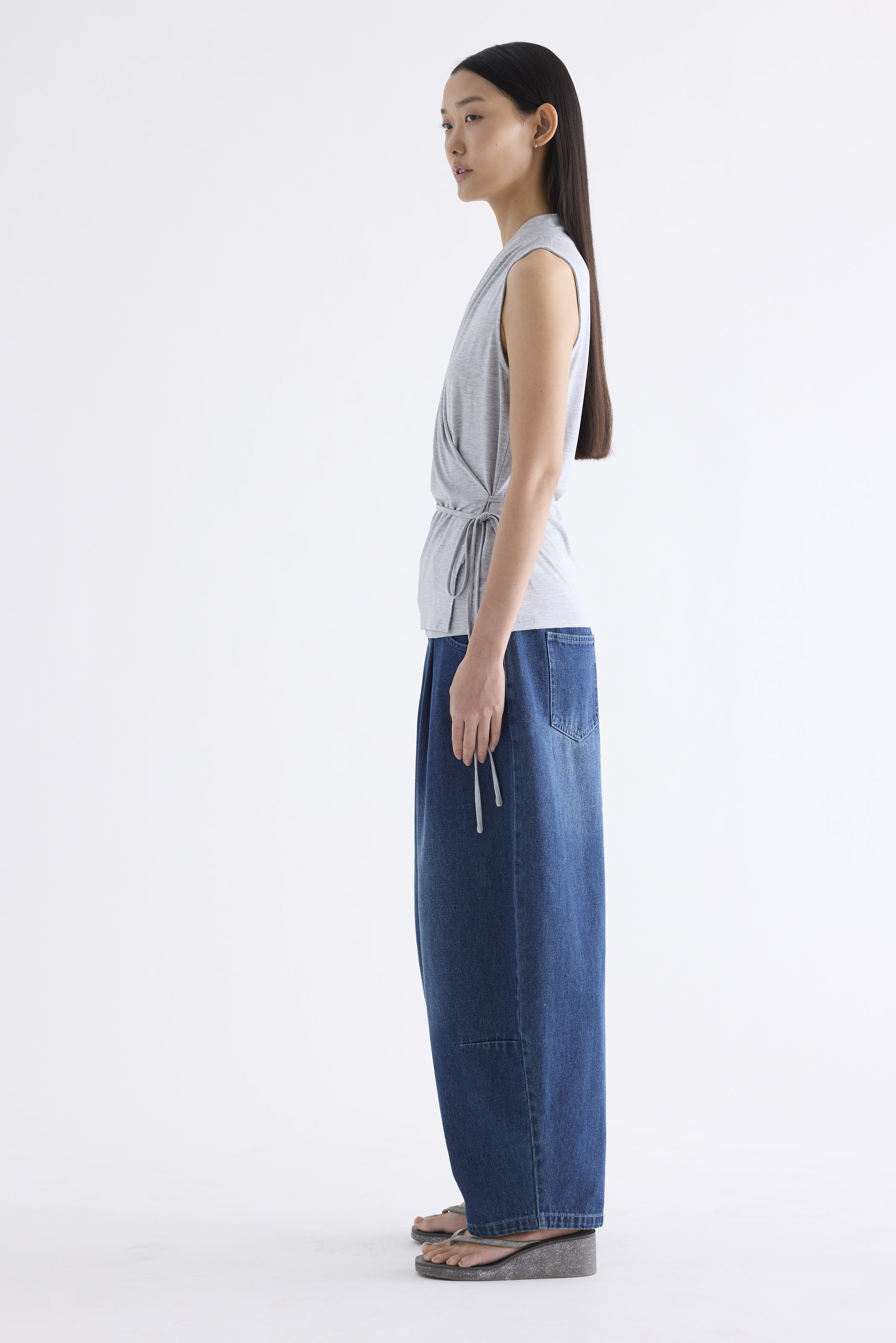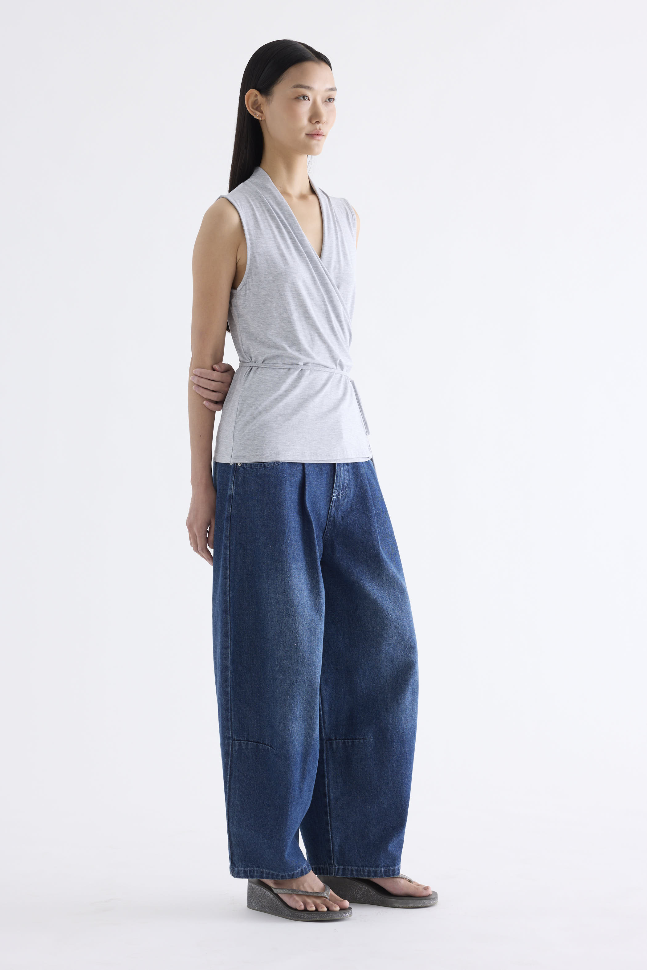 Fluid forms. Made from smooth and stretchy fabric, this sleeveless top features a wrapover neckline and waist tie-strap. Worn in a relaxed fit.